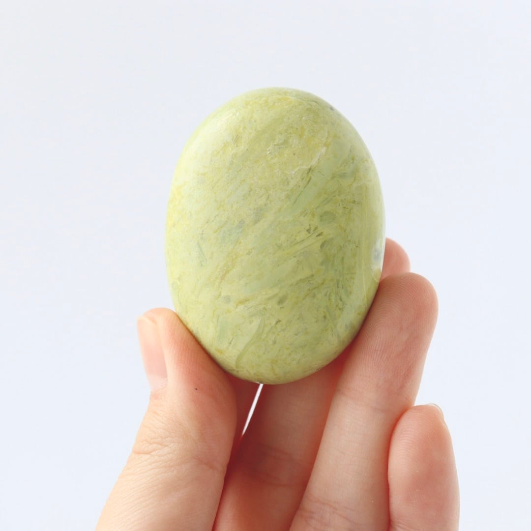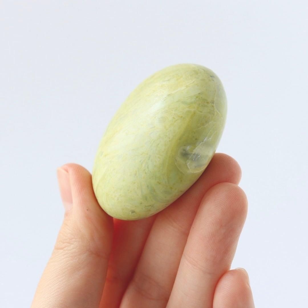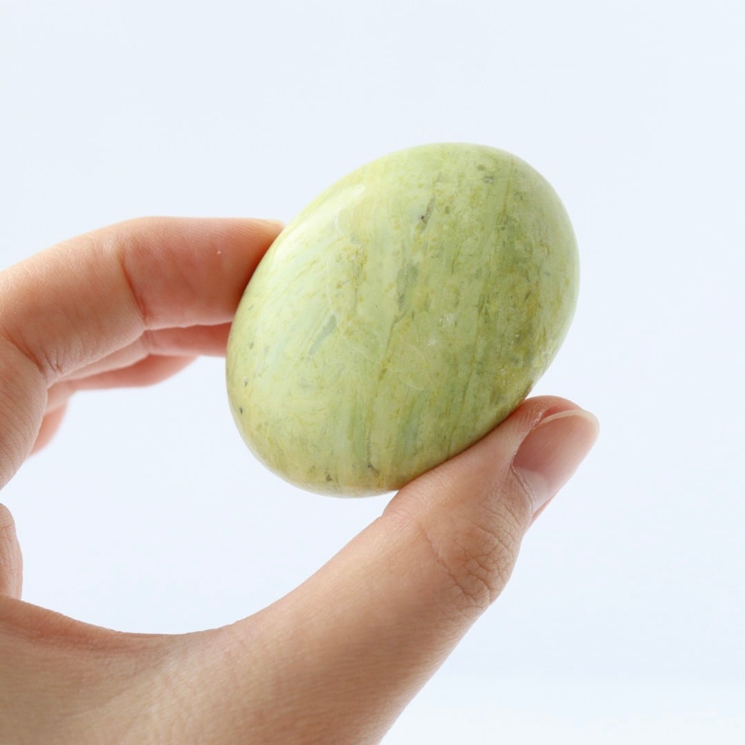 春の森に差し込む午後の日差しを閉じ込めたかのような、サーペンティンの握り石。