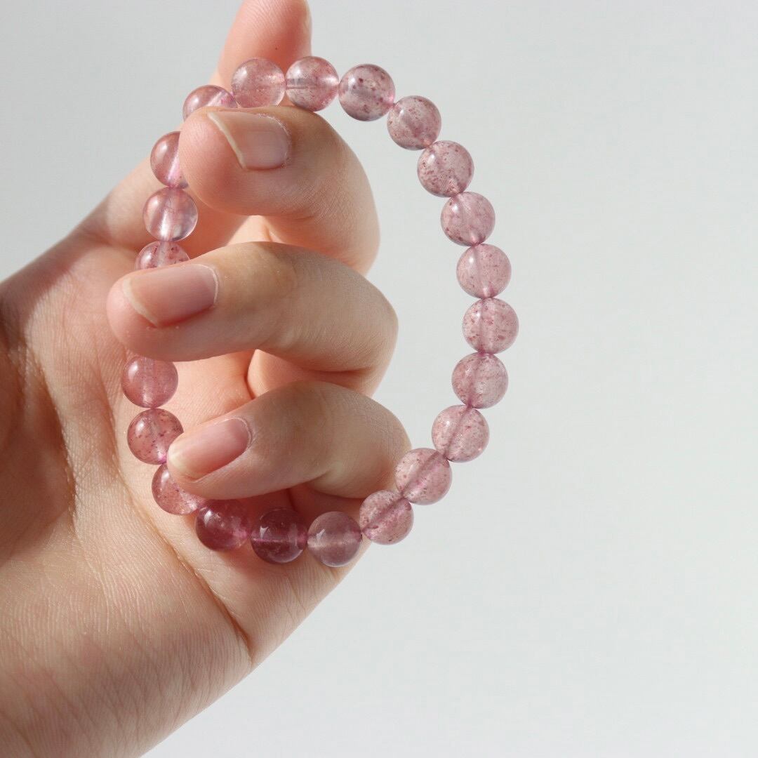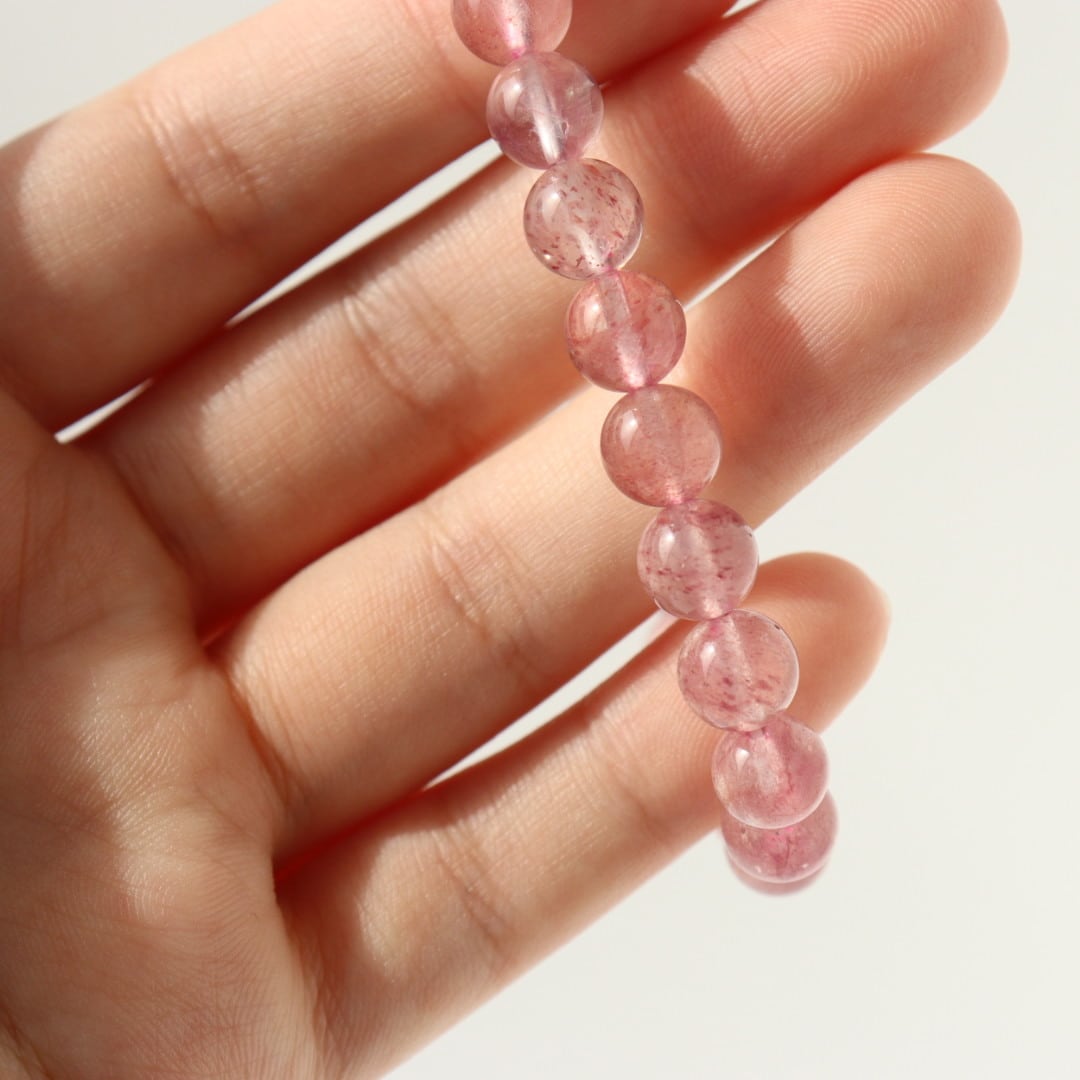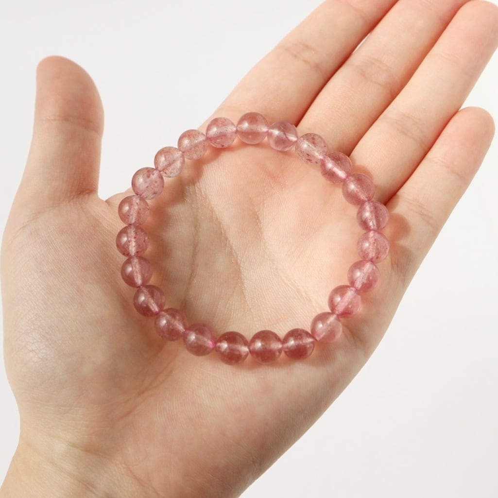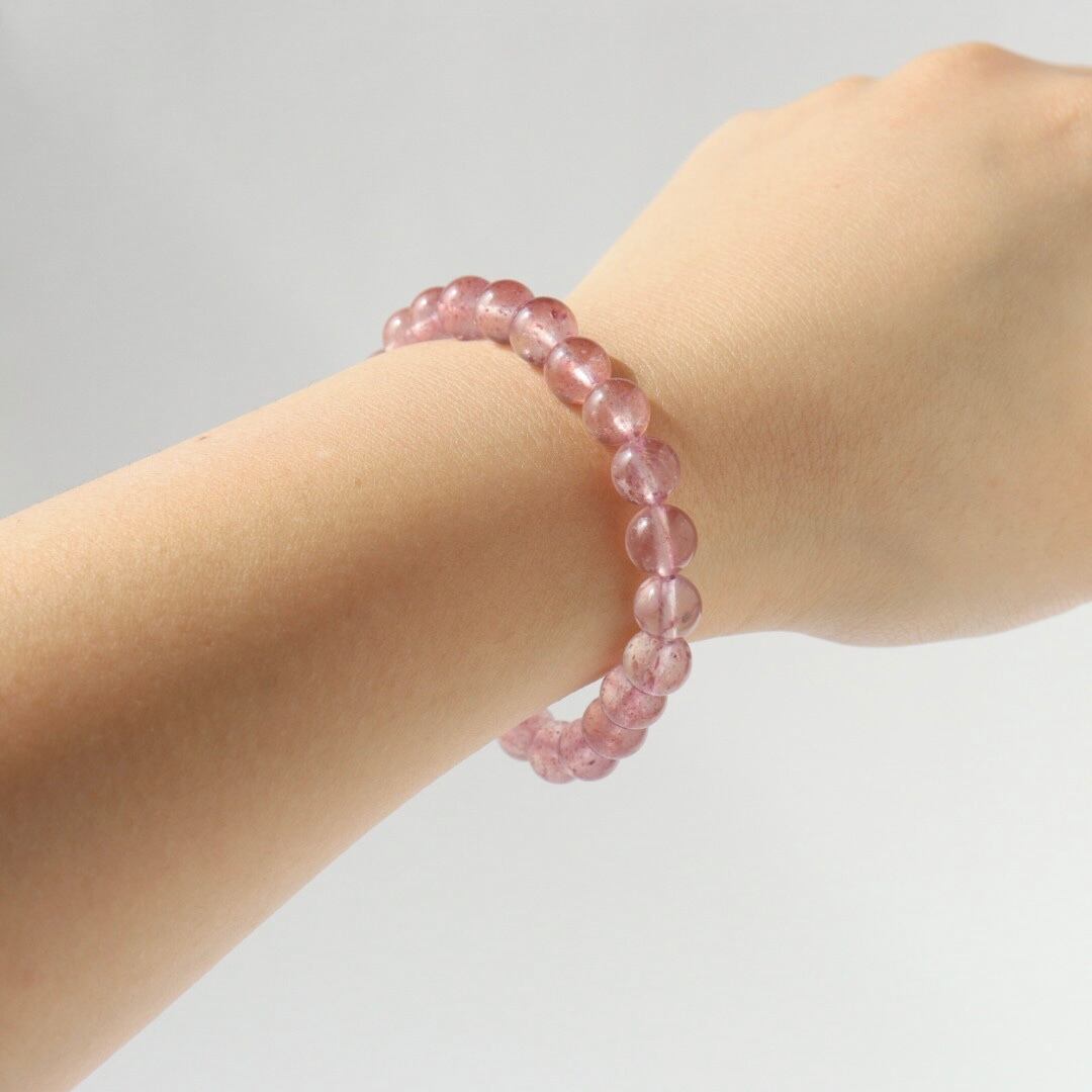 やわらかなピンクの中に、花びらが舞うような内包が広がるストロベリークォーツのブレスレット。