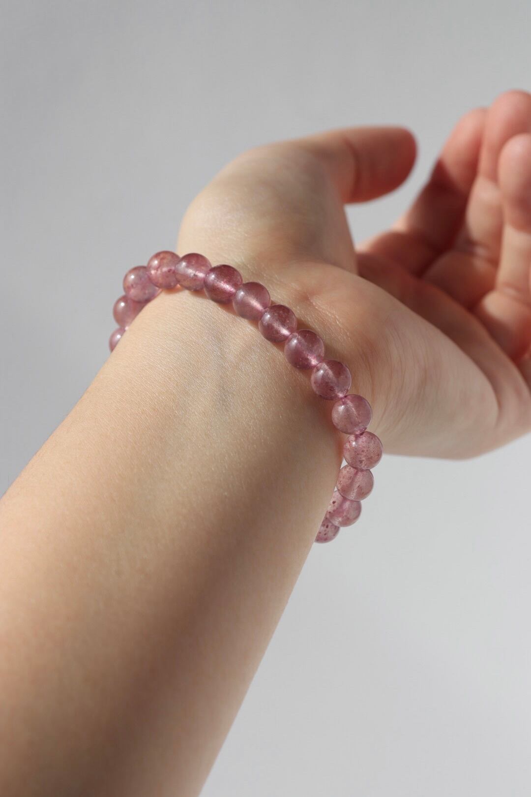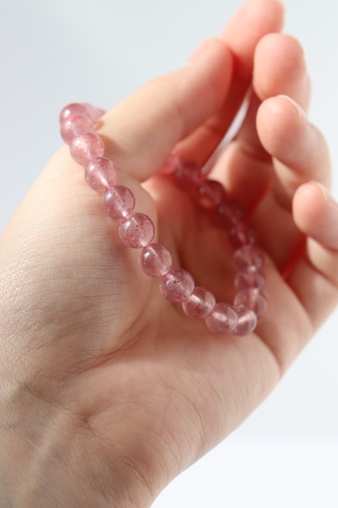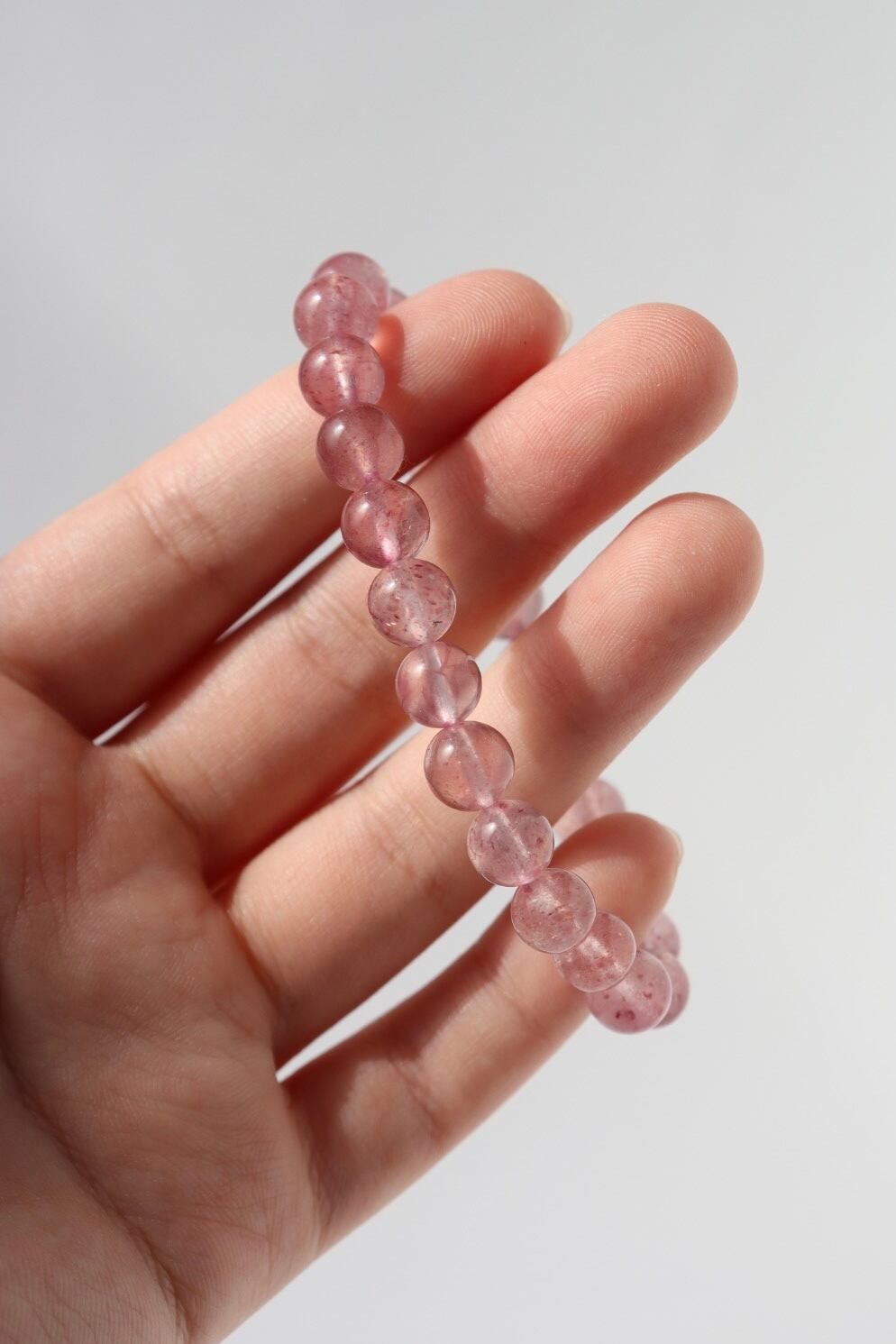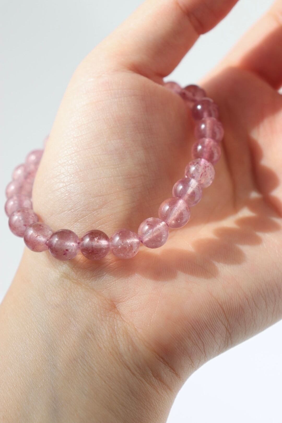 やわらかなピンクの中に、花びらが舞うような内包が広がるストロベリークォーツのブレスレット。