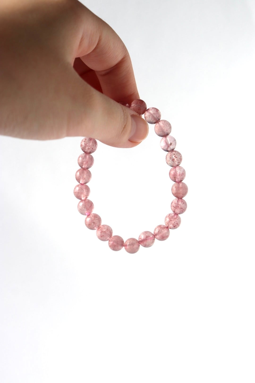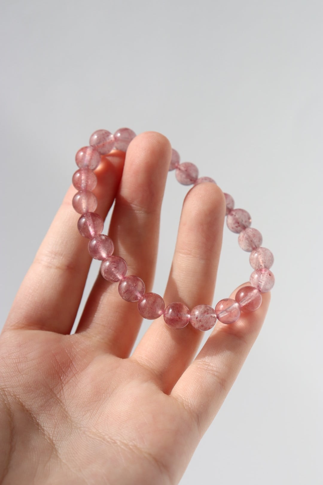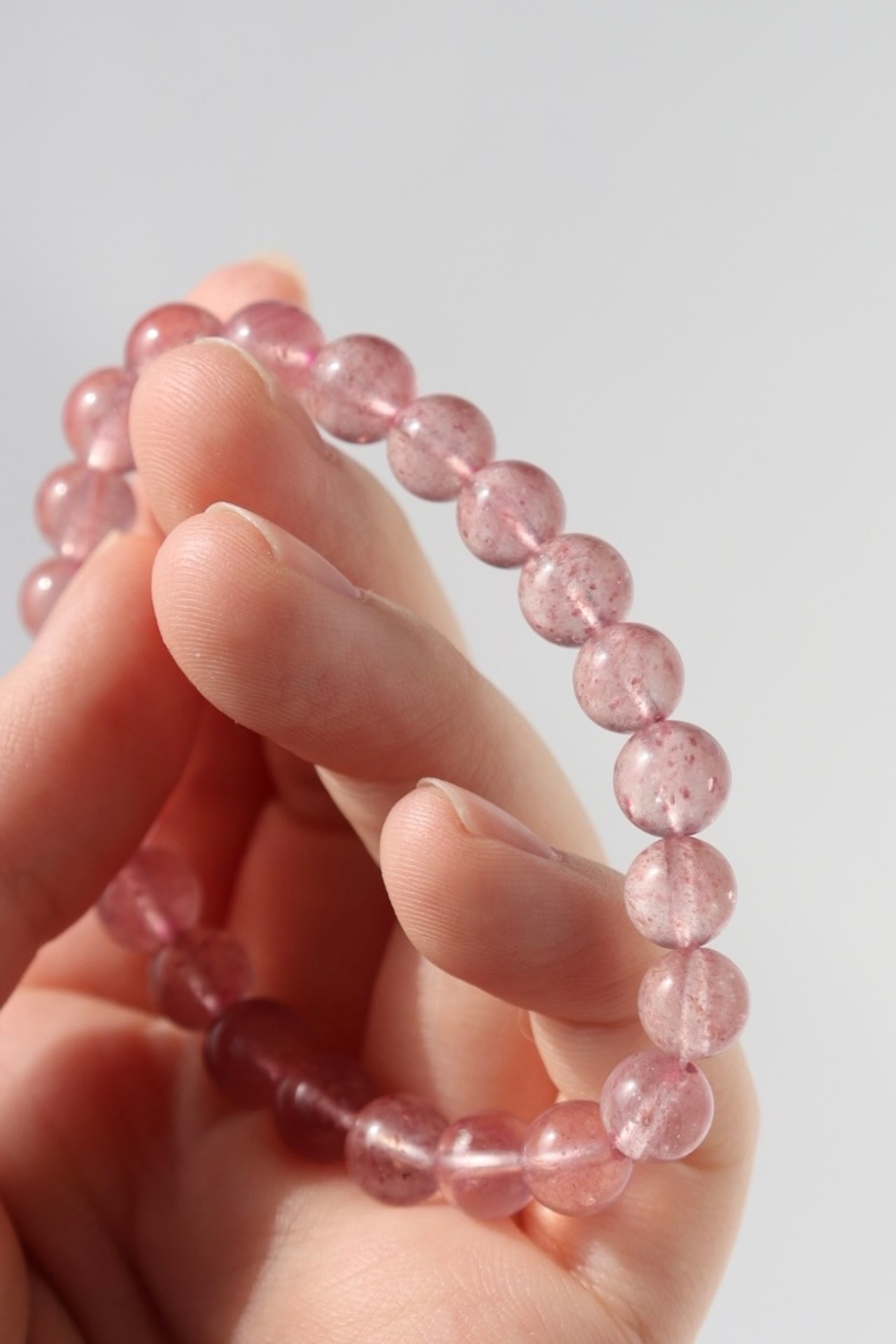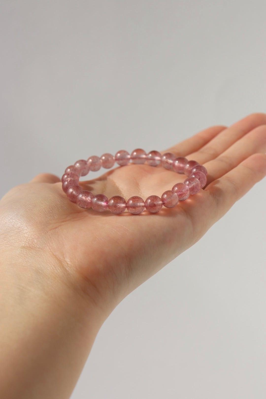 やわらかなピンクの中に、花びらが舞うような内包が広がるストロベリークォーツのブレスレット。
