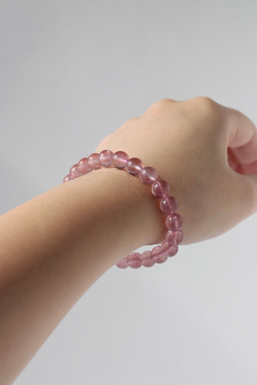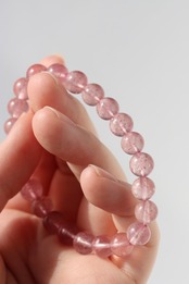 こちらは透明感のあるクォーツの中に、ピンクの内包物がふんわりと広がる美しいブレスレット。