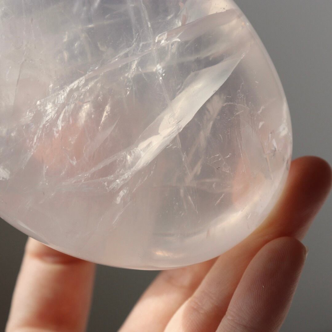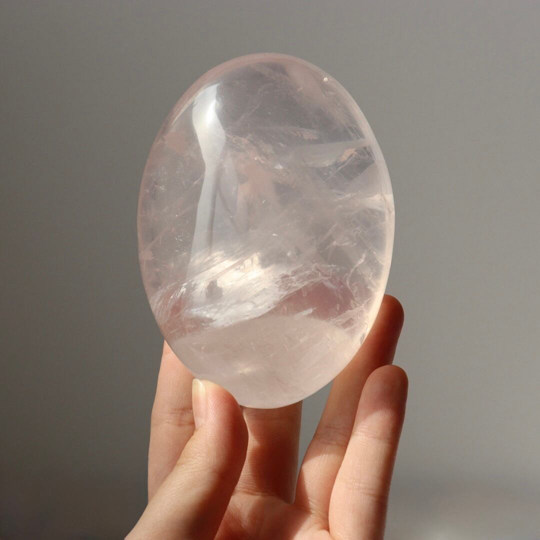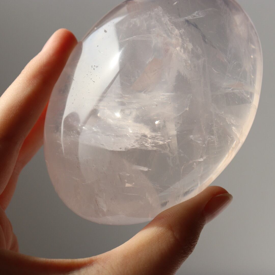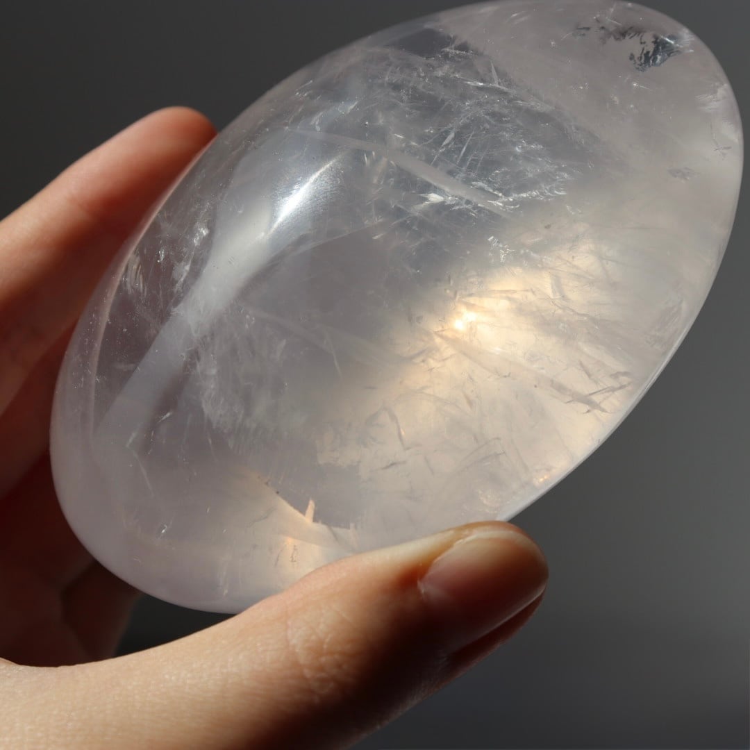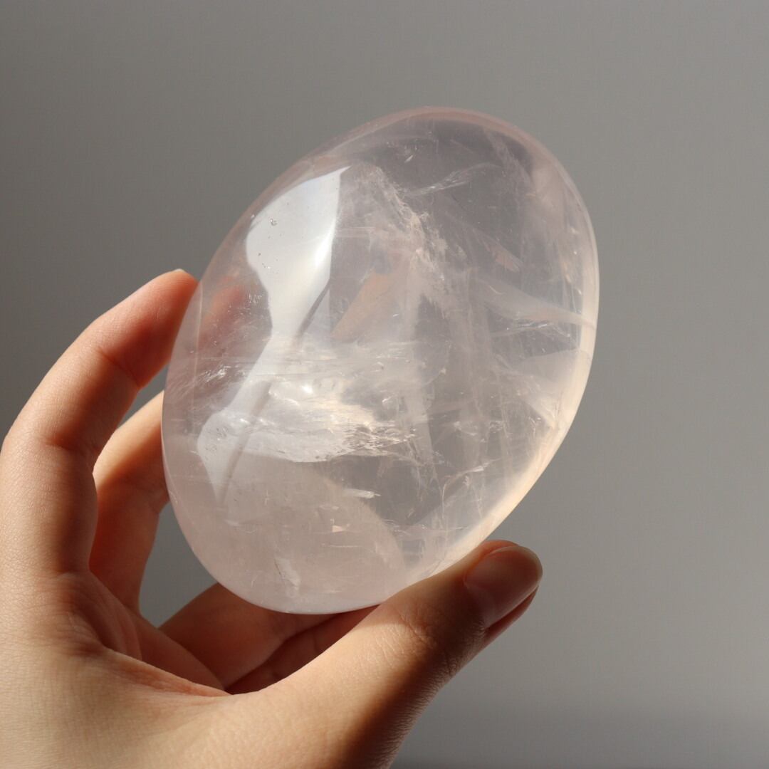 透き通る結晶が美しいアイスローズクォーツの握り石。