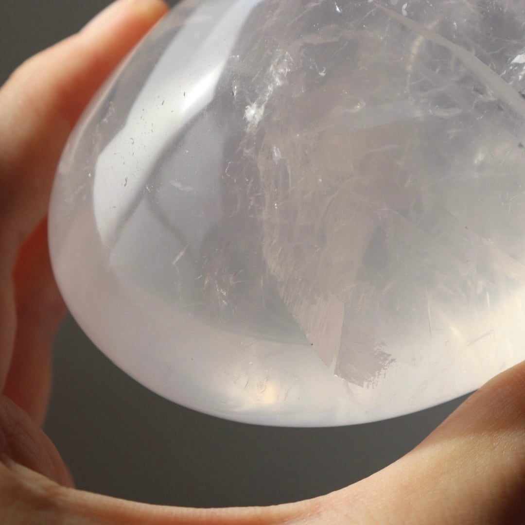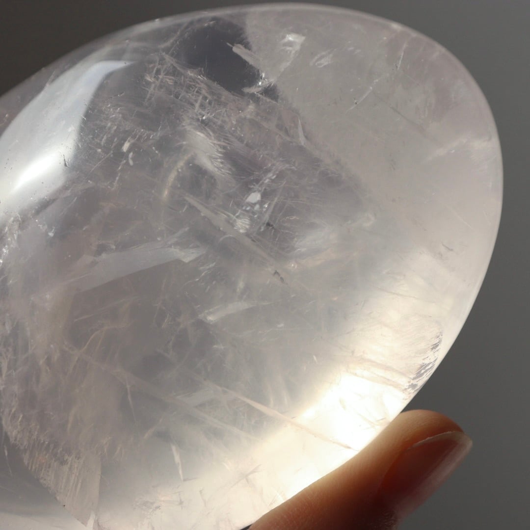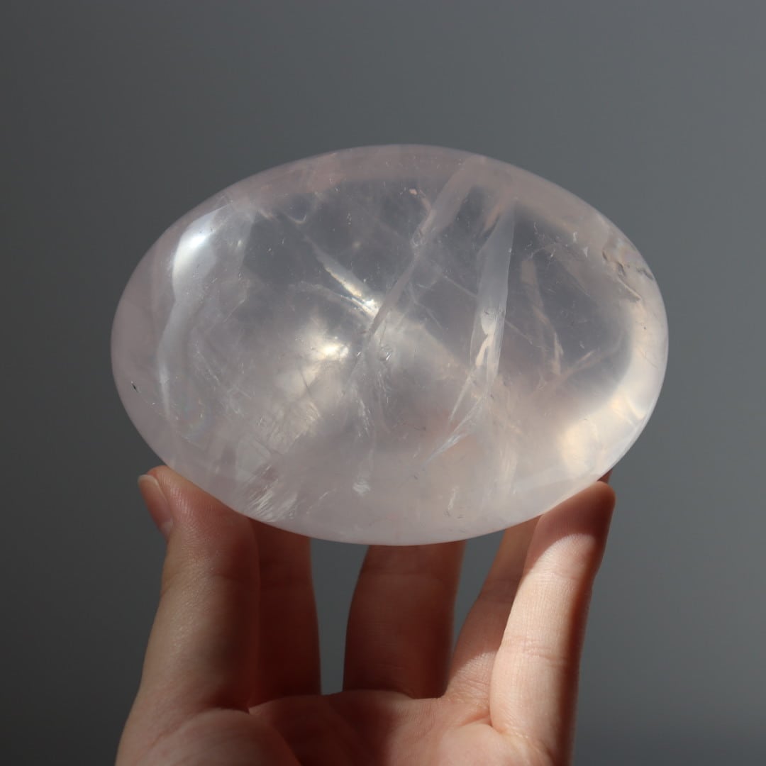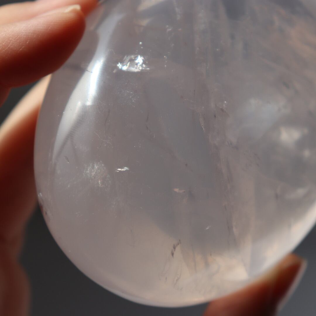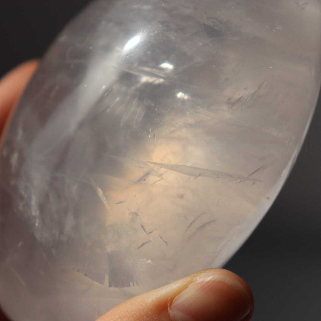 透き通る結晶が美しいアイスローズクォーツの握り石。