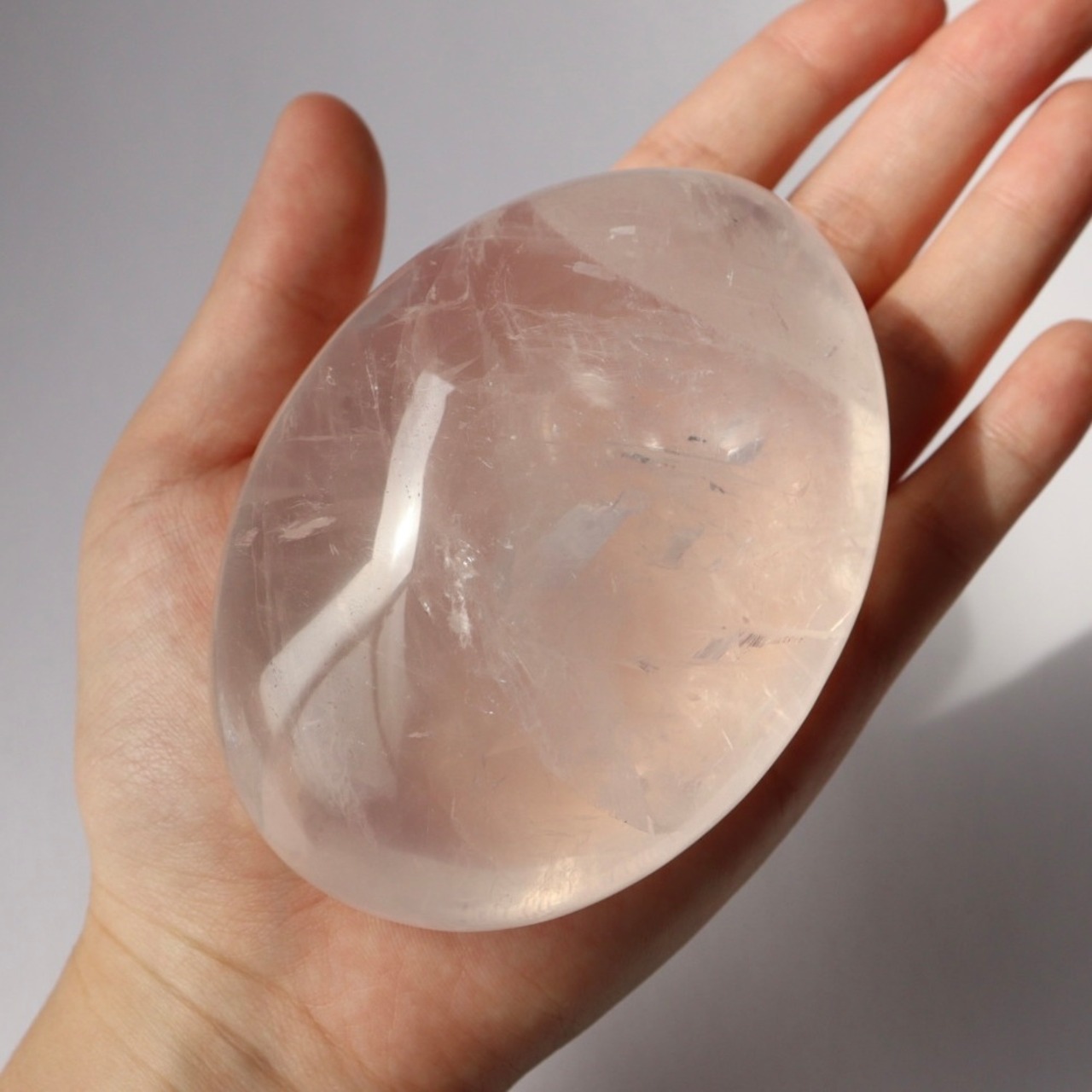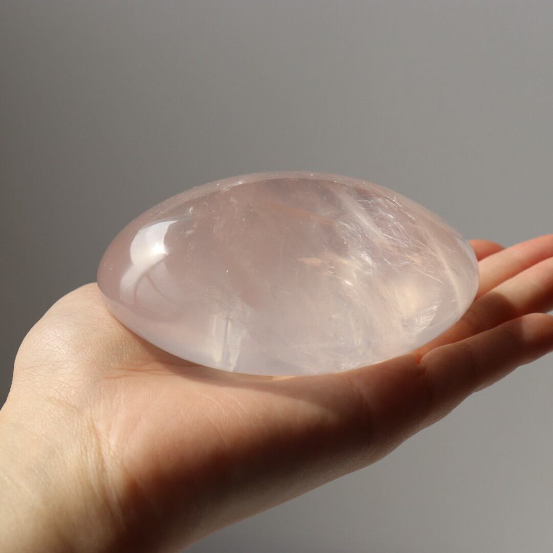 こちらは、水面に浮かぶ桜の花びらのような淡いピンクをもつ、大きな大きなローズクォーツの握り石。
