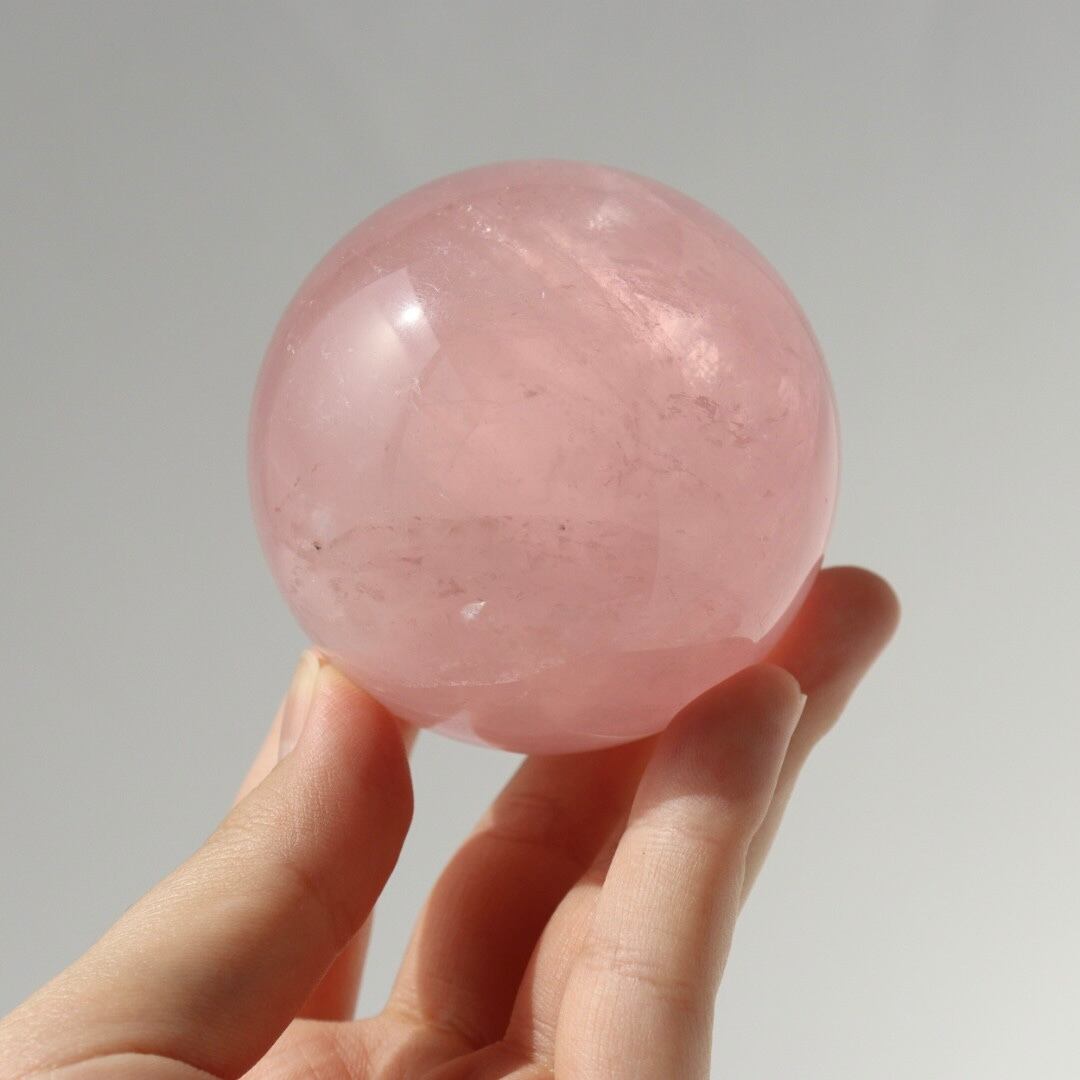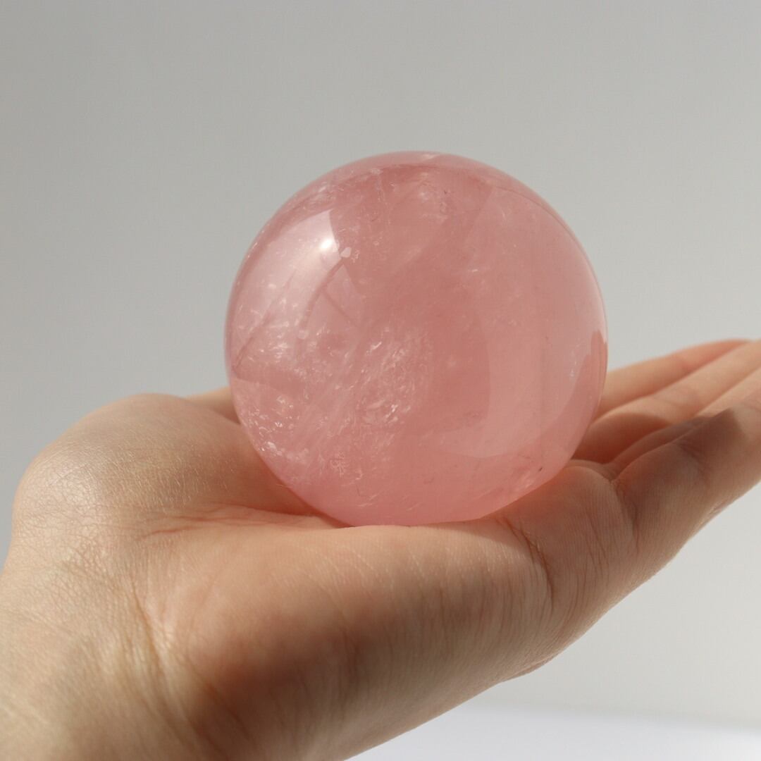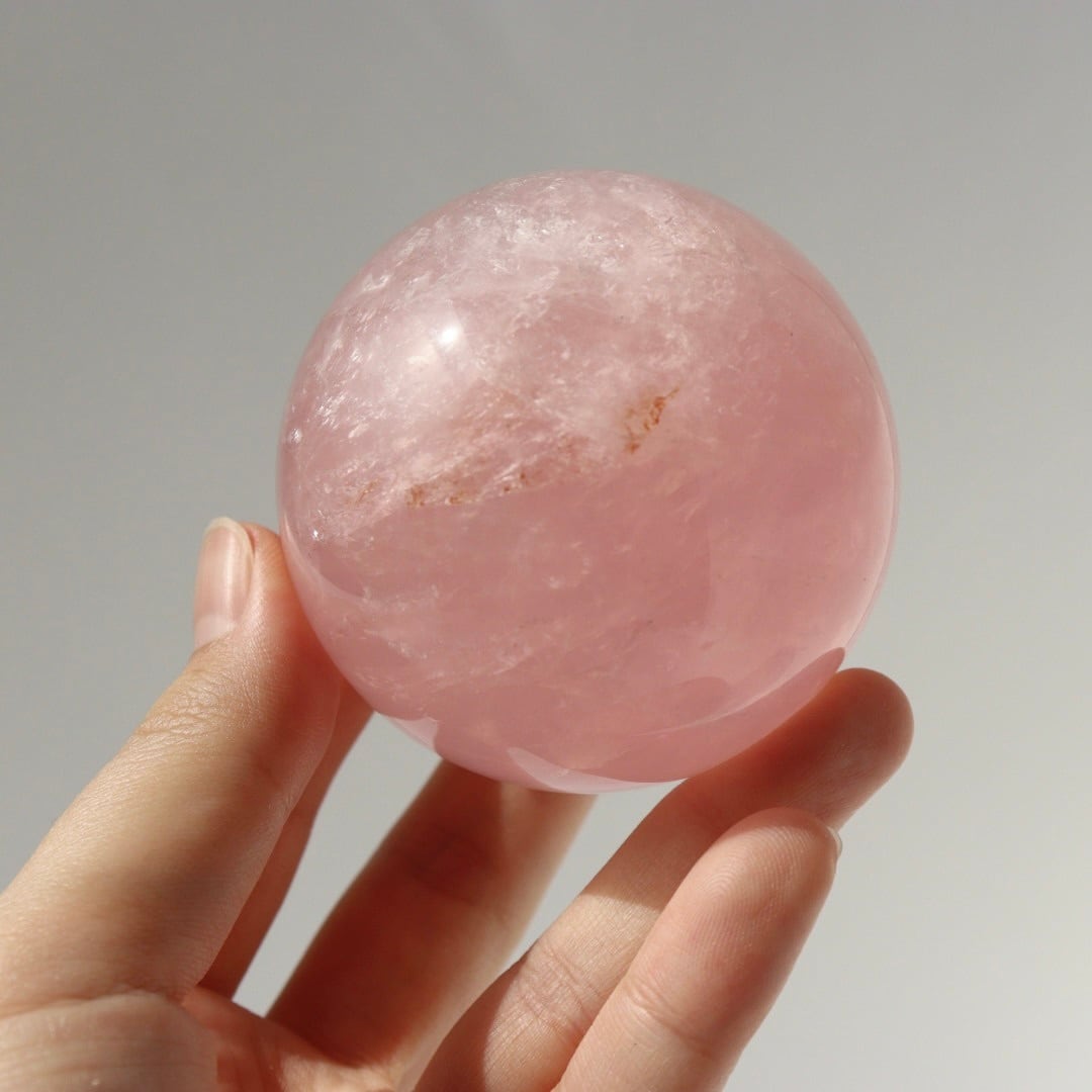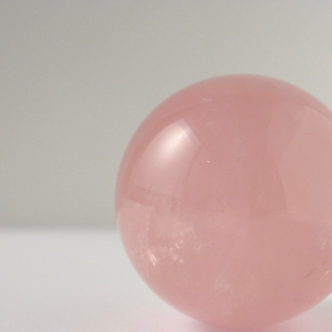 こちらは、明るいローズピンクが美しいローズクォーツのスフィア。
