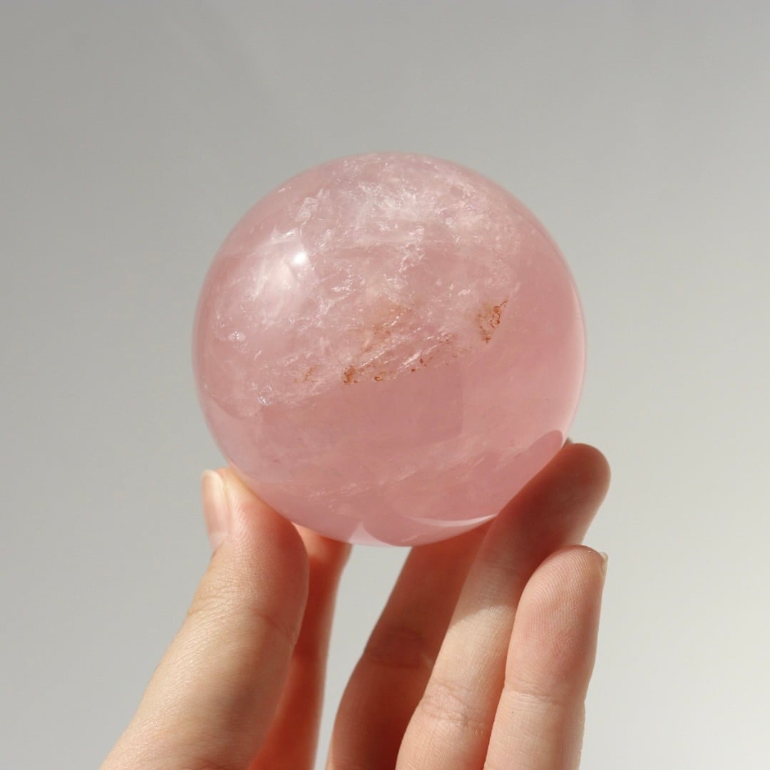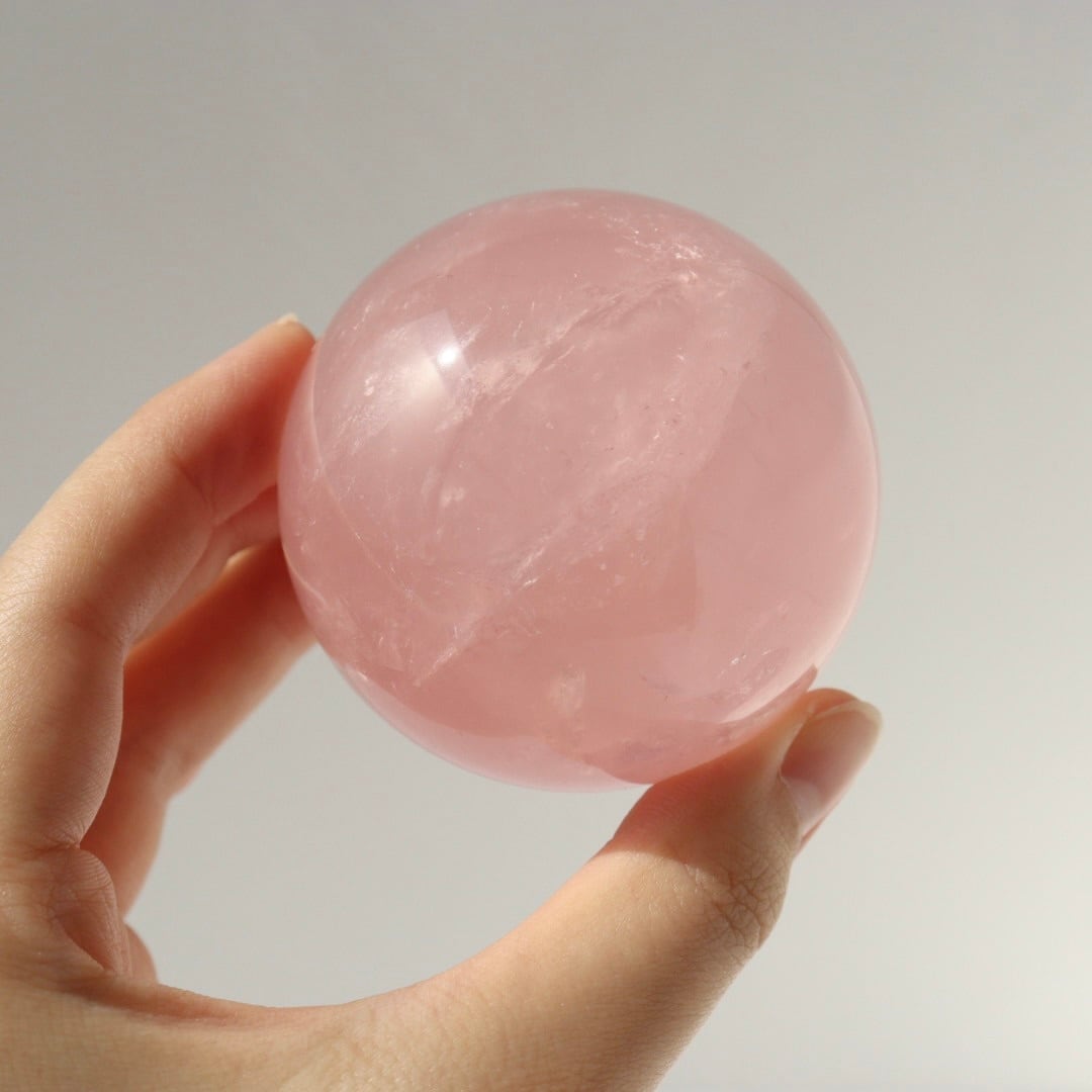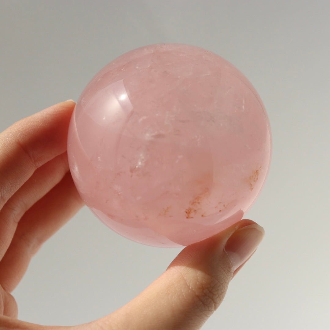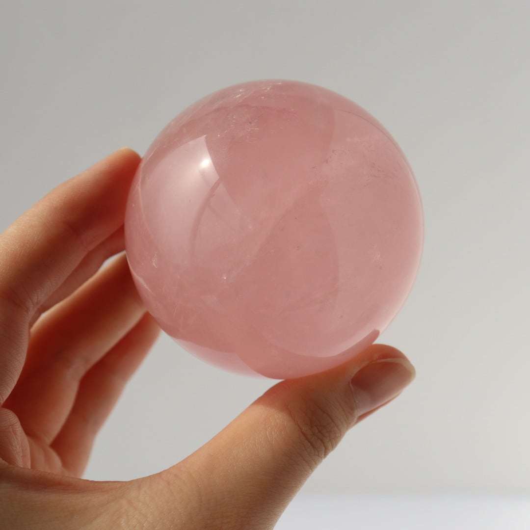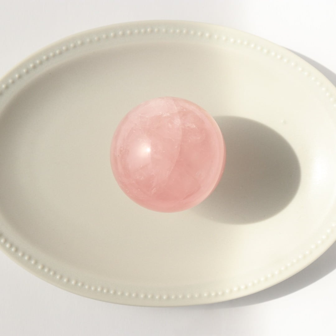 こちらは、明るいローズピンクが美しいローズクォーツのスフィア。