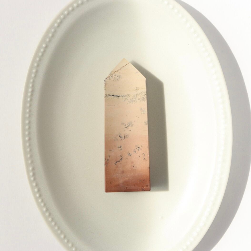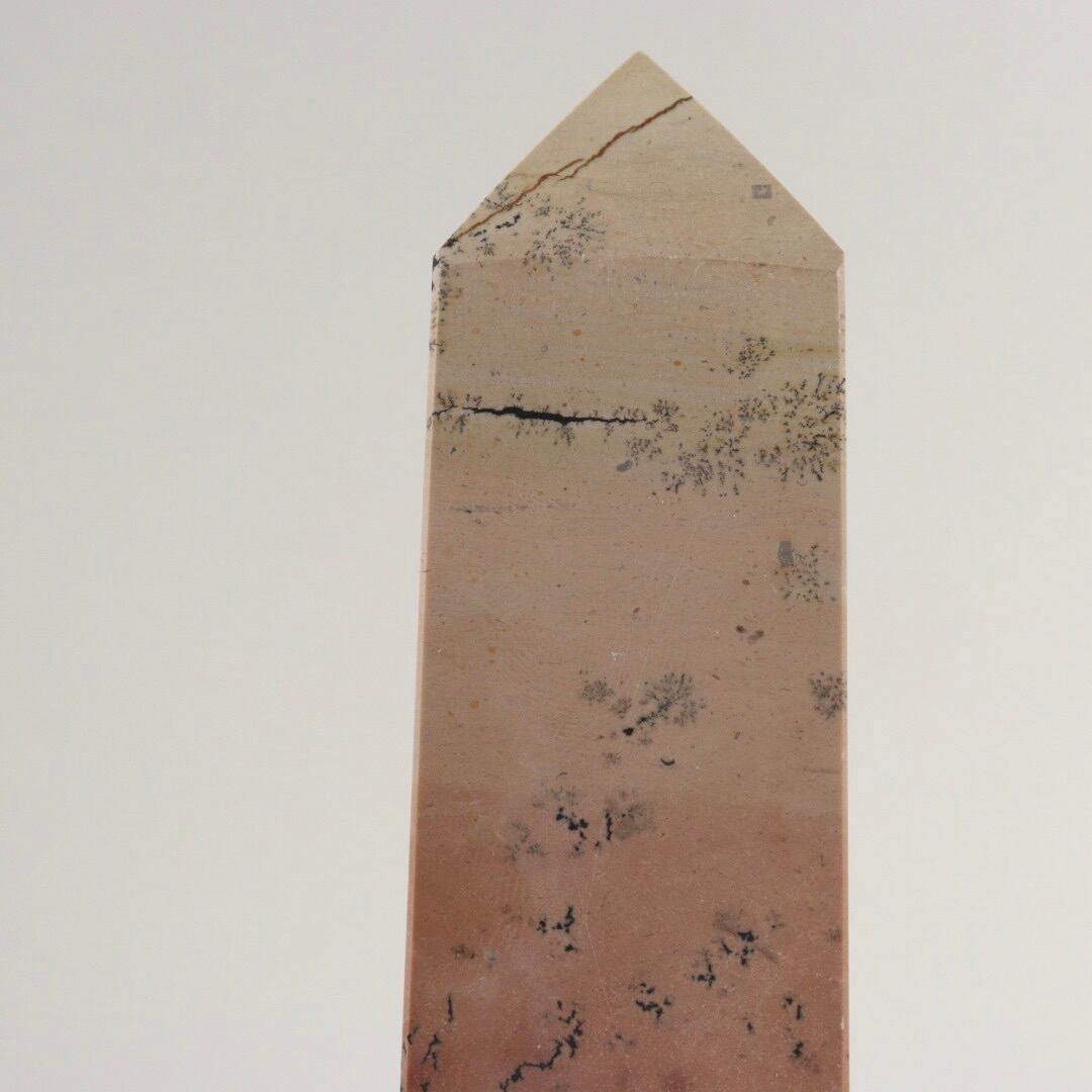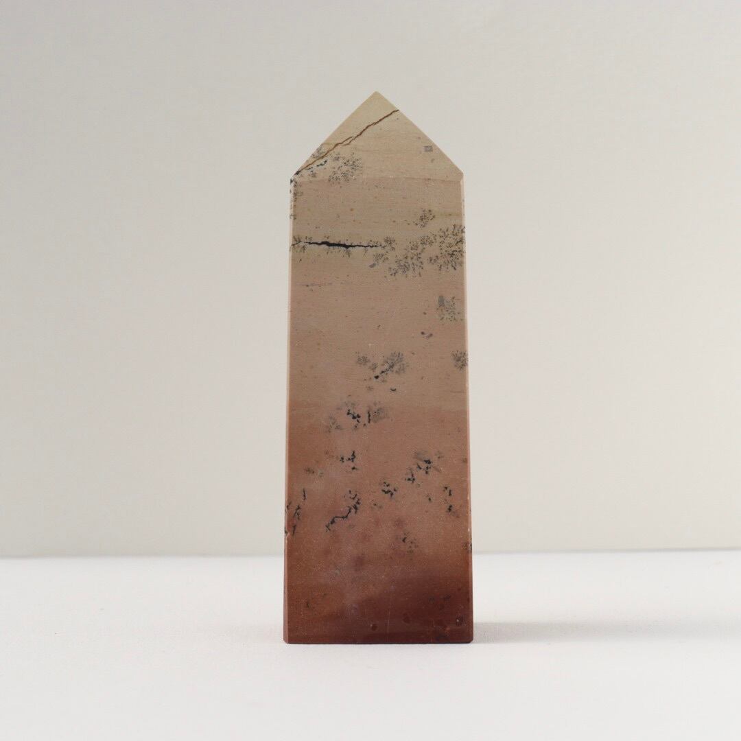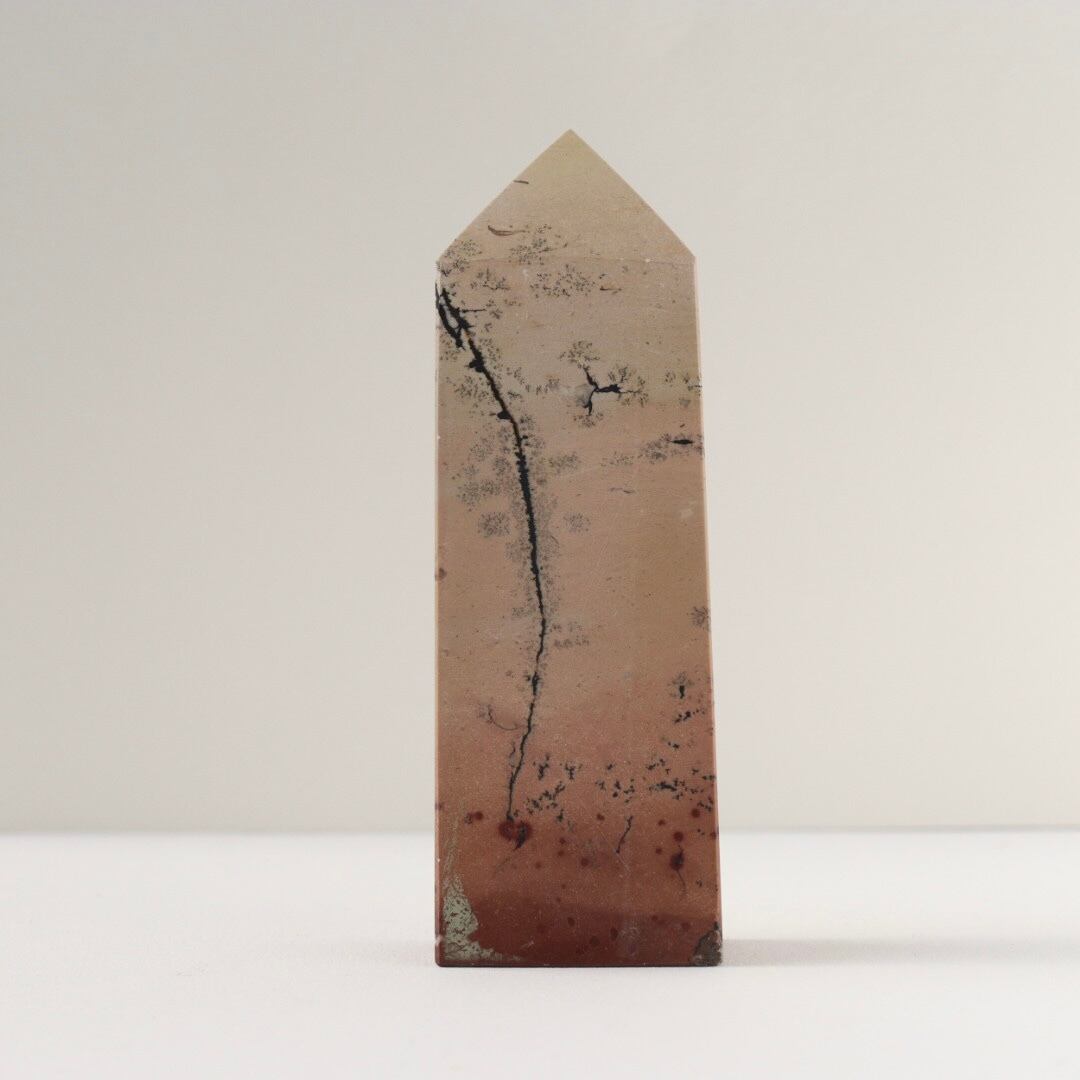 ピンクブラウンのグラデーションと植物の影のような模様が広がる、ピクチャージャスパーのタワー。