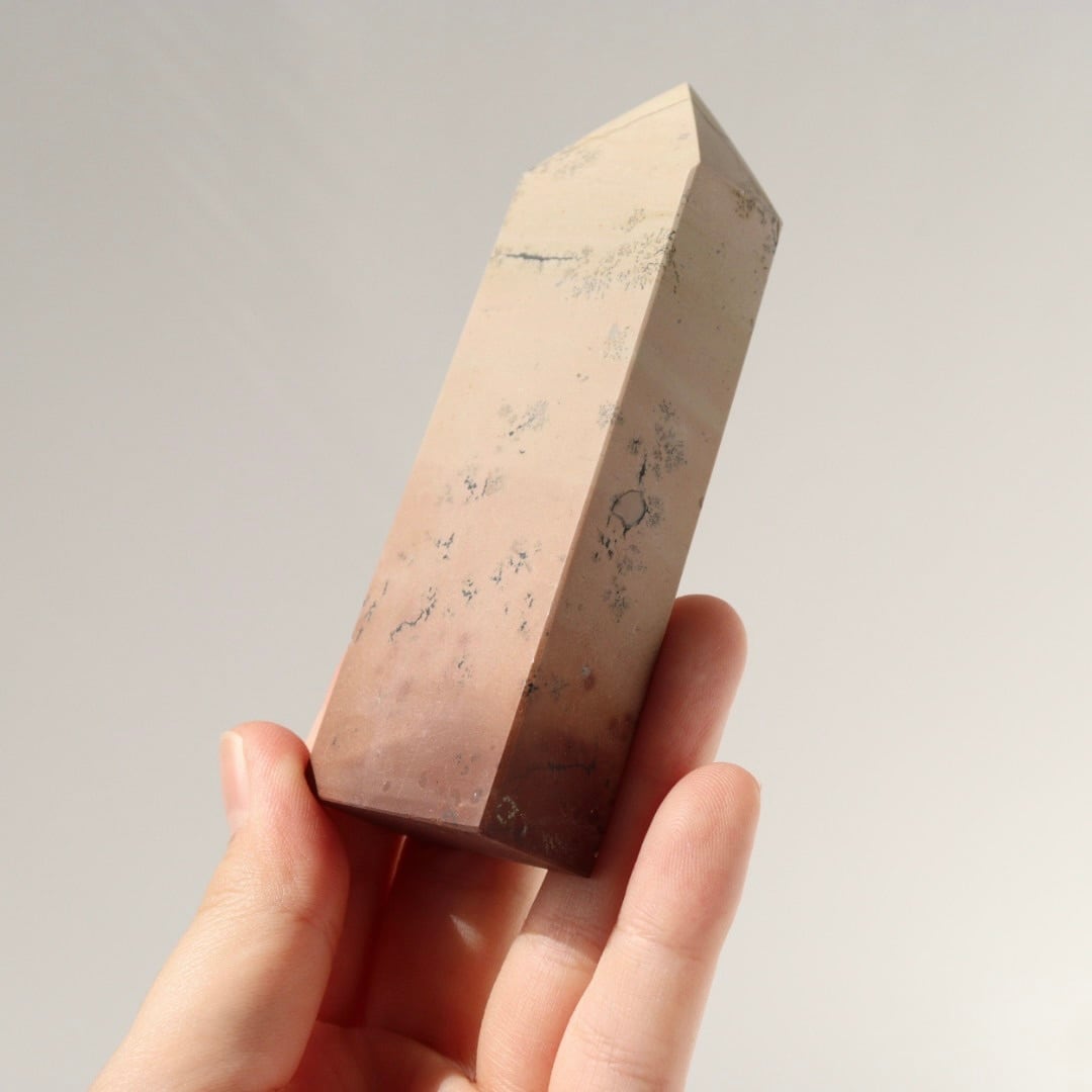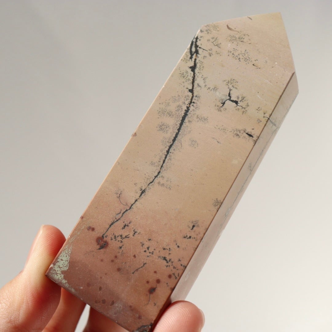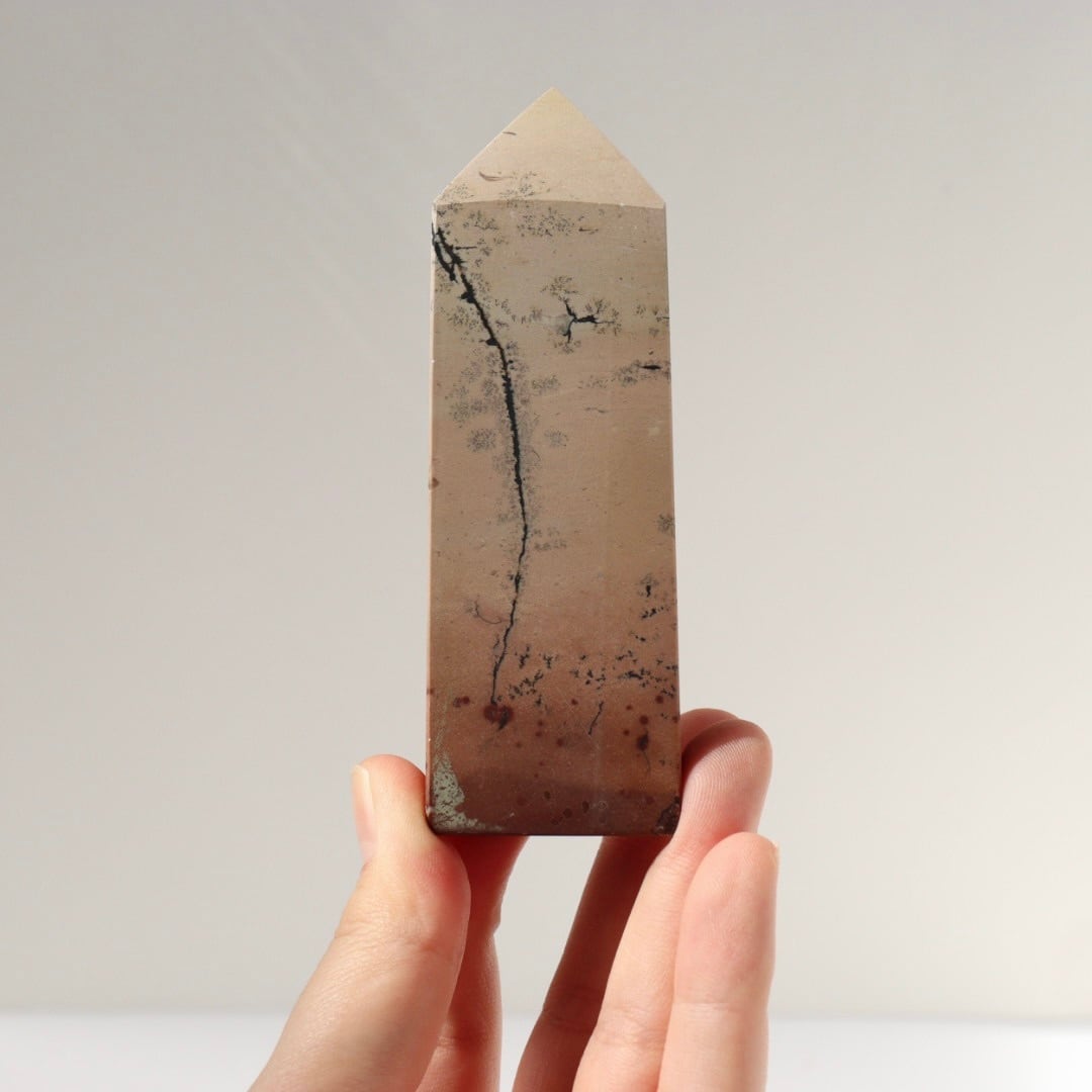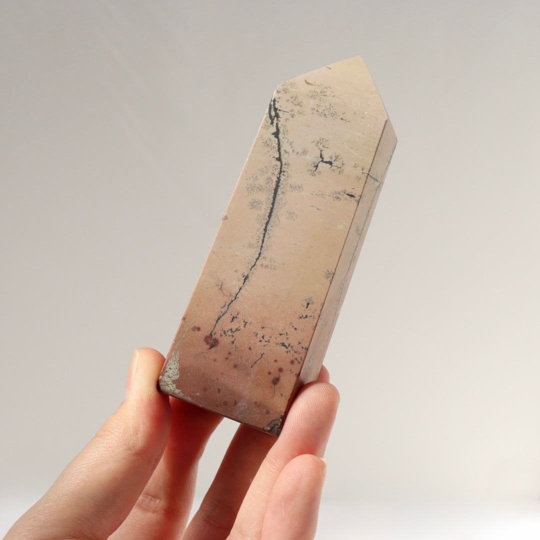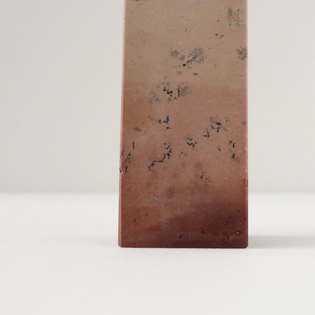 ピンクブラウンのグラデーションと植物の影のような模様が広がる、ピクチャージャスパーのタワー。