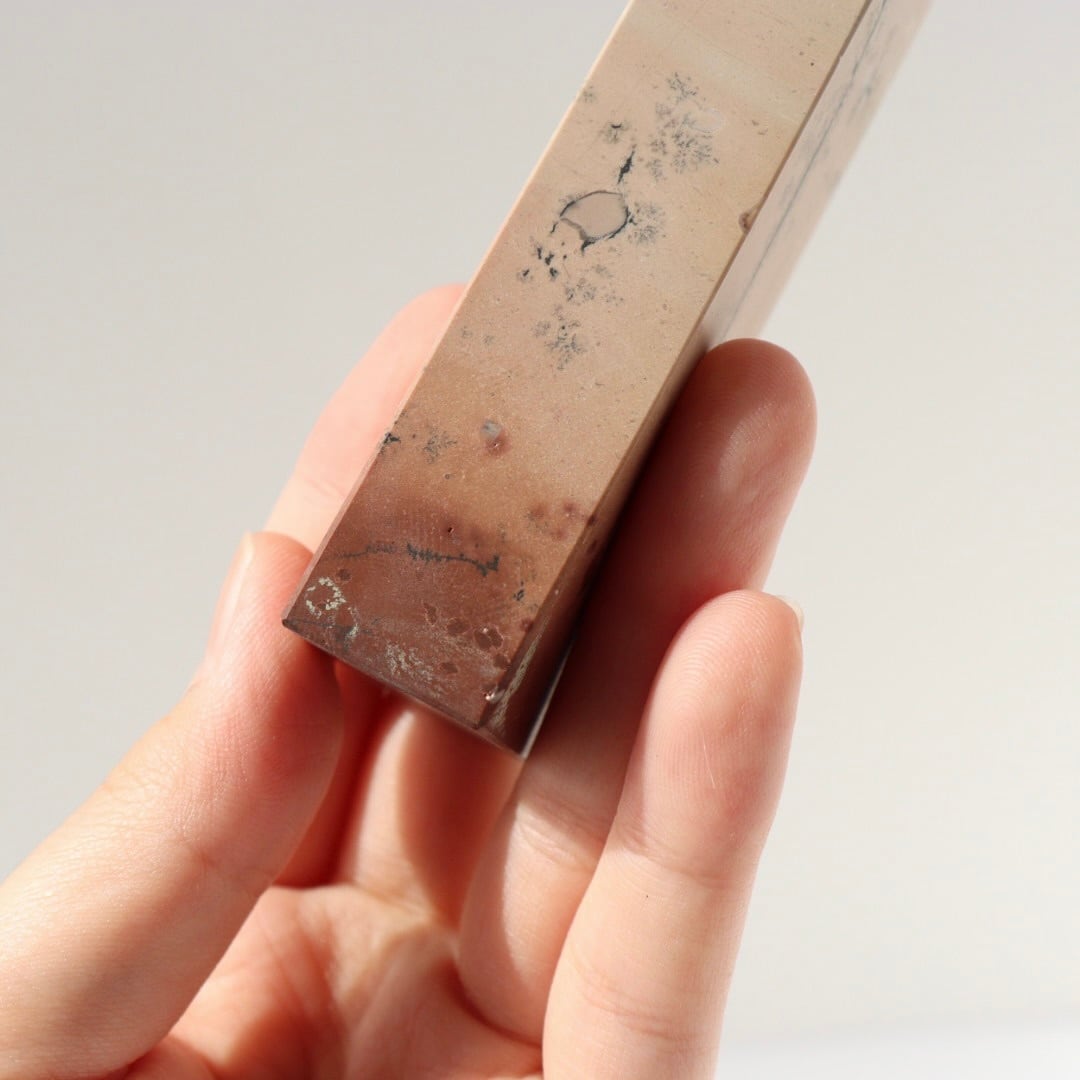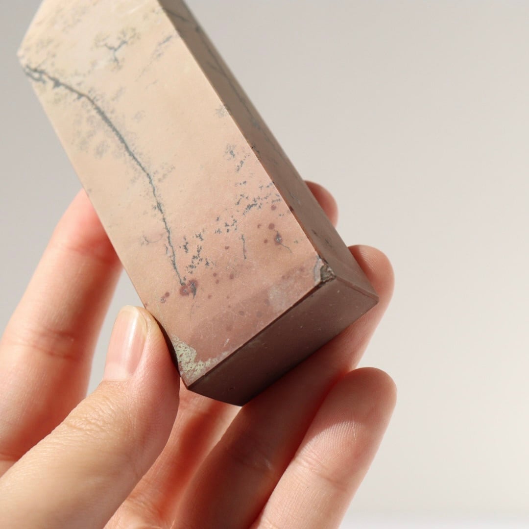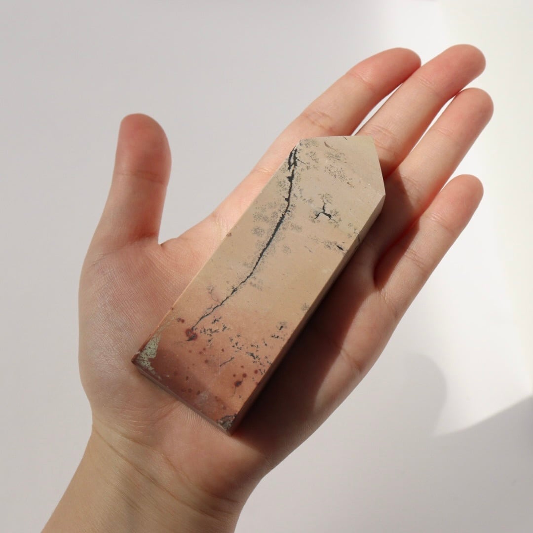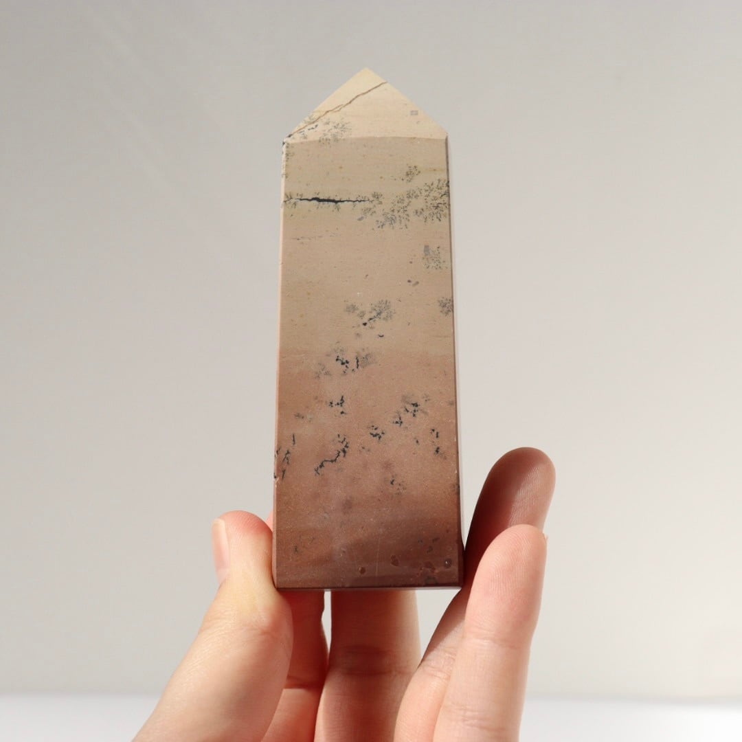 ピンクブラウンのグラデーションと植物の影のような模様が広がる、ピクチャージャスパーのタワー。