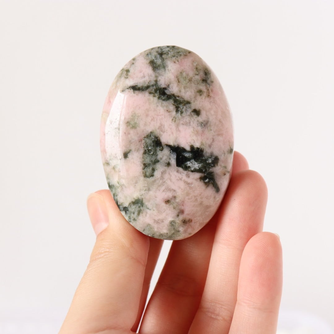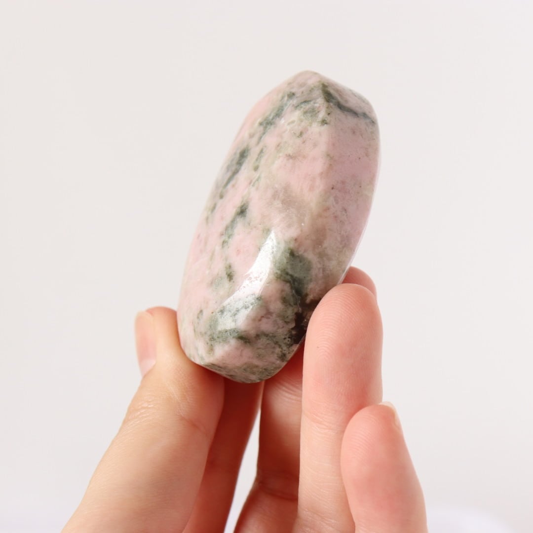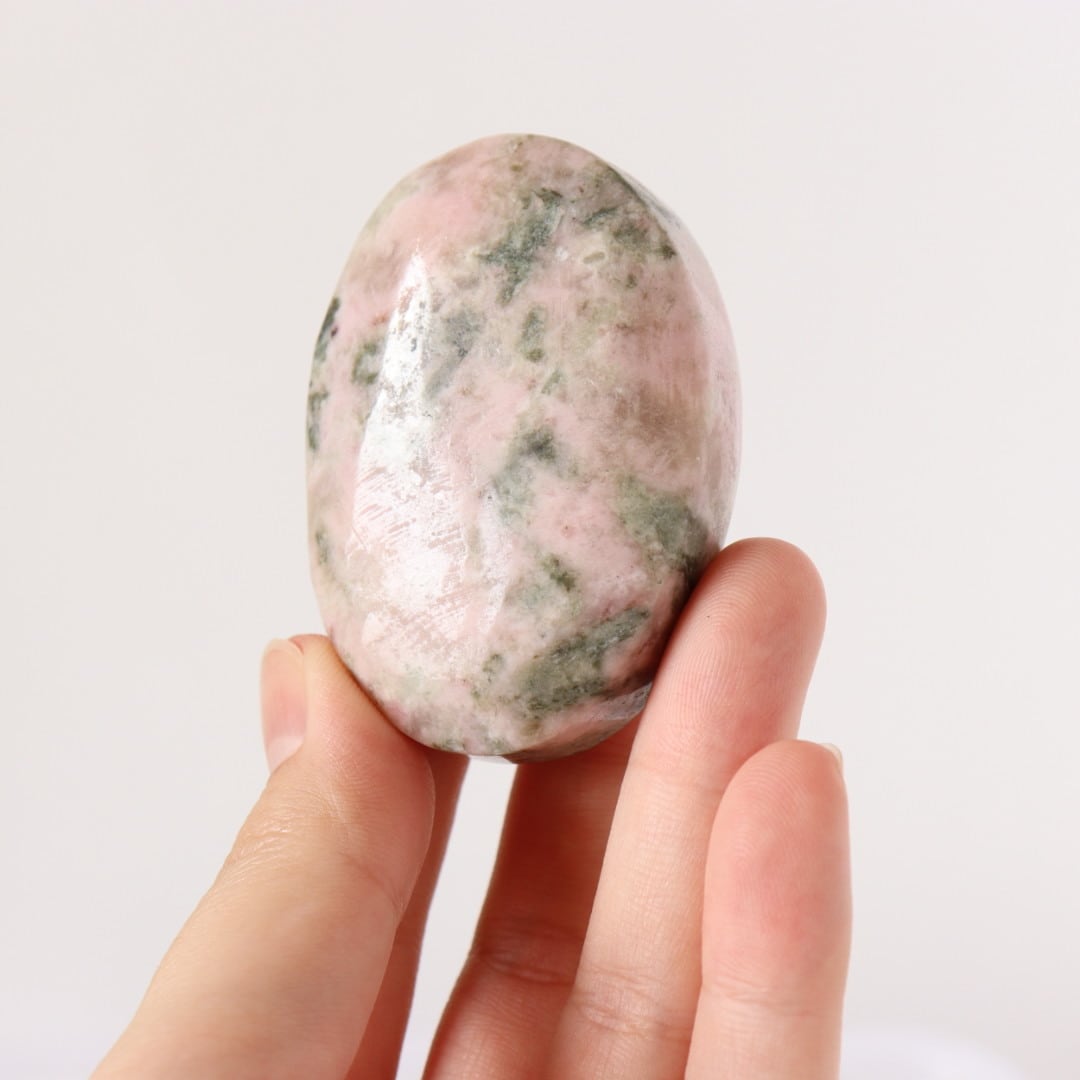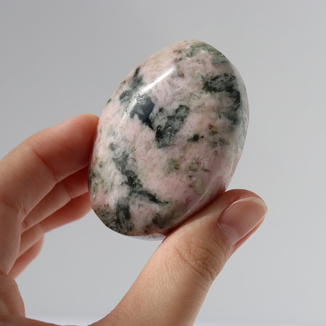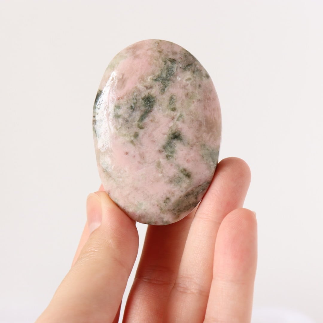 柔らかな淡いピンクのロードナイトに、落ち着いたグレイッシュグリーンのグリーントルマリンが溶け込むように入り込んだ、穏やかで優しい表情の握り石。