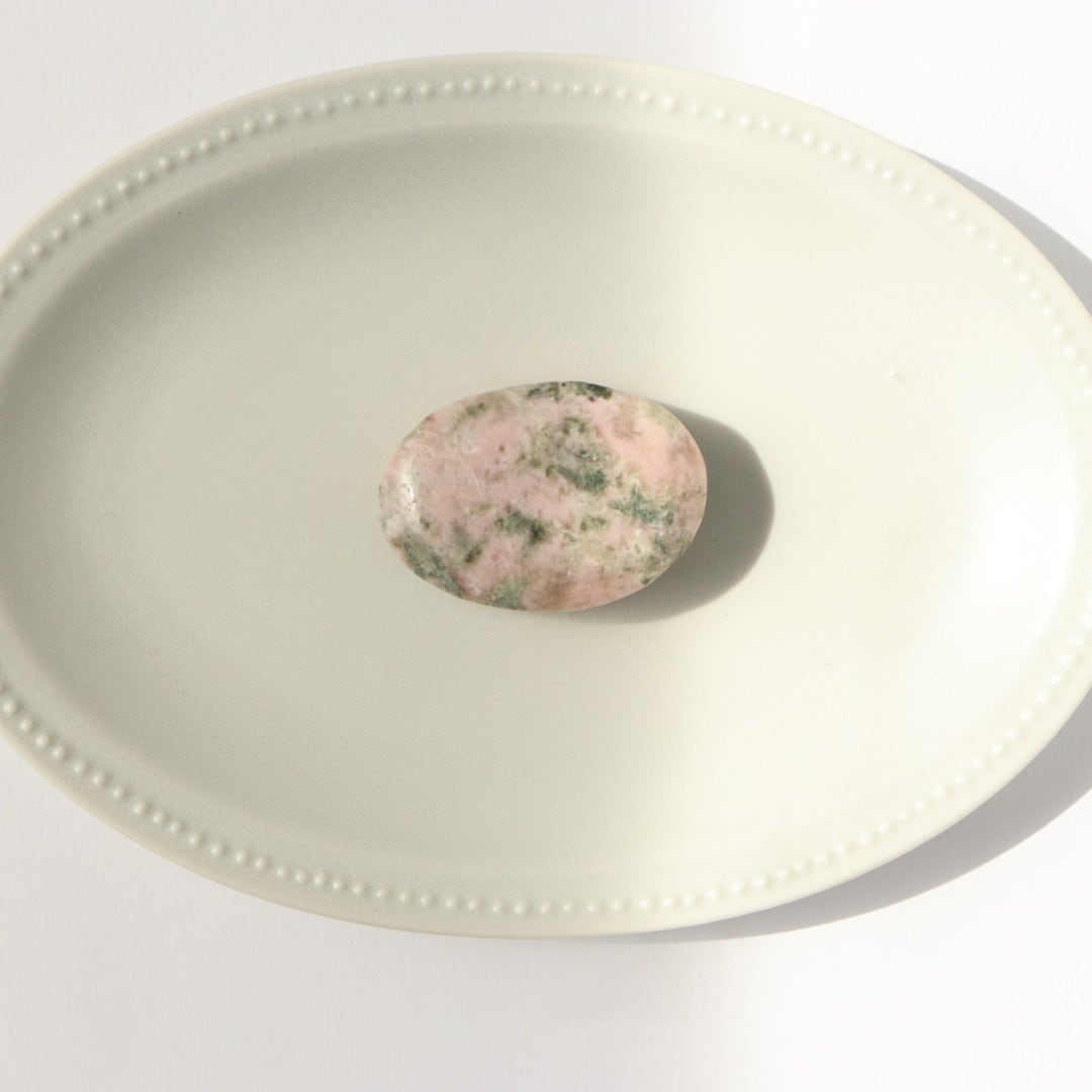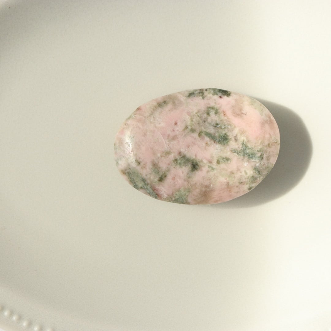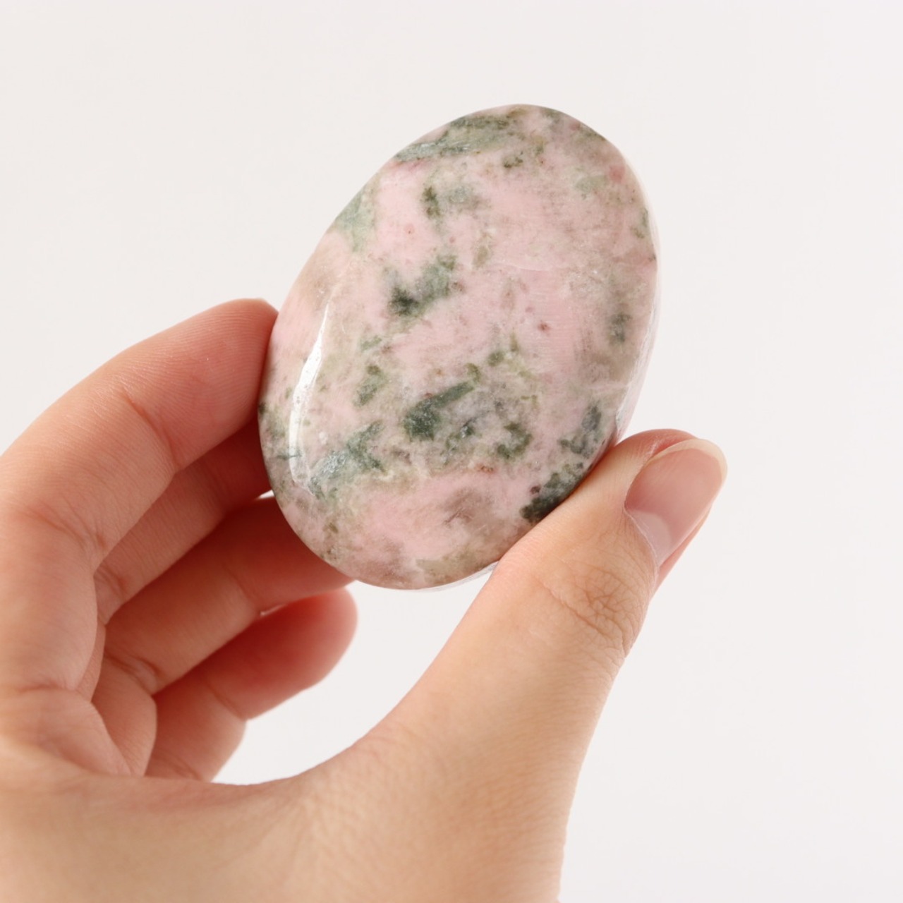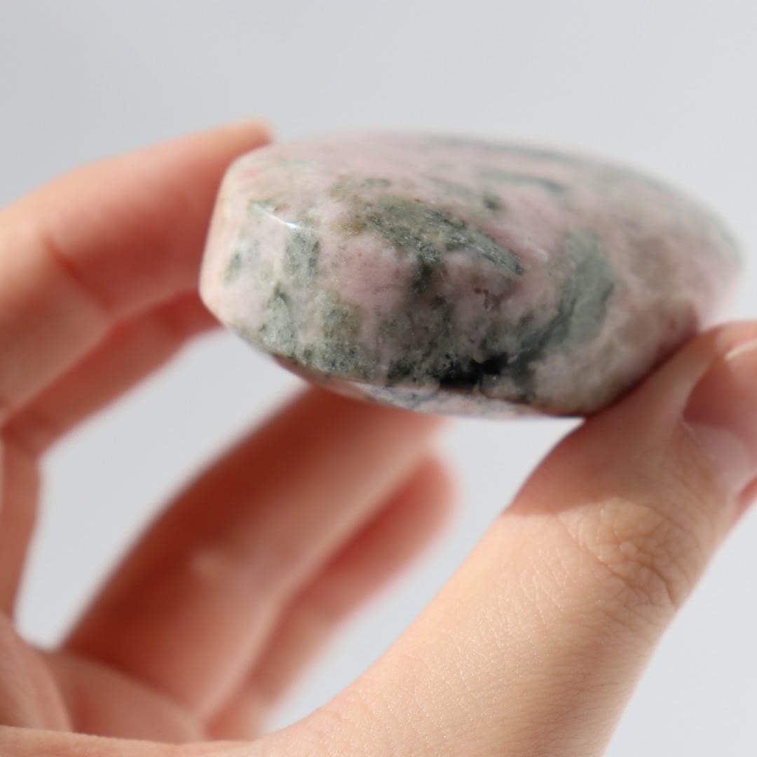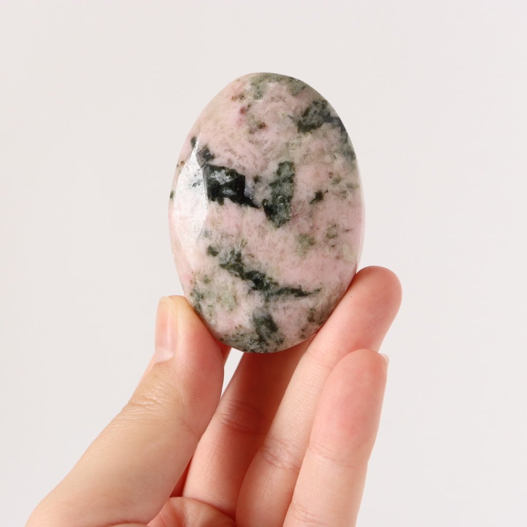 柔らかな淡いピンクのロードナイトに、落ち着いたグレイッシュグリーンのグリーントルマリンが溶け込むように入り込んだ、穏やかで優しい表情の握り石。