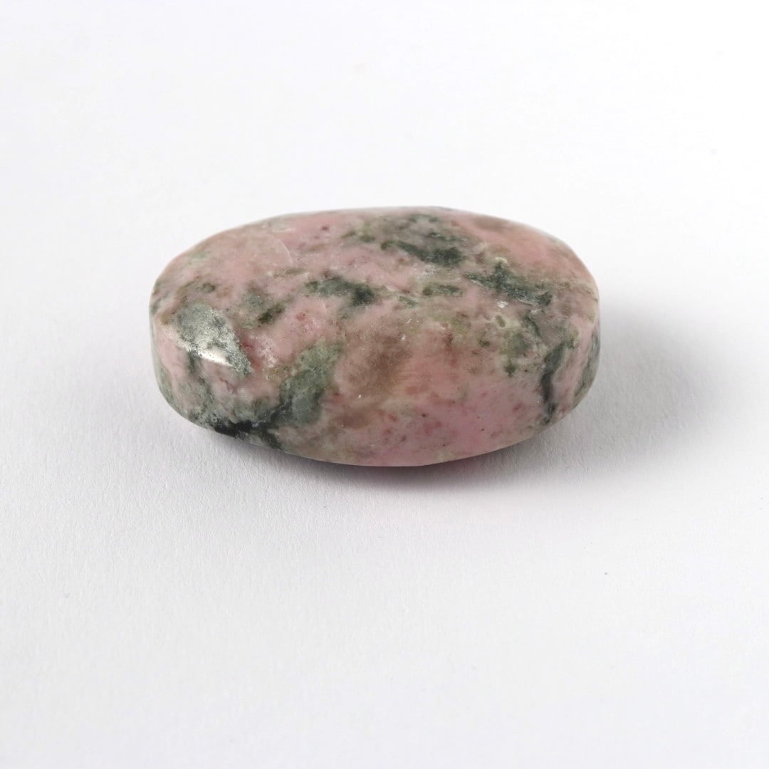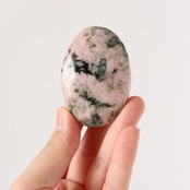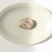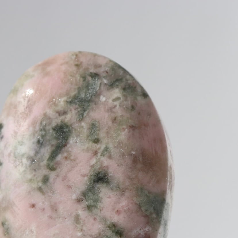 こちらは、ペルーロードナイトの柔らかなピンクの母岩の中に、グレイッシュグリーンのトルマリンが入り込んだ握り石。