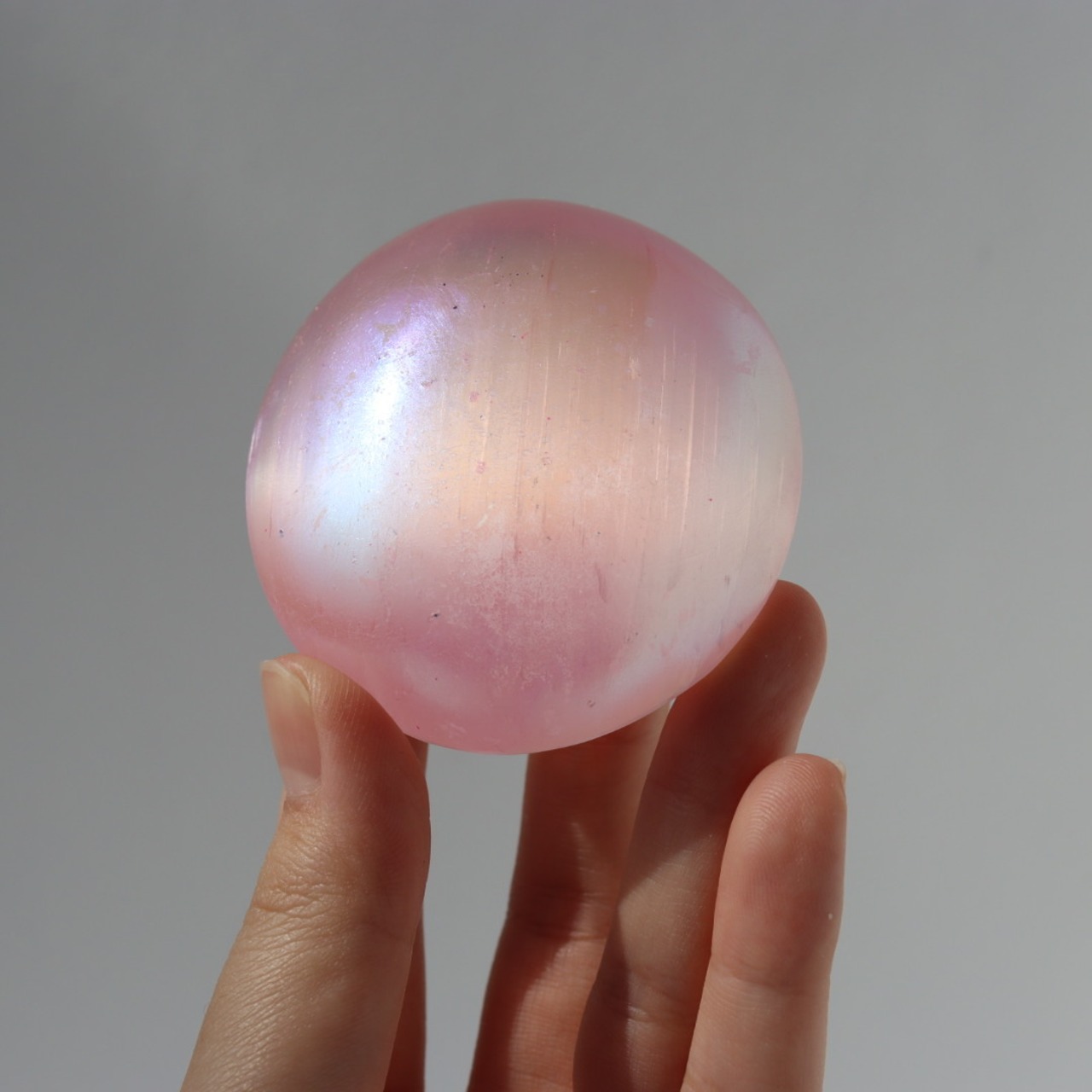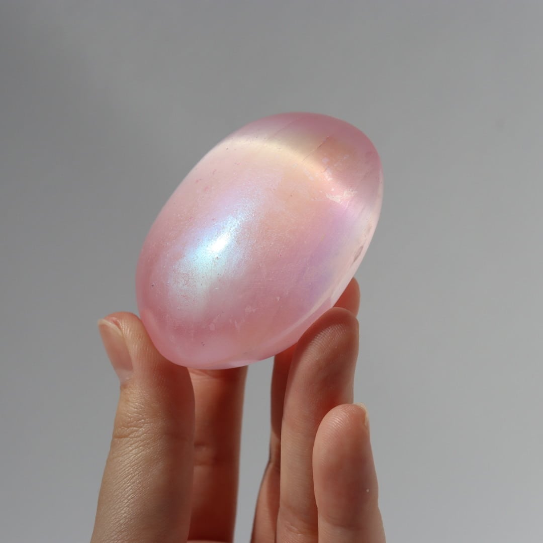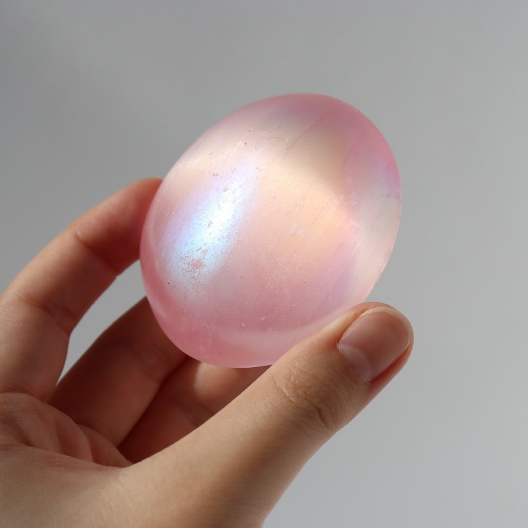 華やかな光をまとった、ローズオーラセレナイトの握り石。