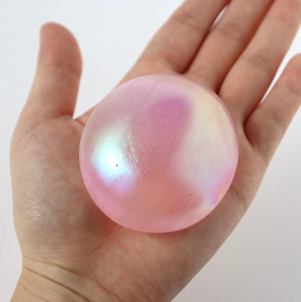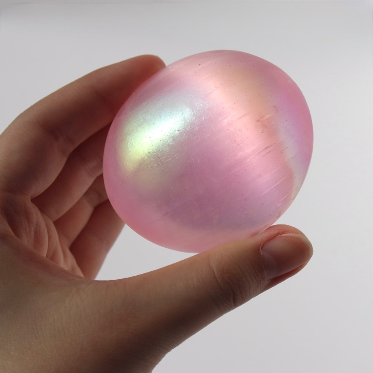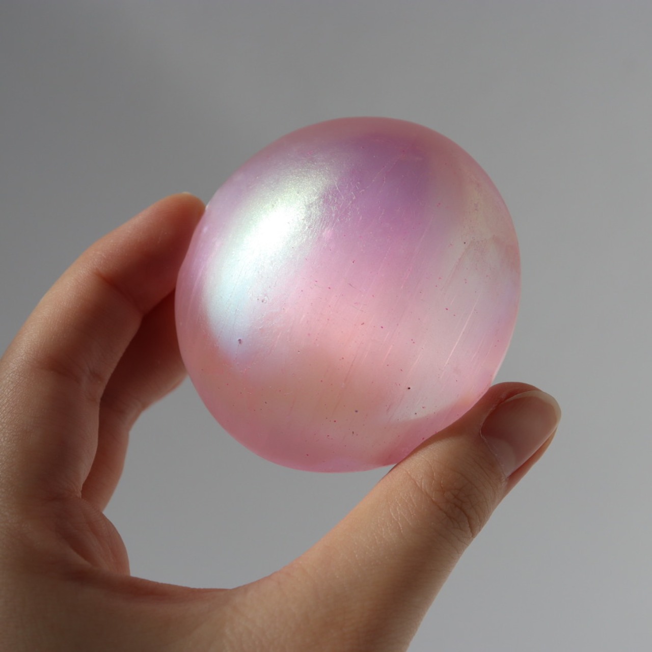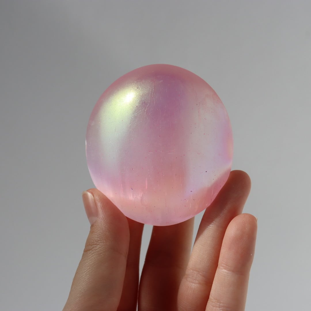 華やかな光をまとった、ローズオーラセレナイトの握り石。