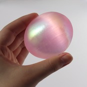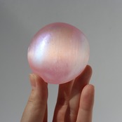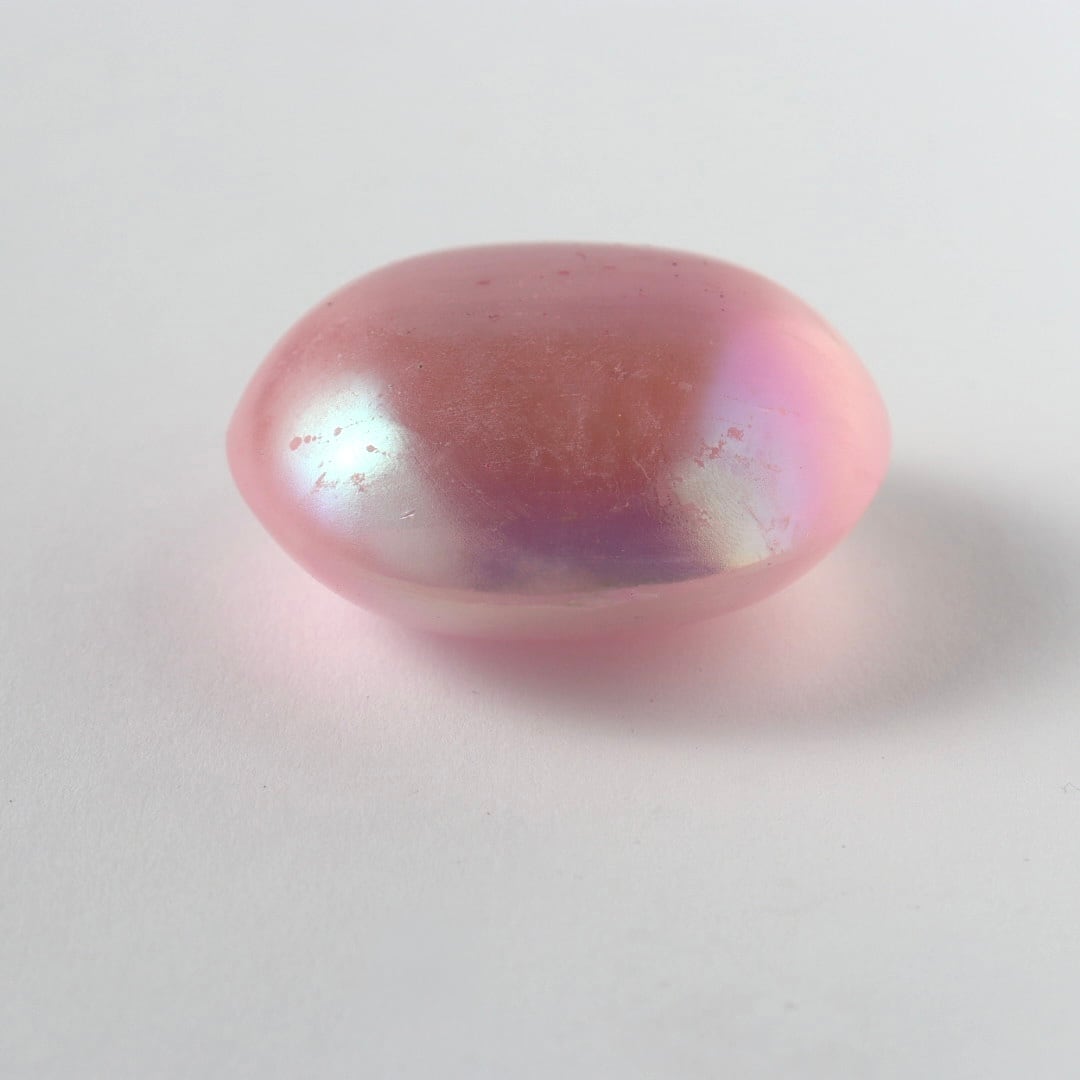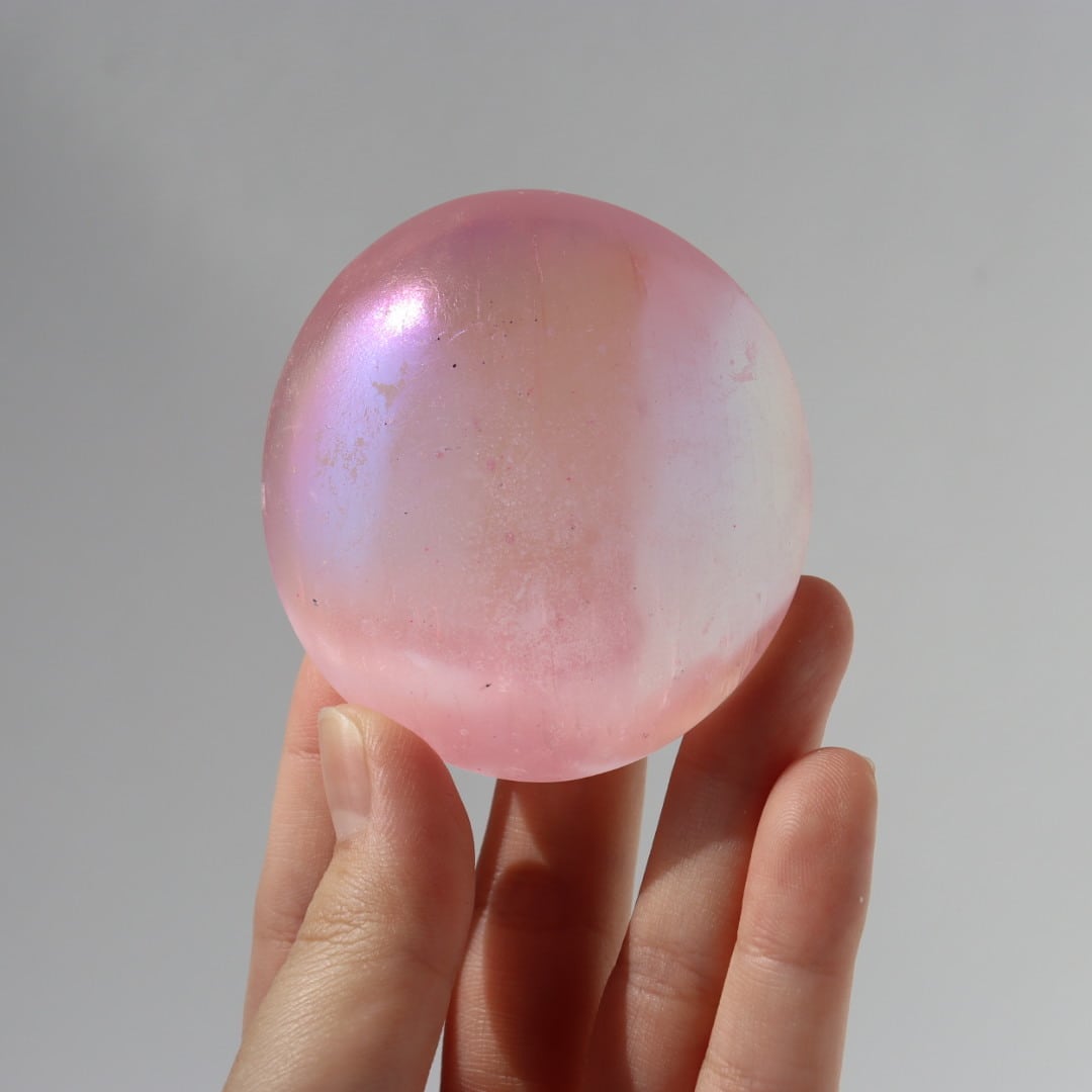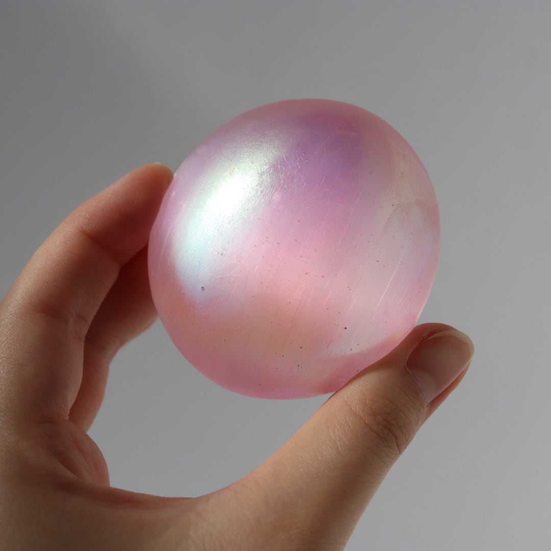 こちらは、セレナイトにローズカラーのオーラをまとわせた握り石。