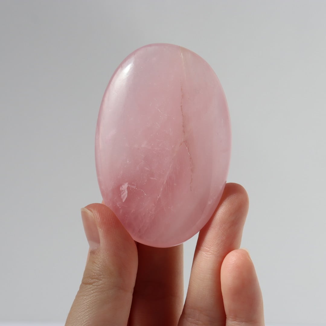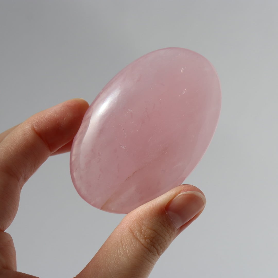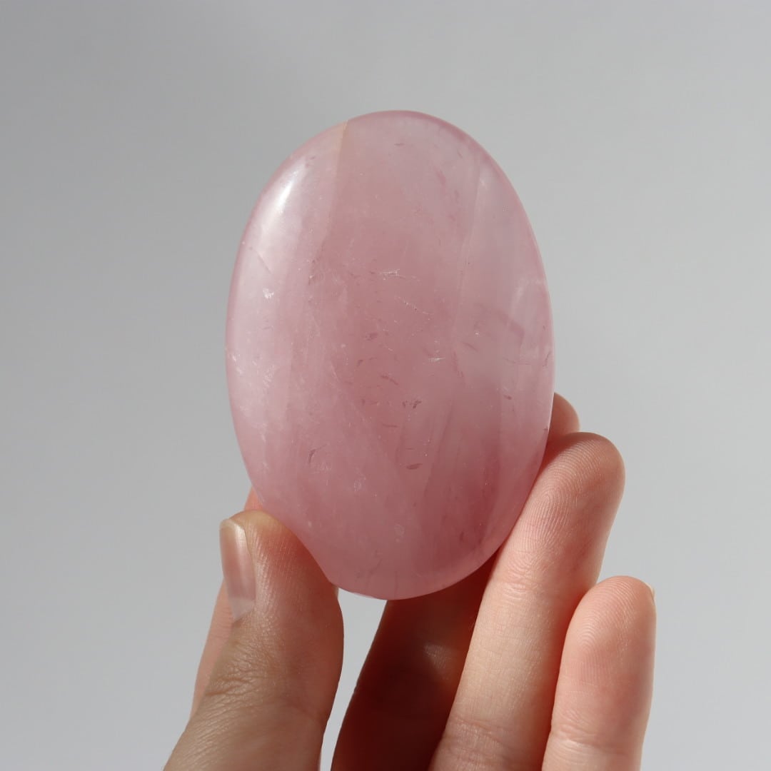 明るく濃い発色のロータスピンクが印象的な、ローズクォーツの握り石。