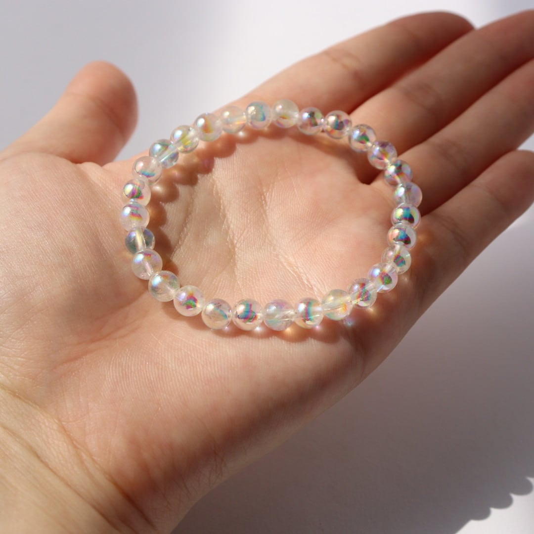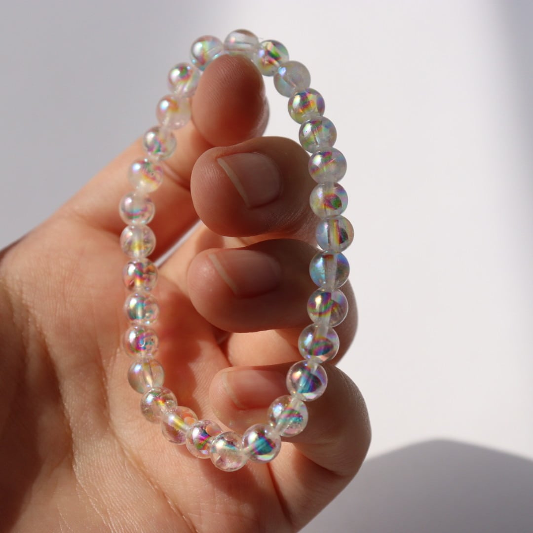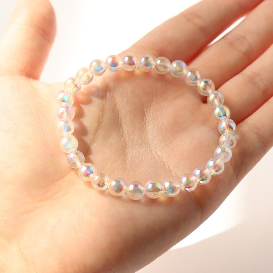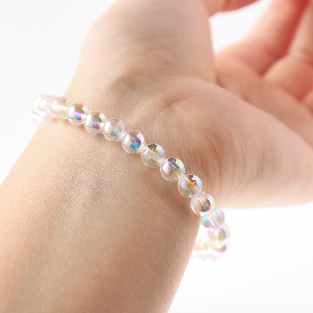 透明度の高いクリアクォーツにプリズムのようなオーラ加工を施した、エンジェルオーラクォーツのブレスレット。