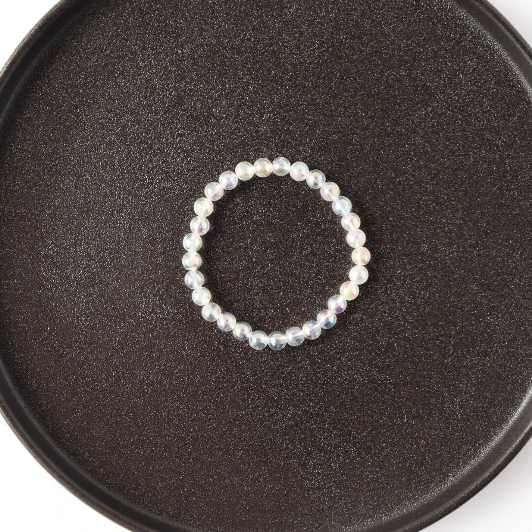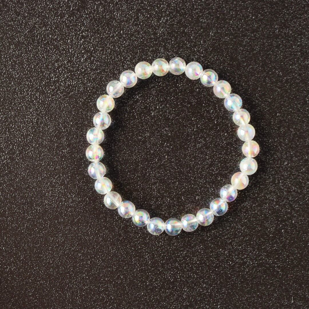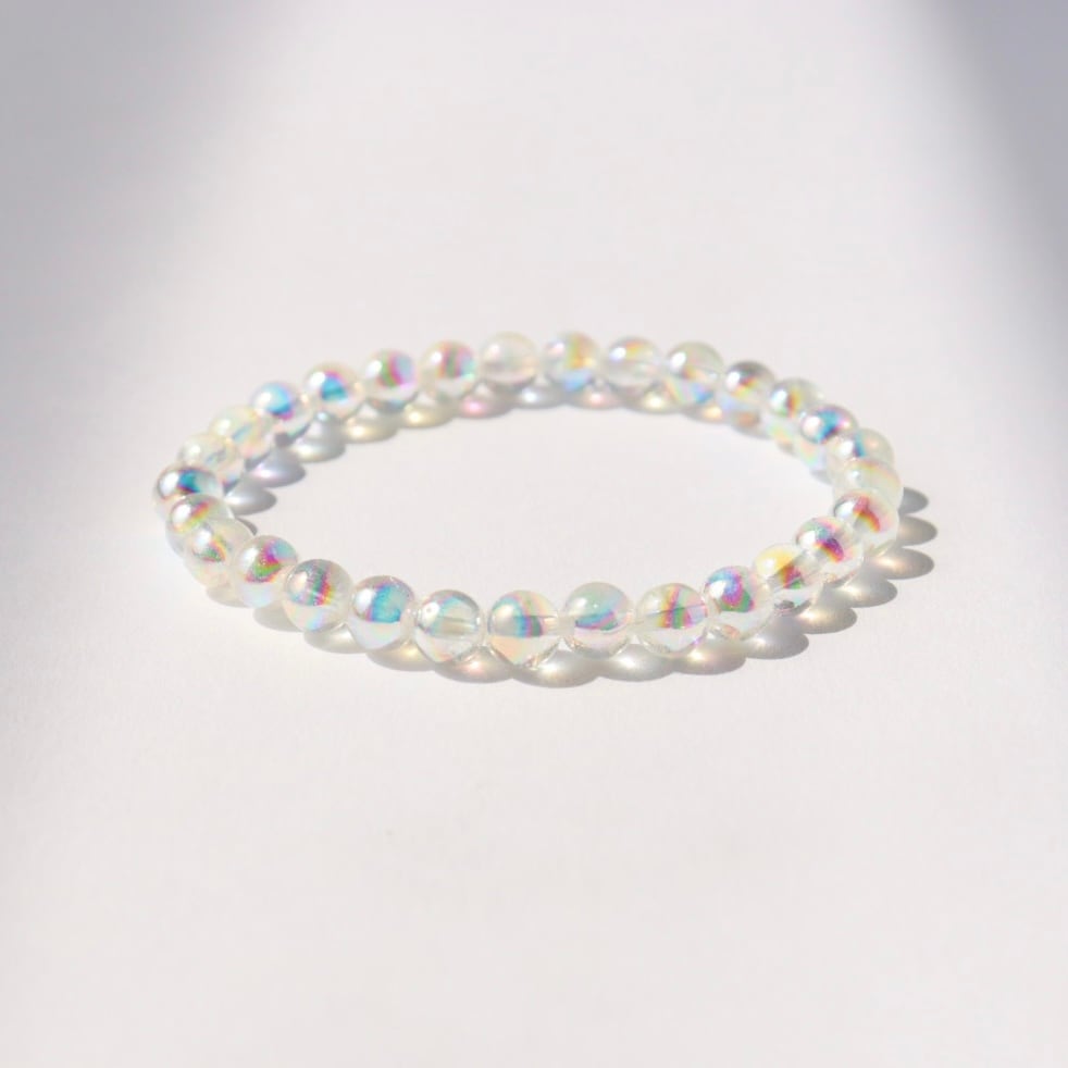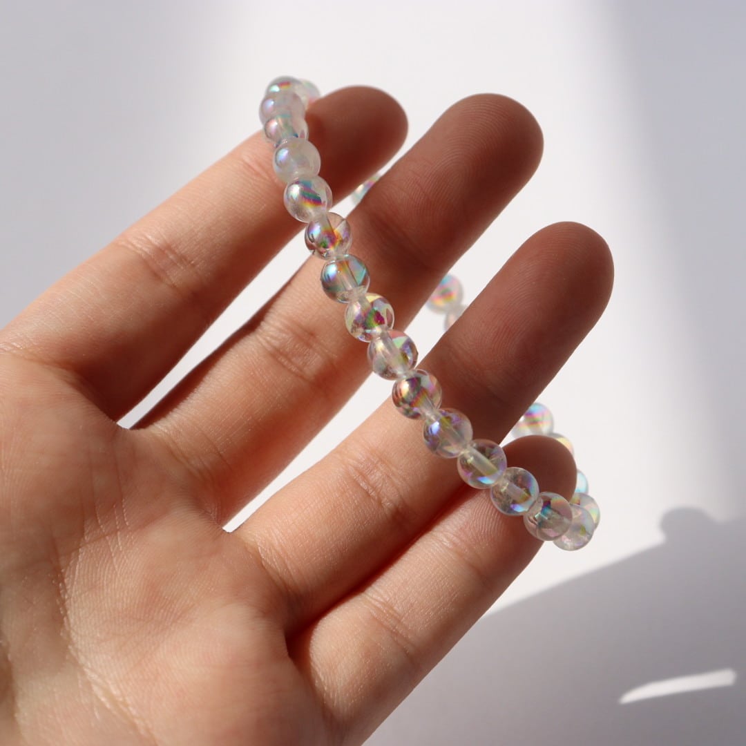 透明度の高いクリアクォーツにプリズムのようなオーラ加工を施した、エンジェルオーラクォーツのブレスレット。