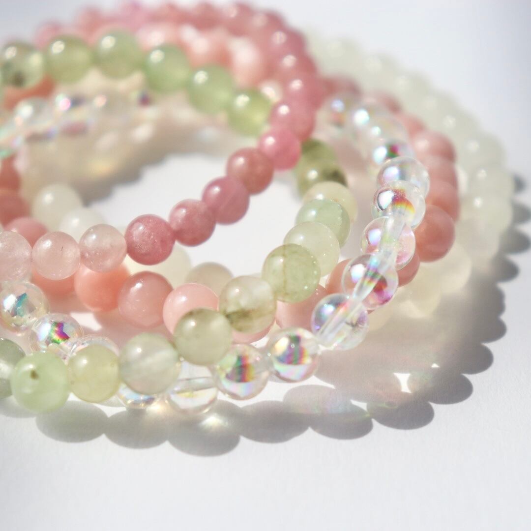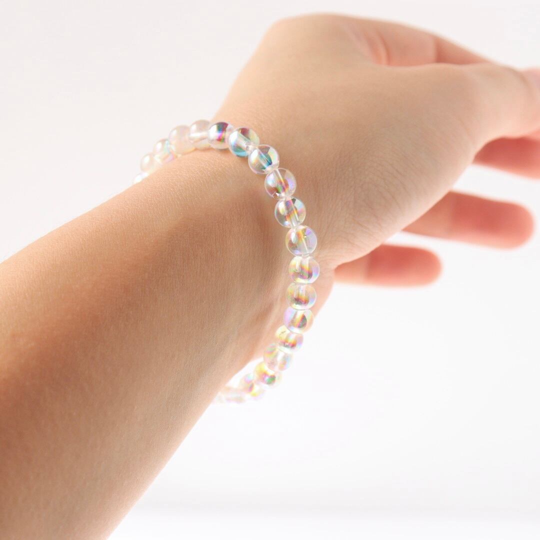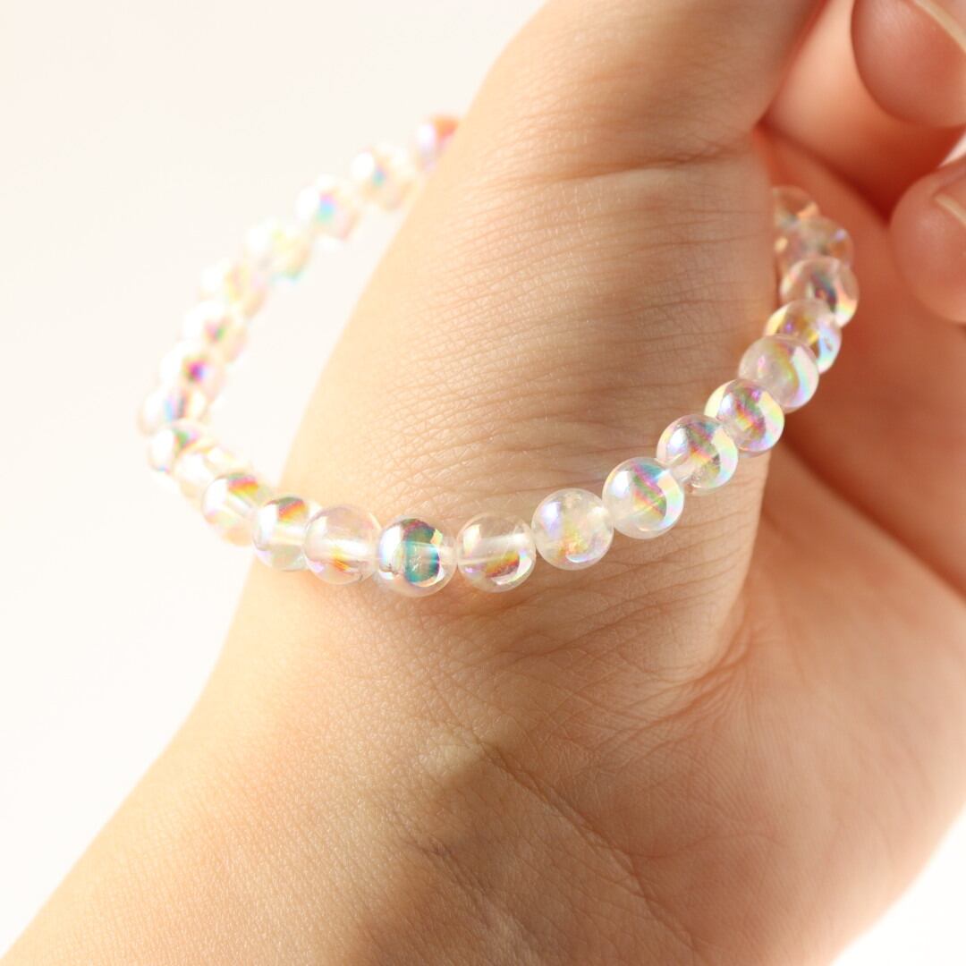 こちらは、透明なクリアクォーツの美しさに虹色の輝きが加わった、華やかで優雅なブレスレット。虹色のプリズムを纏ったエンジェルオーラのビースです。