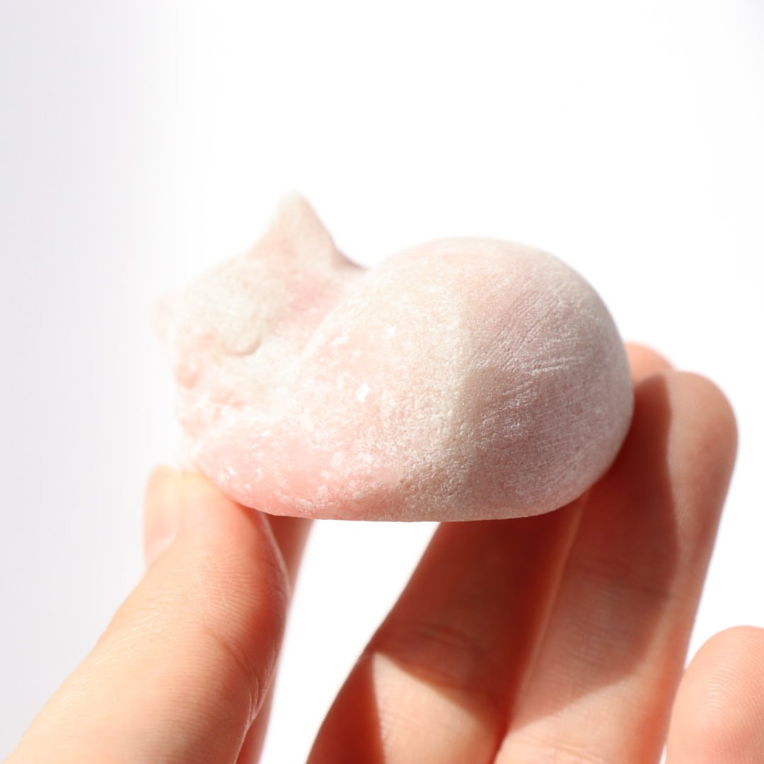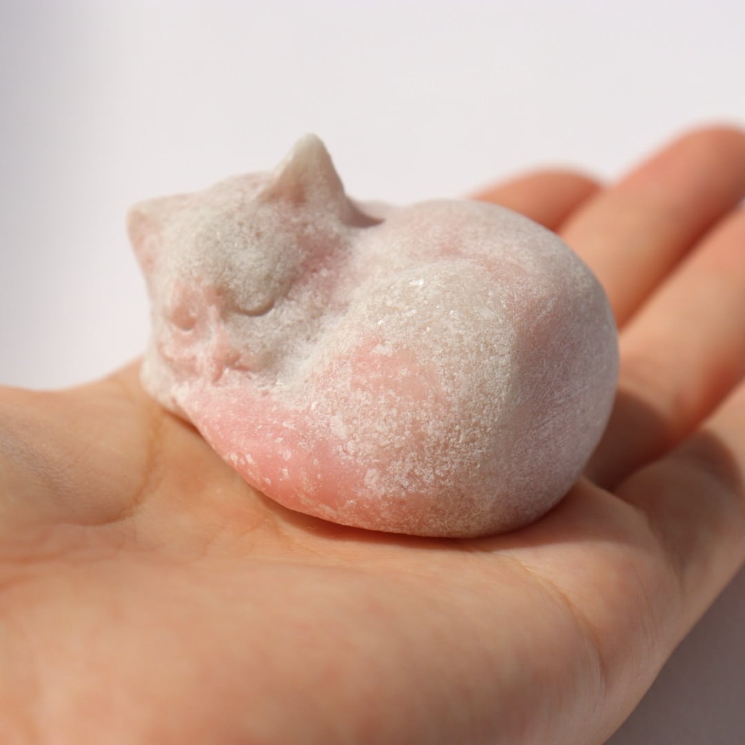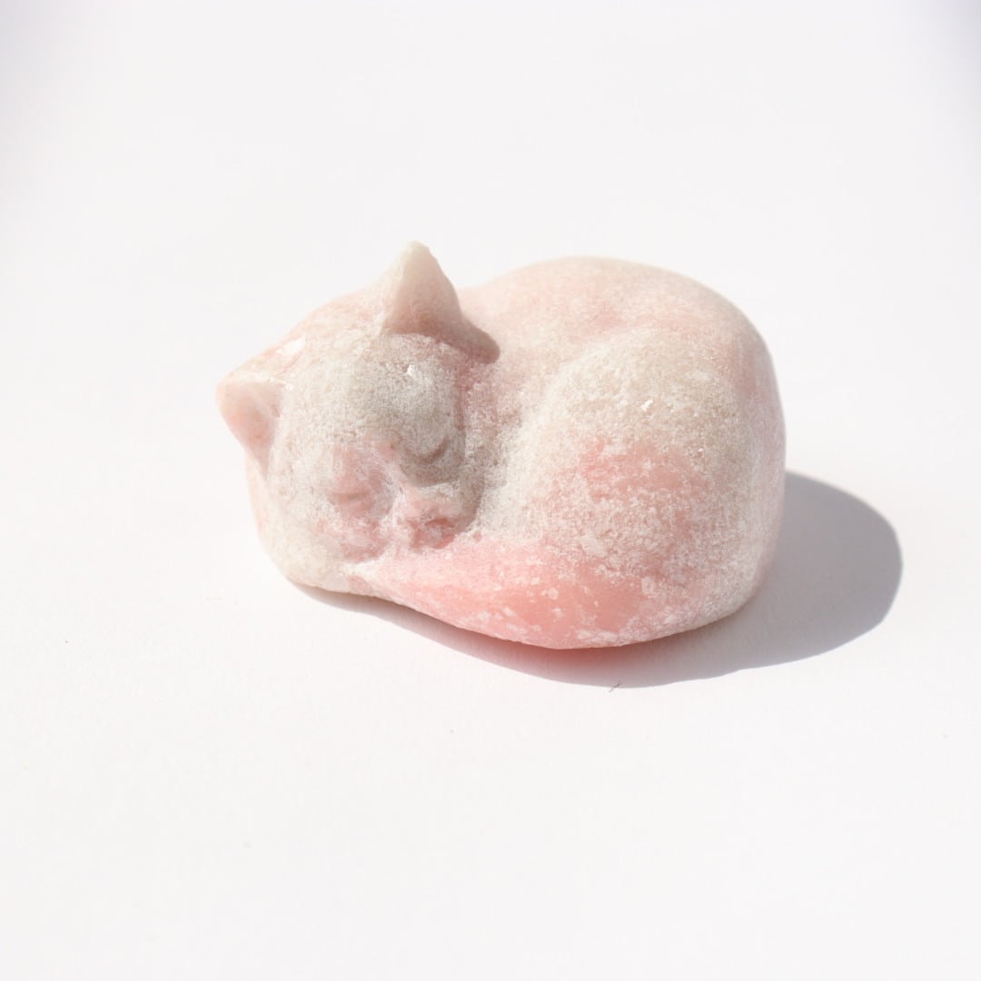 柔らかな毛布にぬくぬくとくるまっているかのようなねこのリラックスした姿と、さらさらキラキラとしたピンクオパールの質感が魅力です。