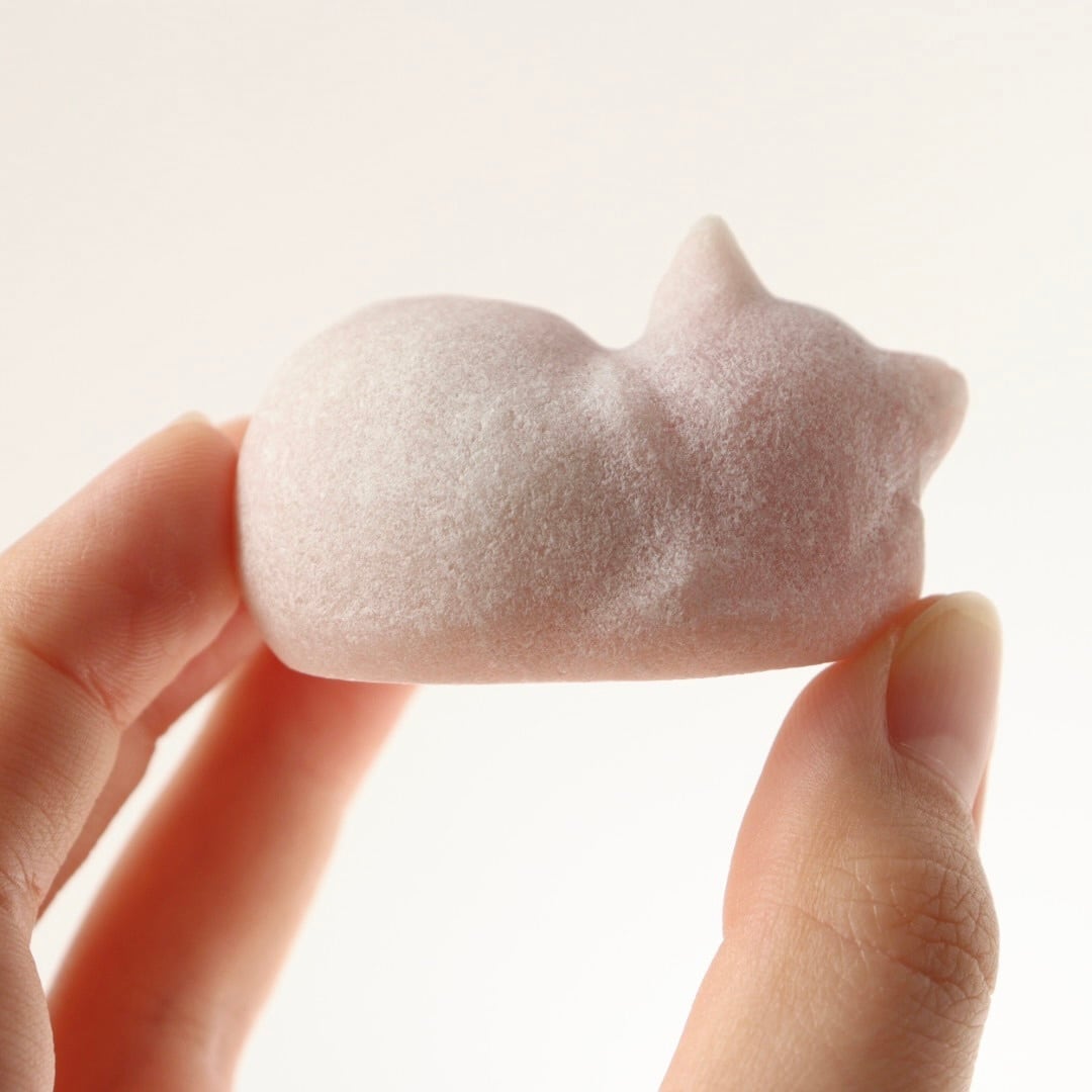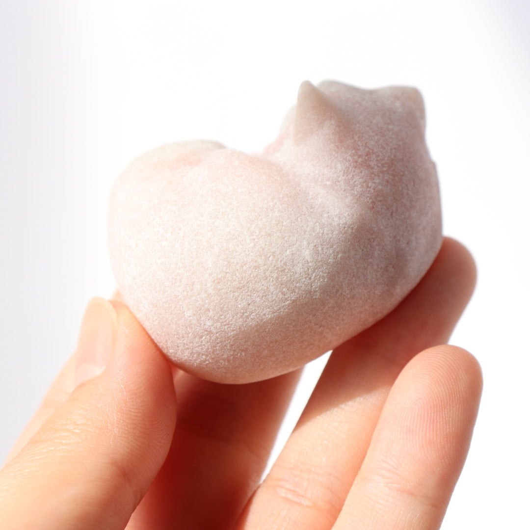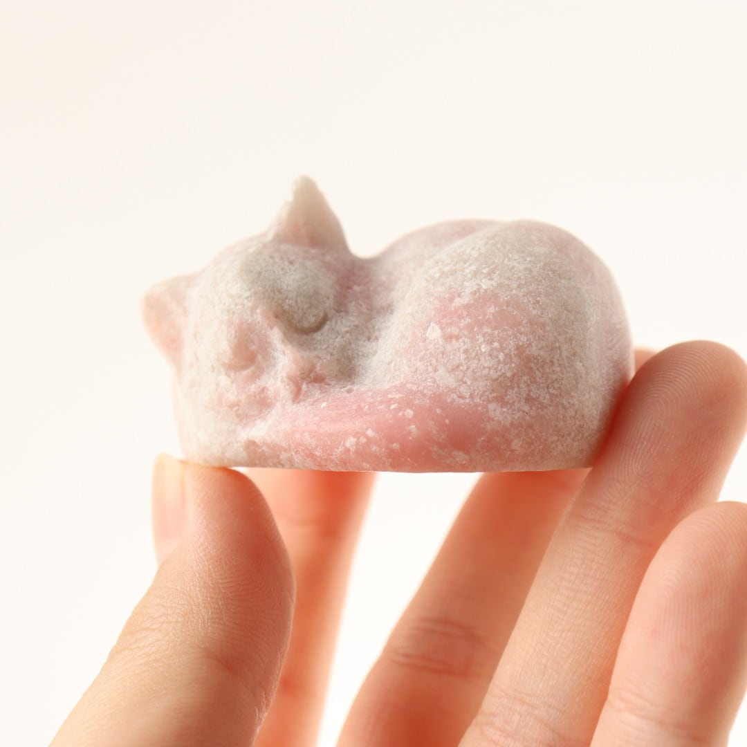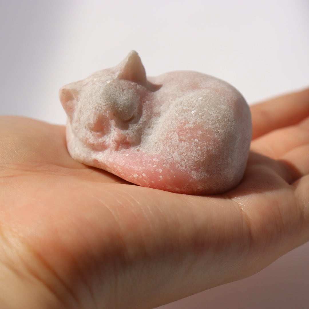 柔らかな毛布にぬくぬくとくるまっているかのようなねこのリラックスした姿と、さらさらキラキラとしたピンクオパールの質感が魅力です。