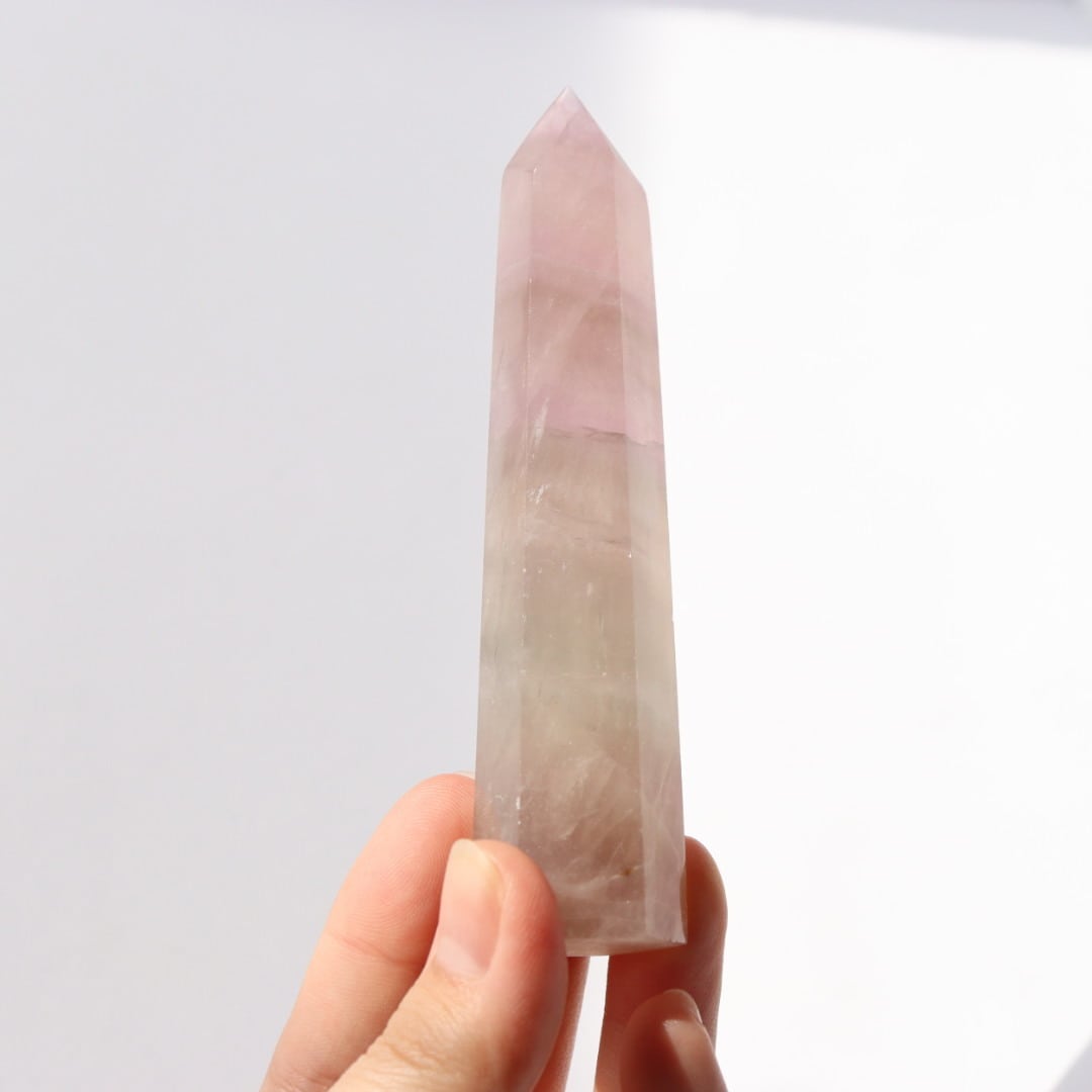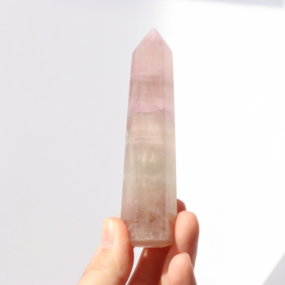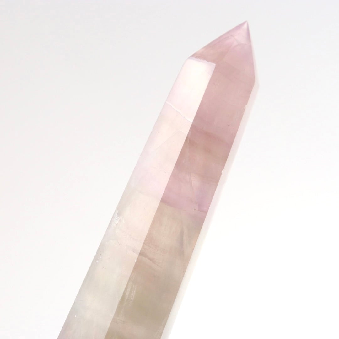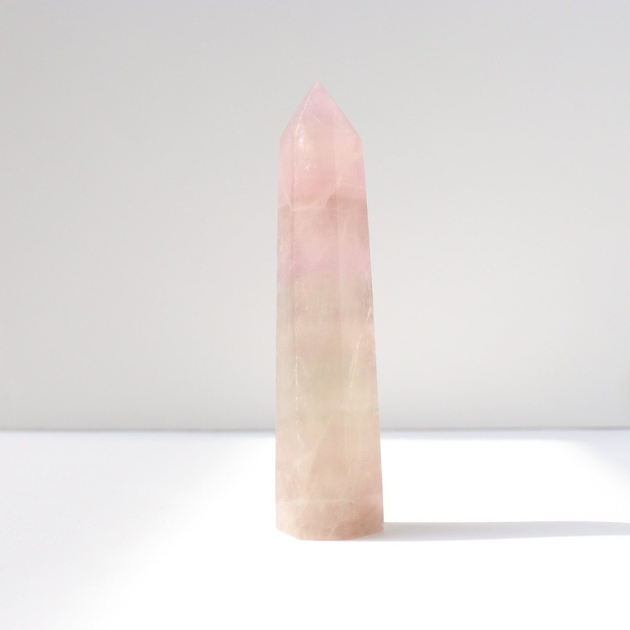 ピンクから淡いグリーンへと移ろうグラデーションが美しいピンクフローライトのタワー。