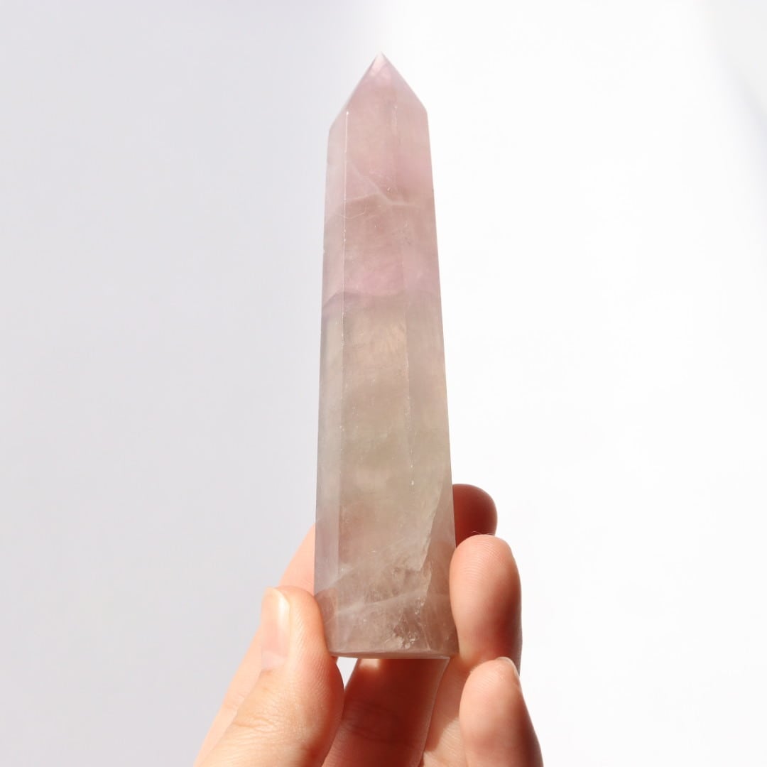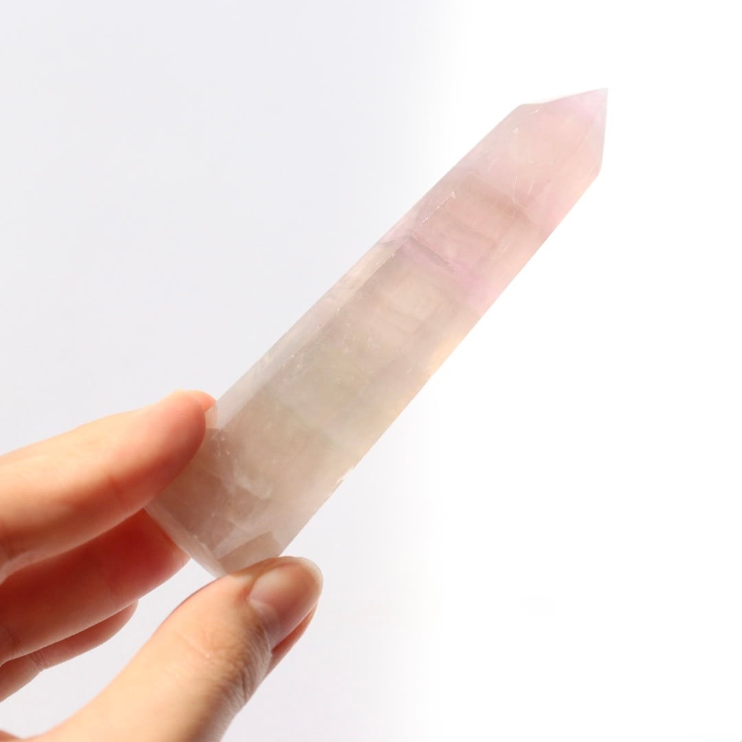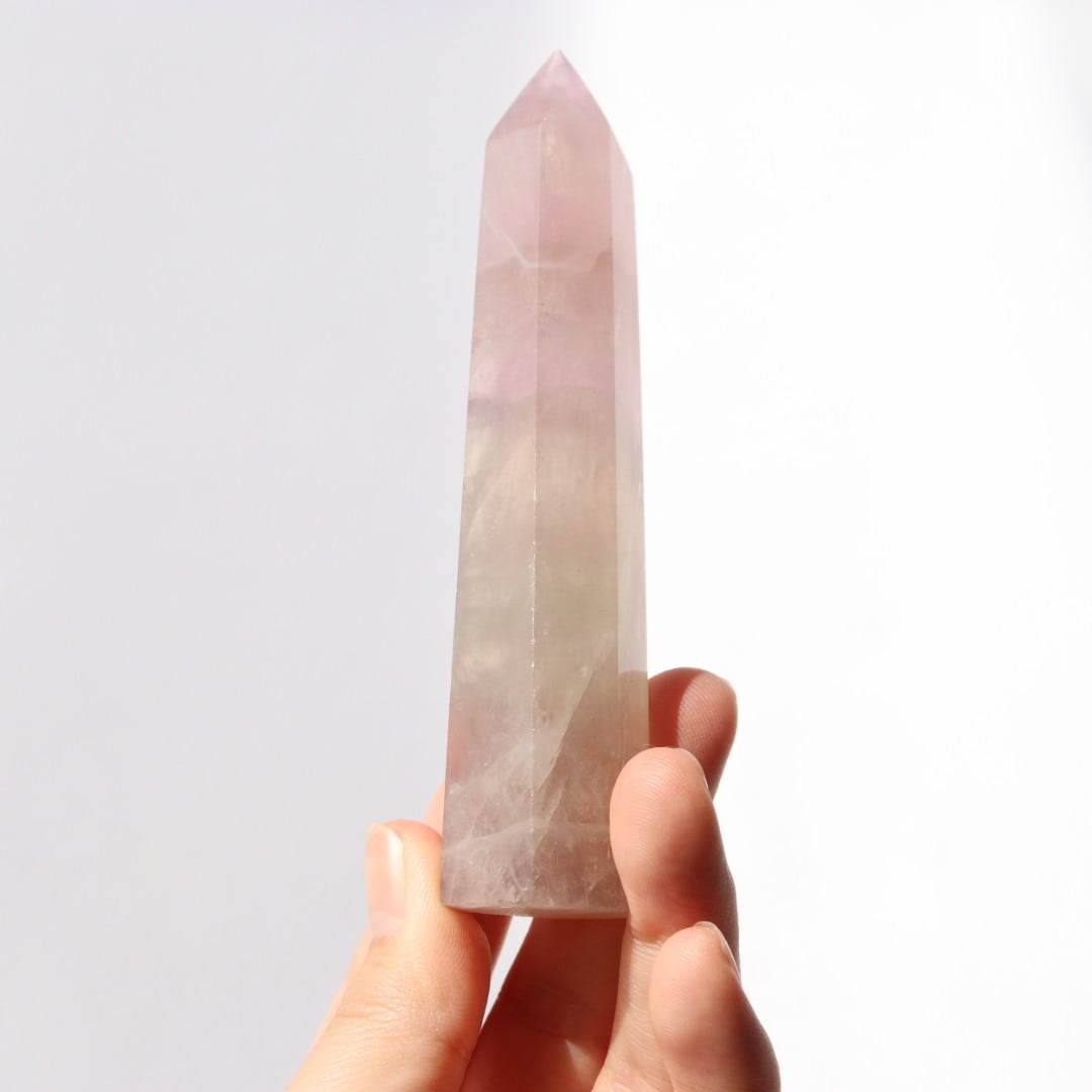 ピンクから淡いグリーンへと移ろうグラデーションが美しいピンクフローライトのタワー。