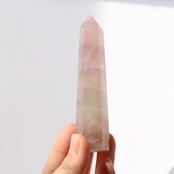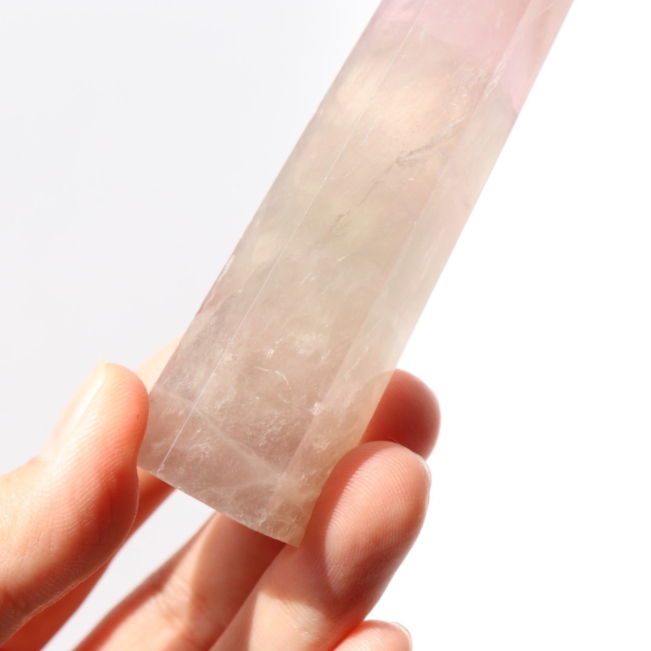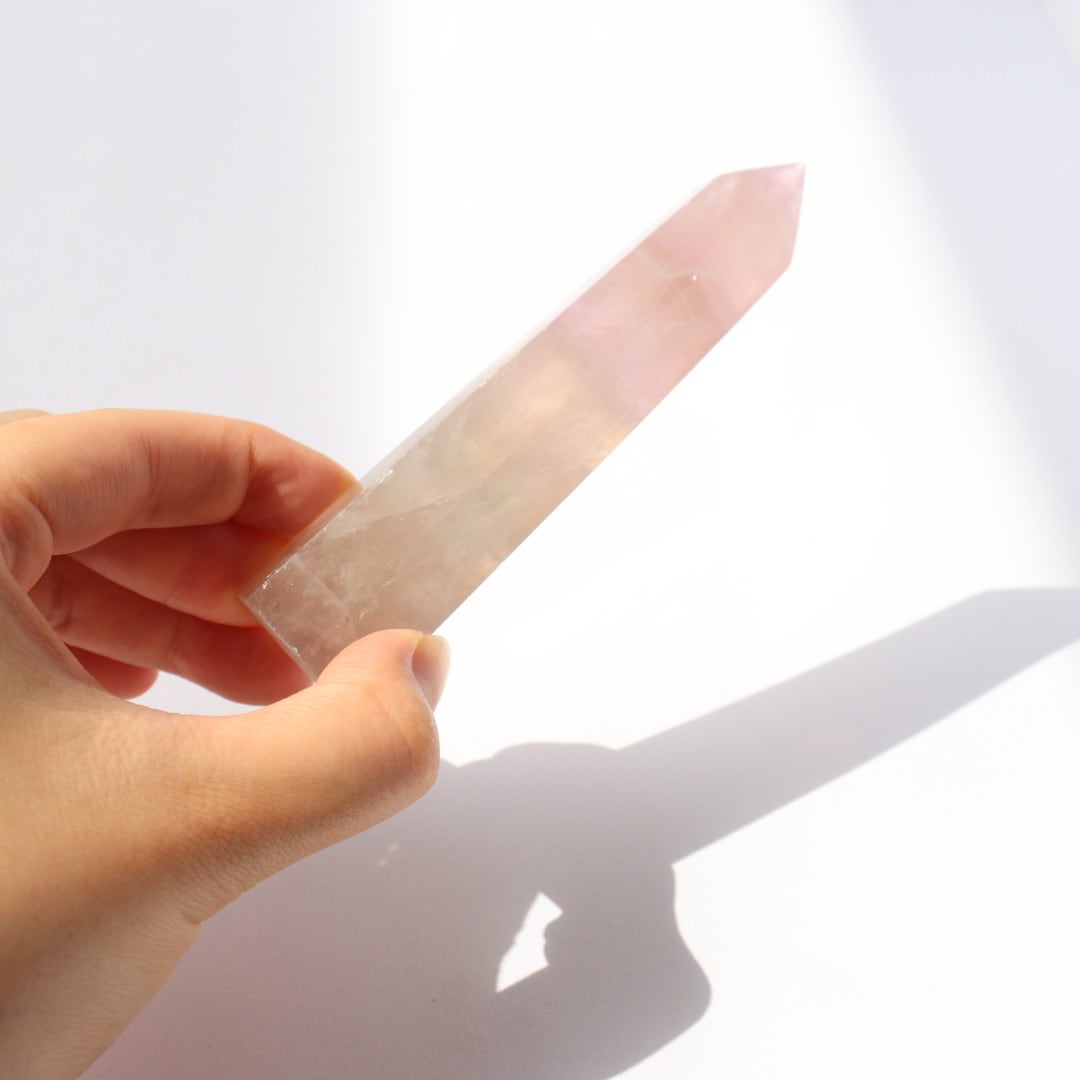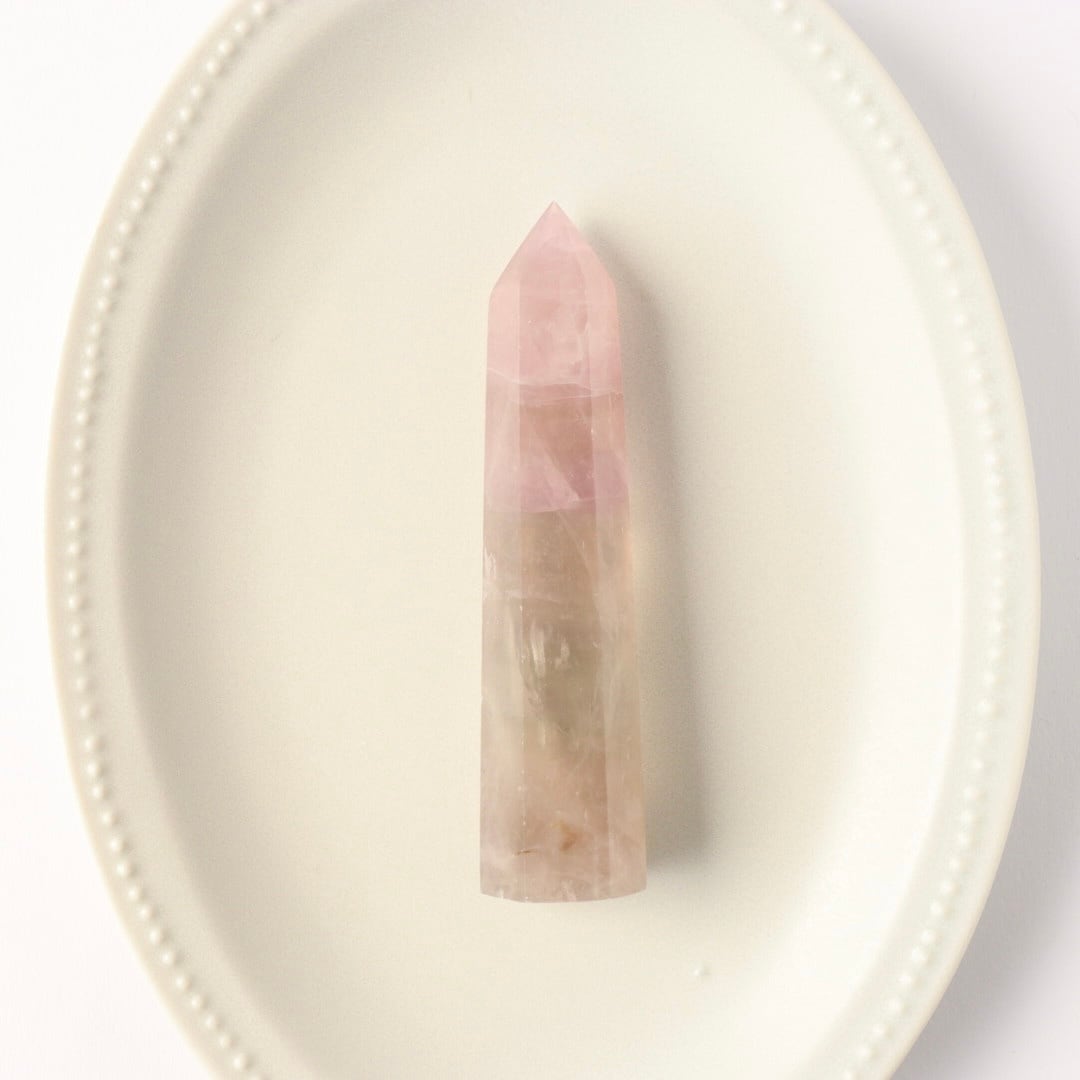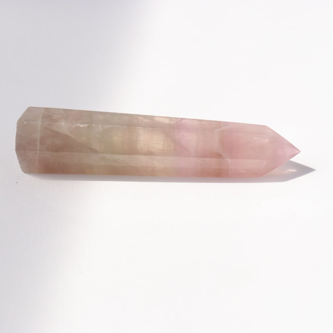 ピンクから淡いグリーンへと移ろうグラデーションが美しいピンクフローライトのタワー。