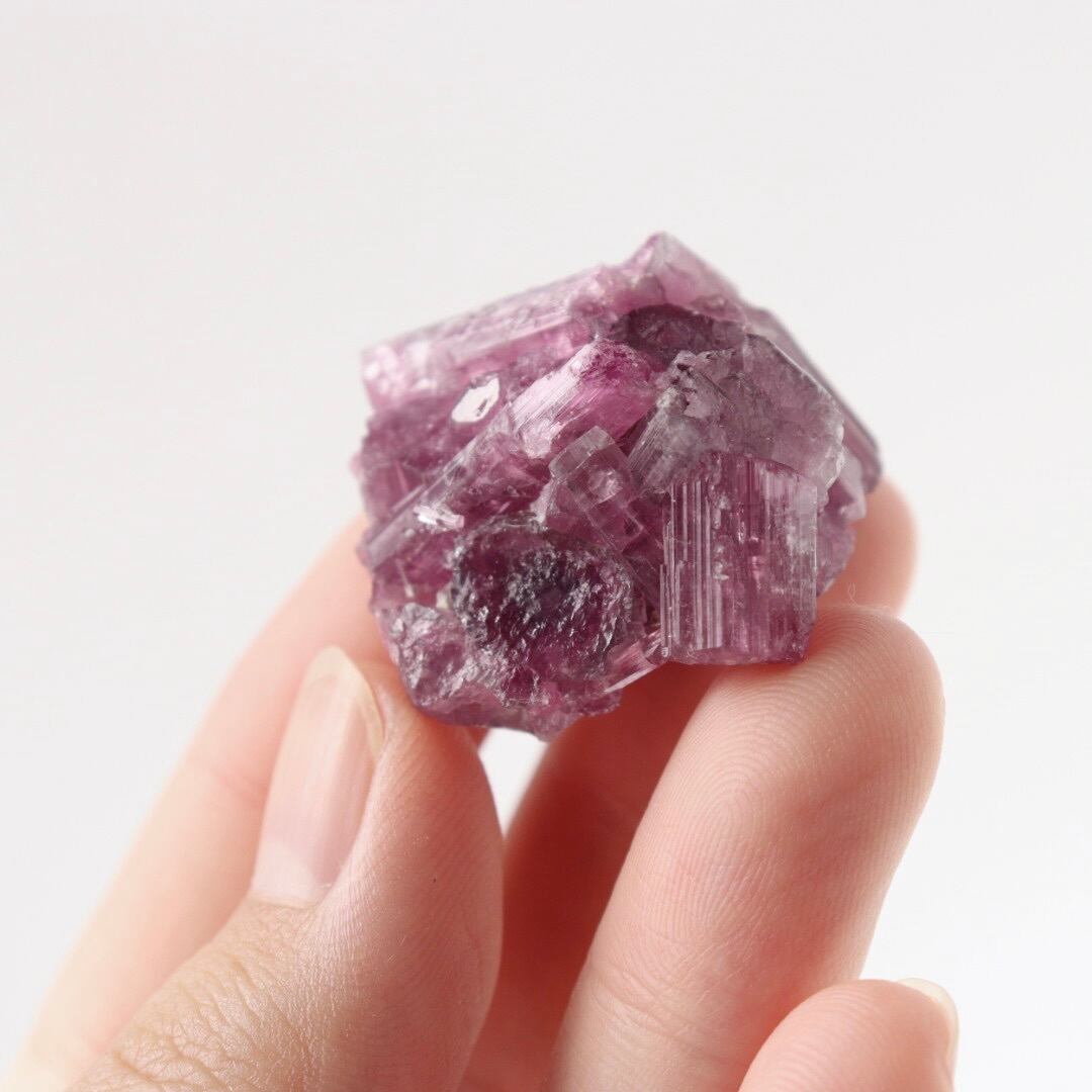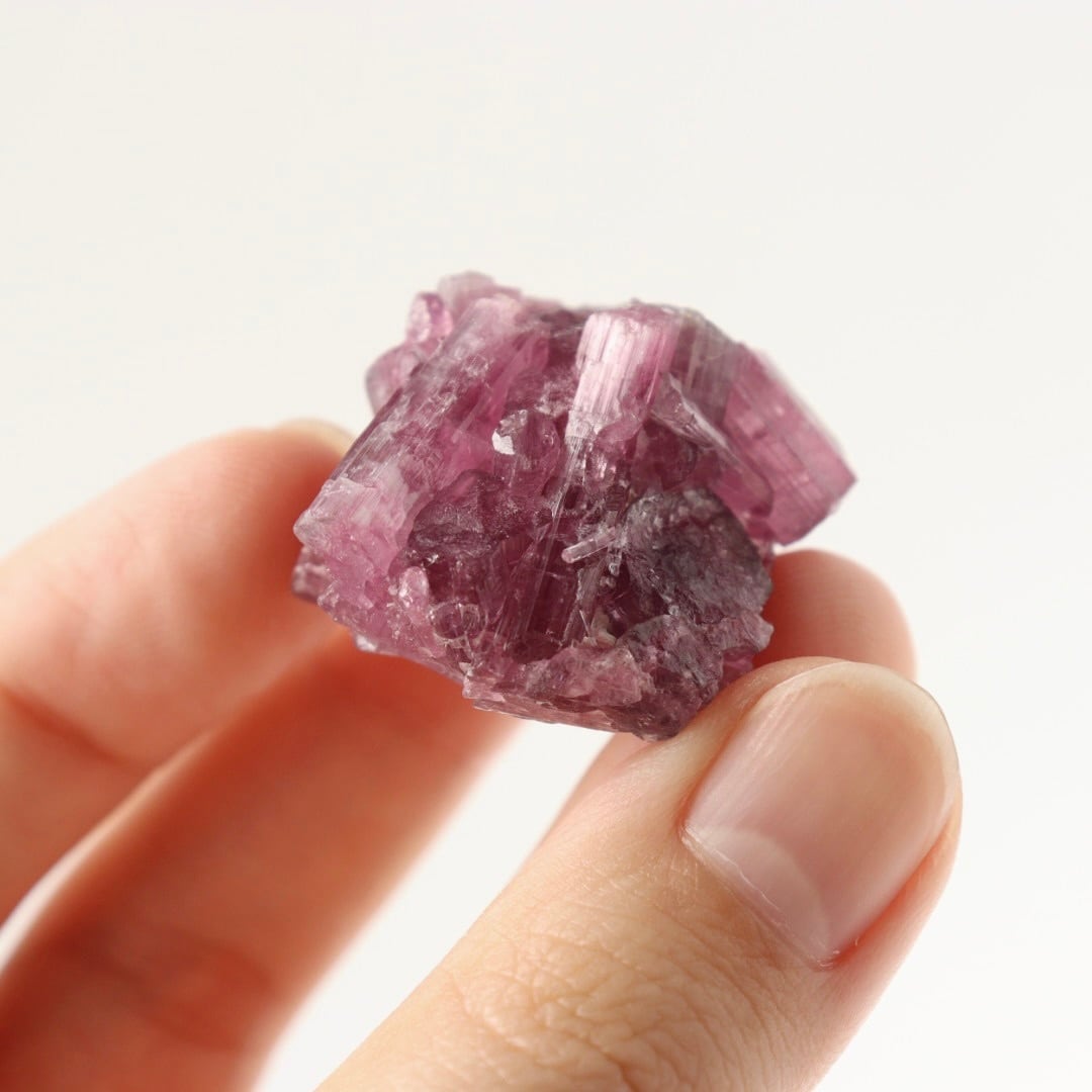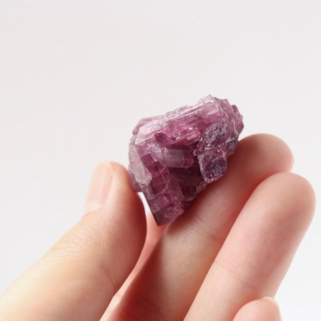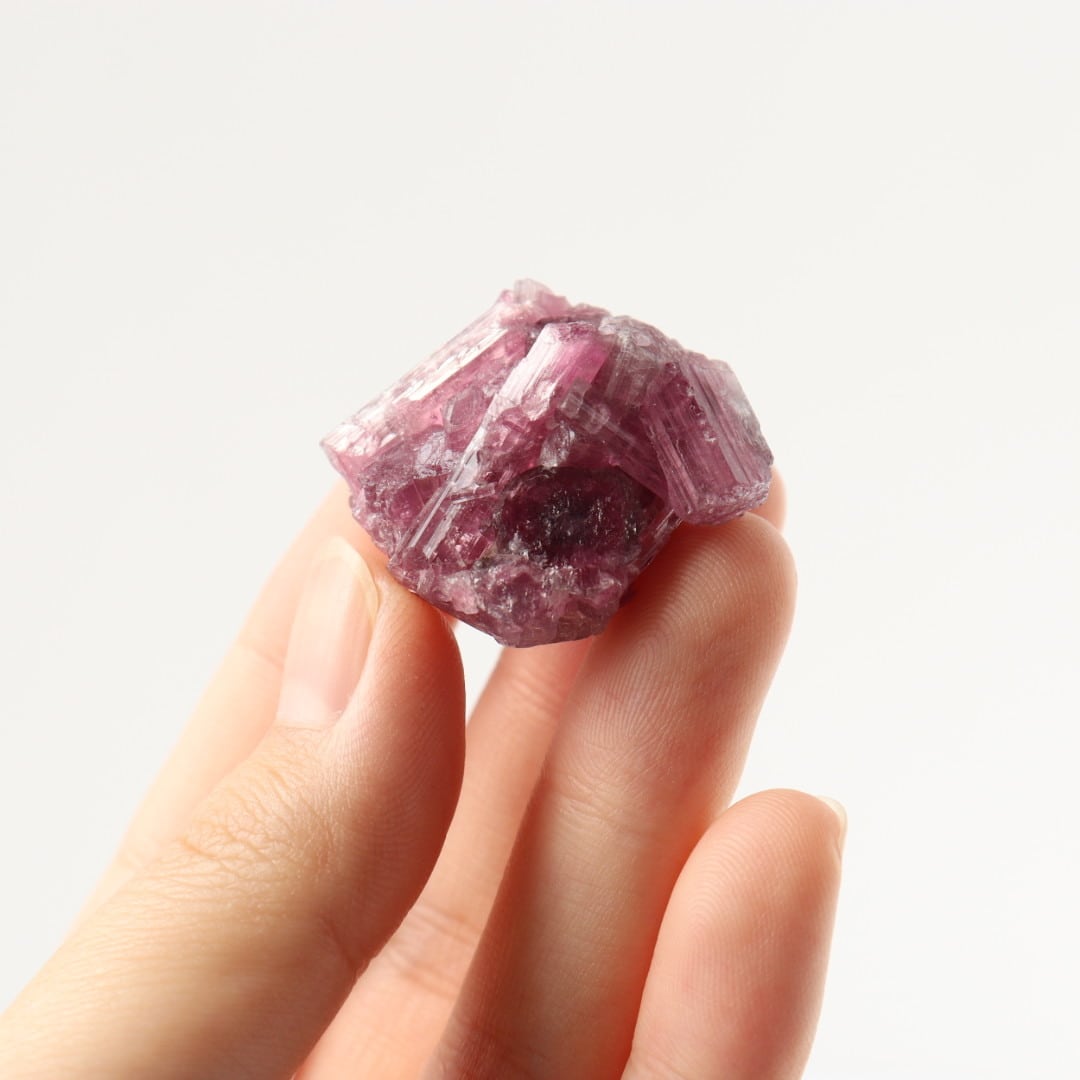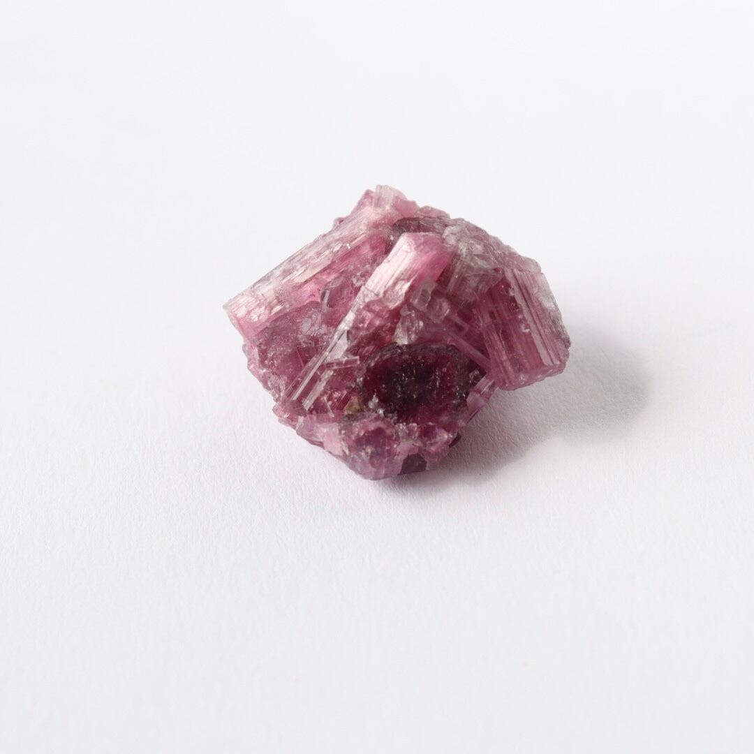 ラズベリーピンクの柱状結晶がぎゅっと集まったピンクトルマリンの原石。