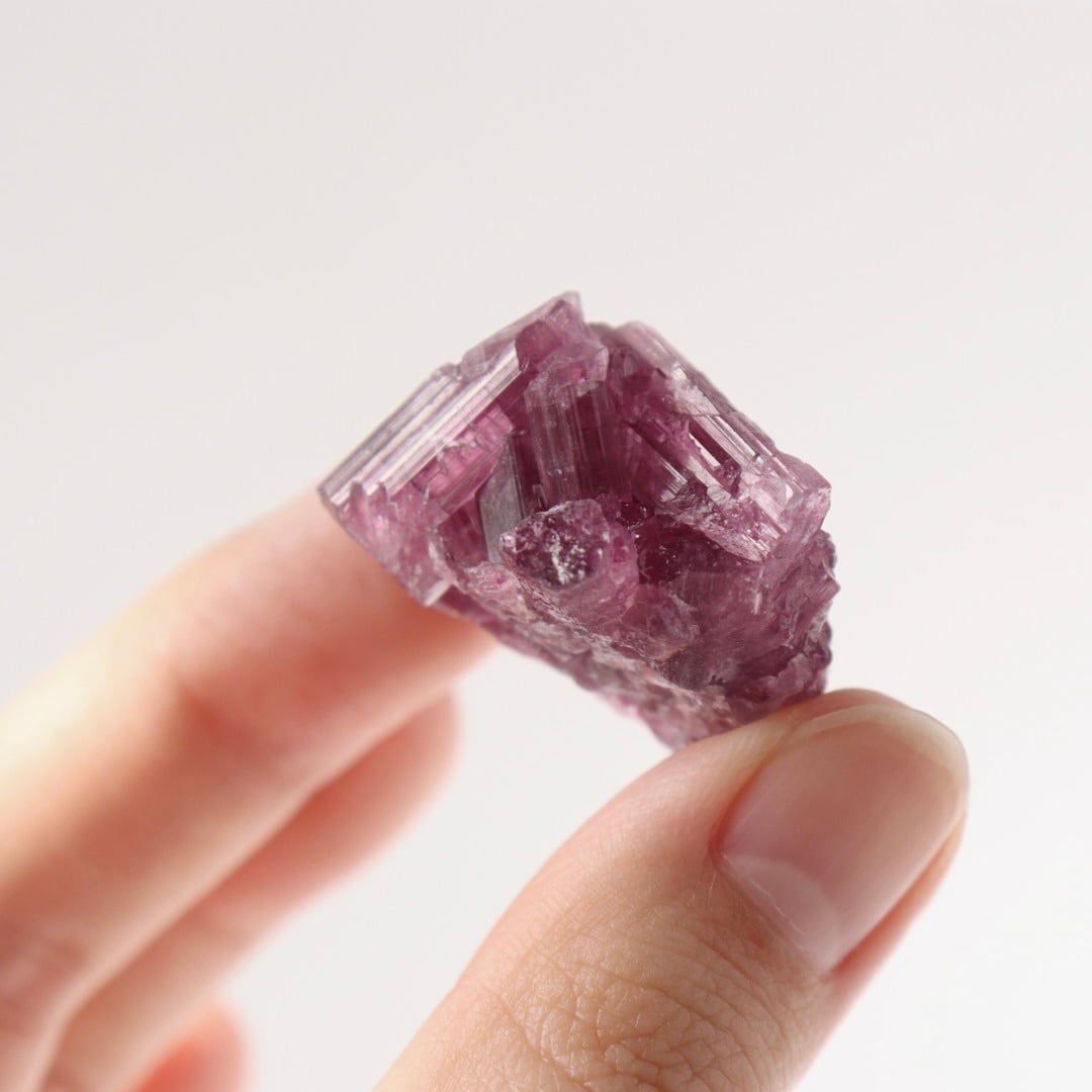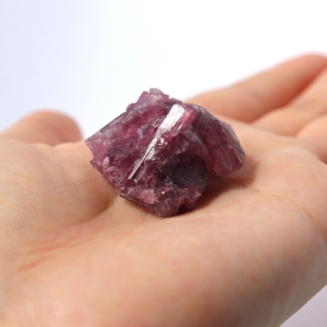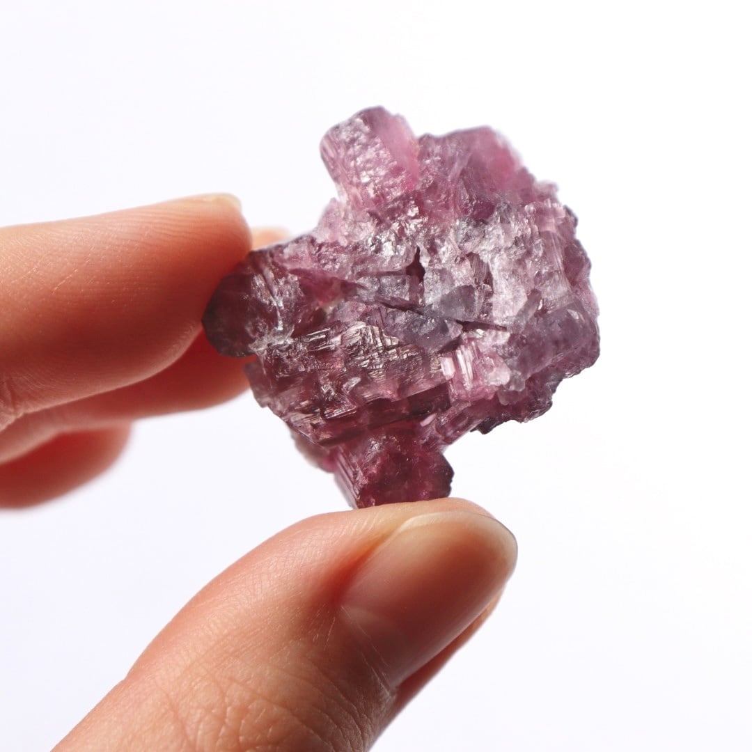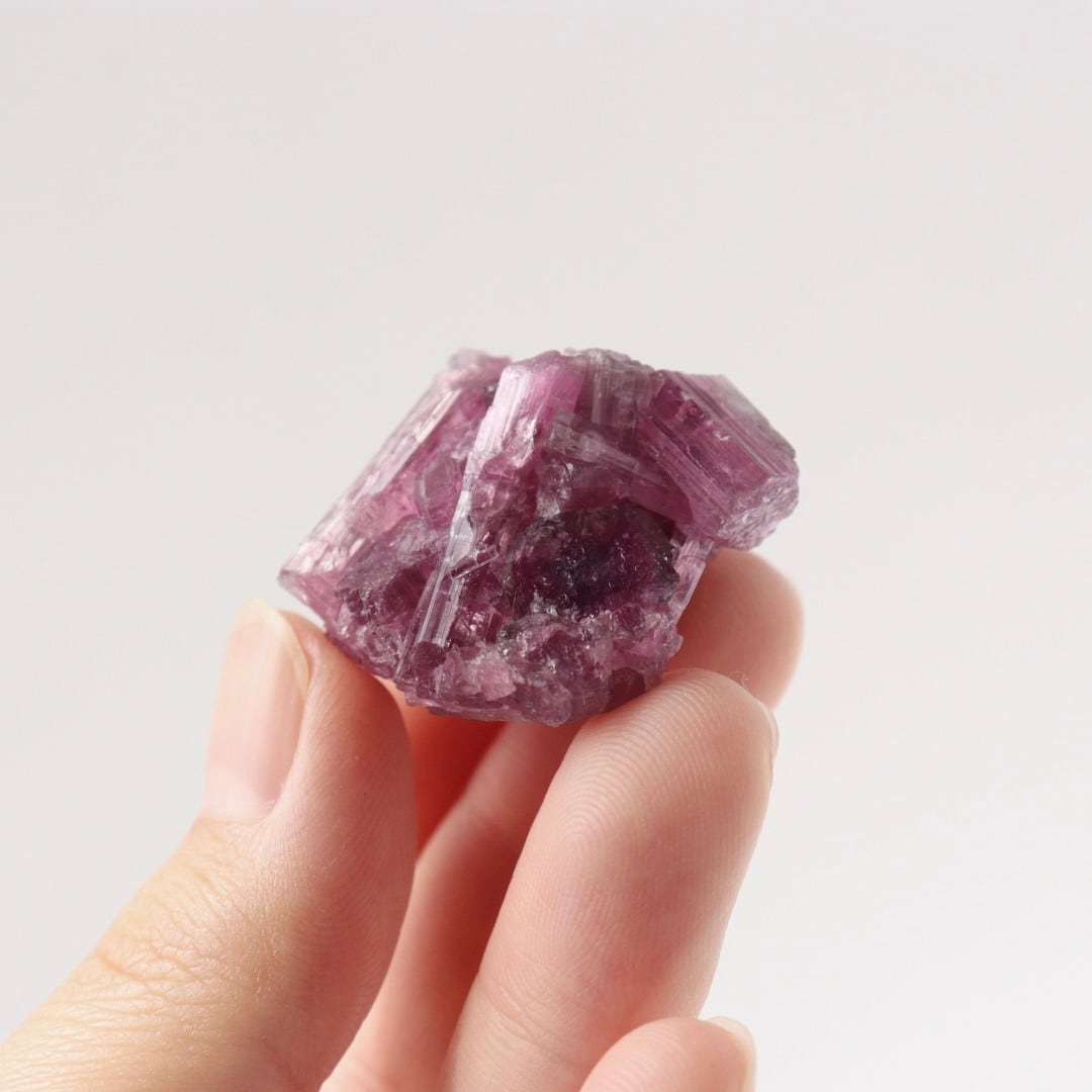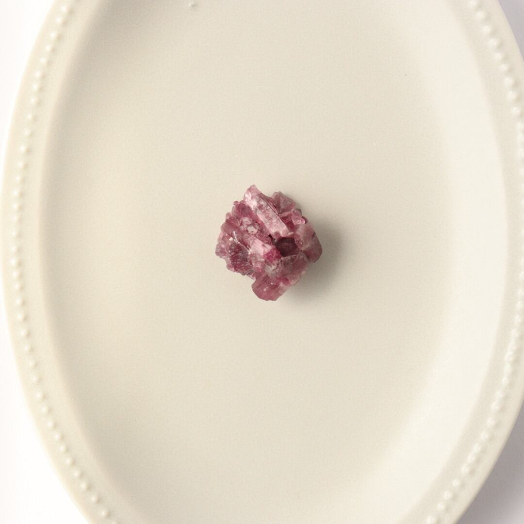 ラズベリーピンクの柱状結晶がぎゅっと集まったピンクトルマリンの原石。