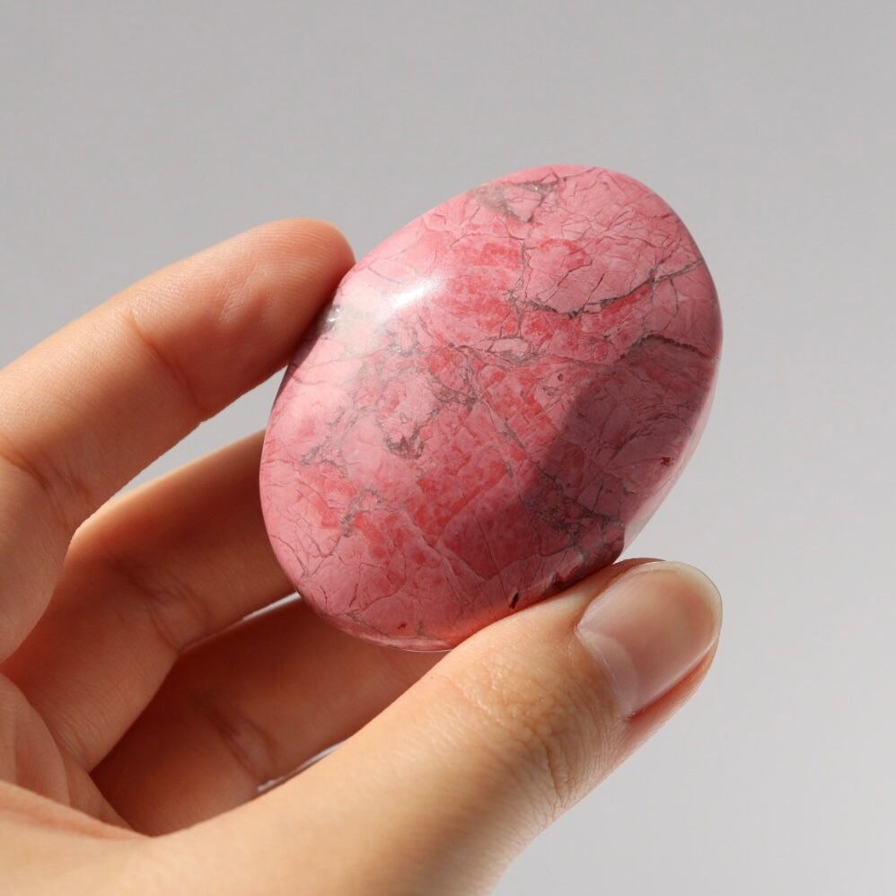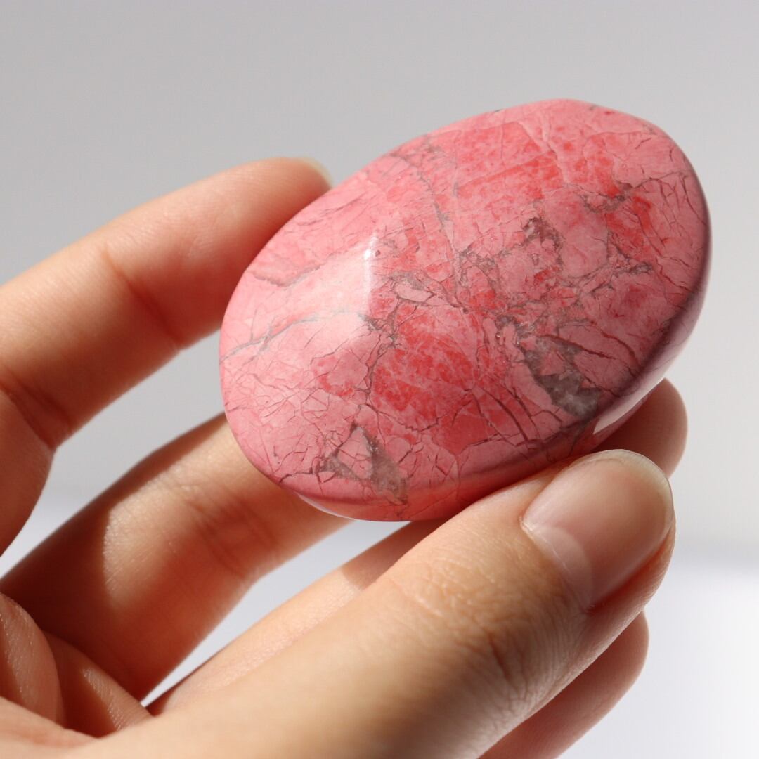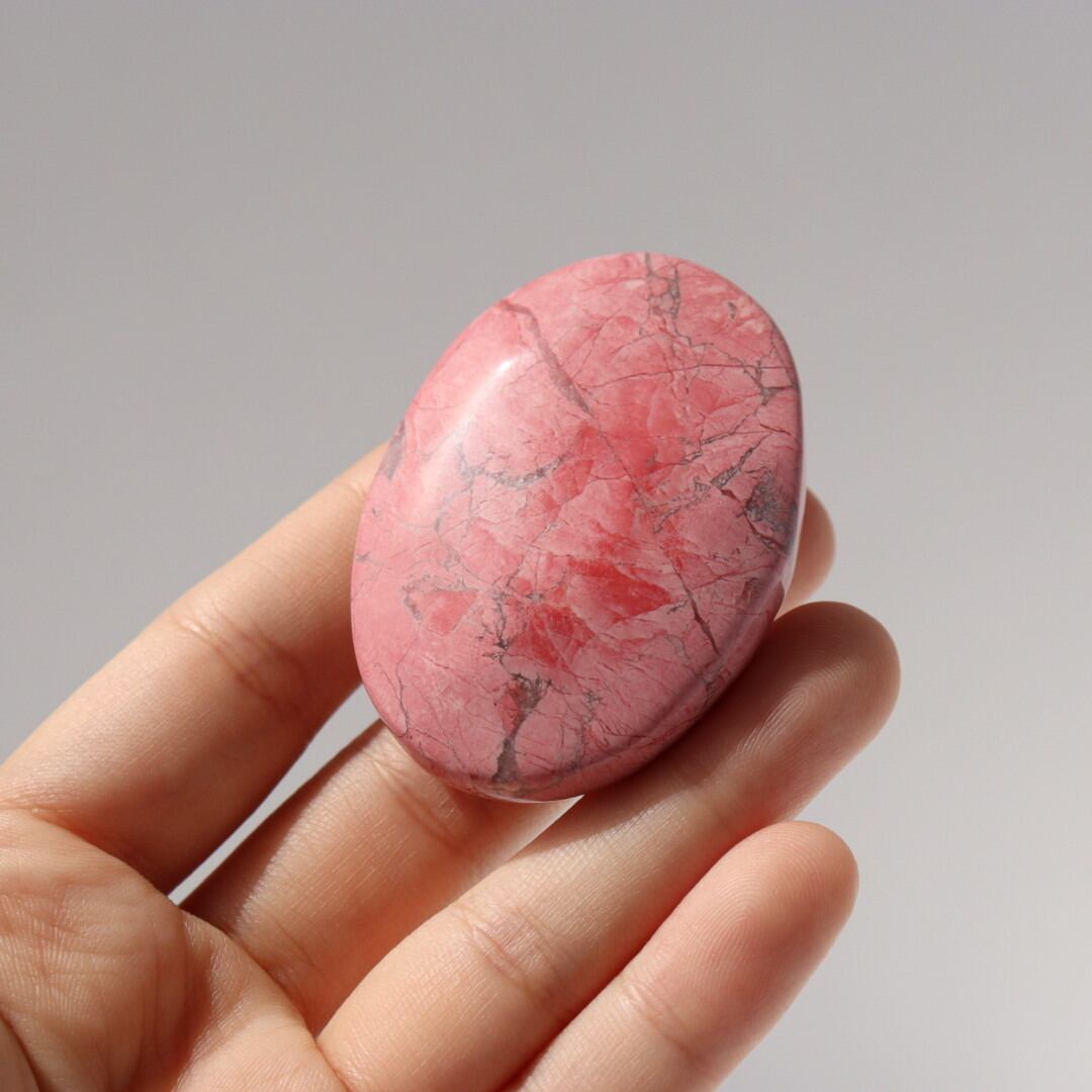 八重桜を思わせる色合いが印象的な、ピンクハウライトの握り石。