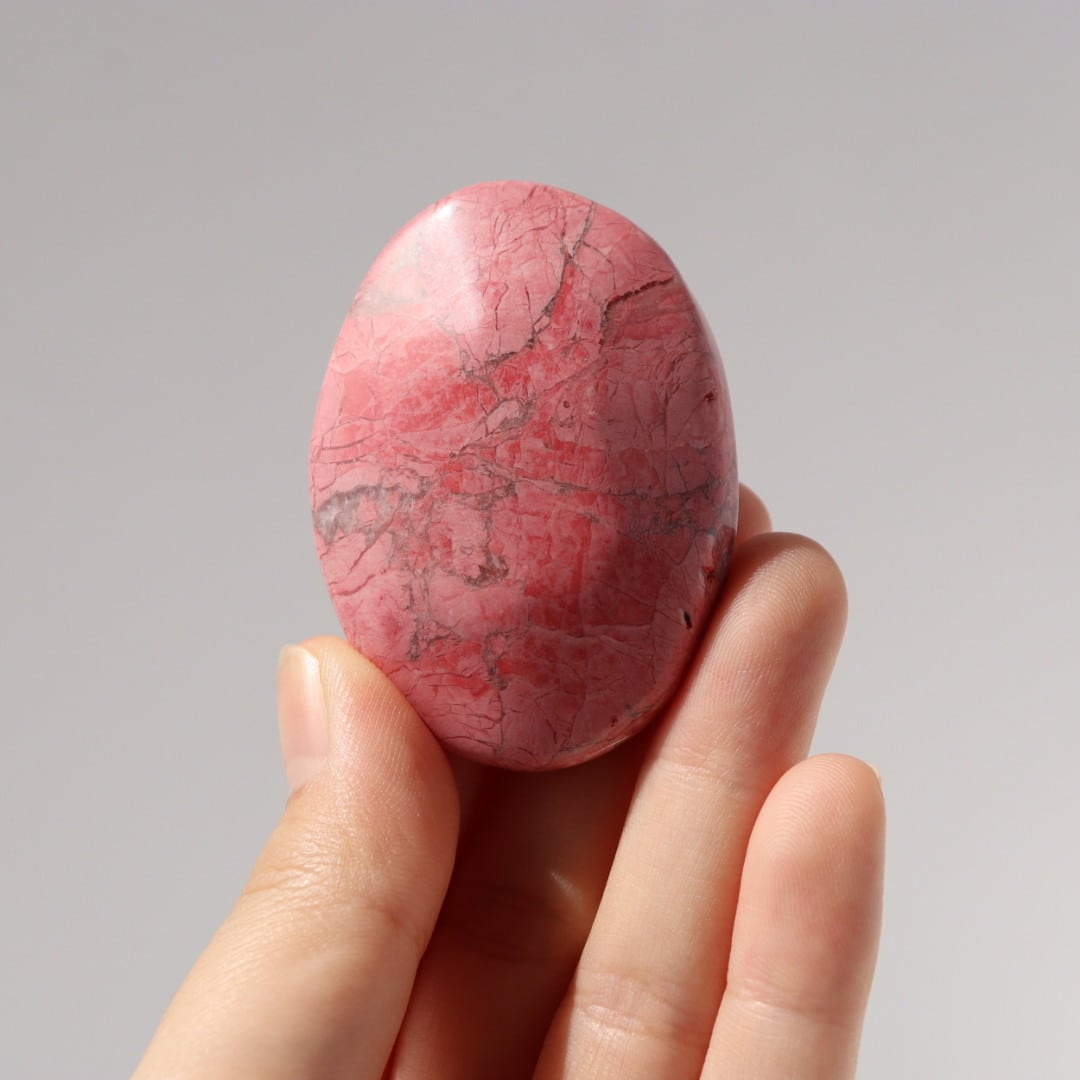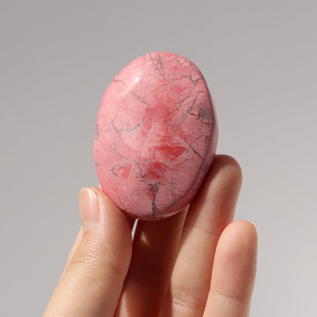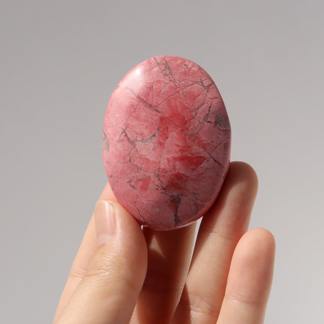八重桜を思わせる色合いが印象的な、ピンクハウライトの握り石。