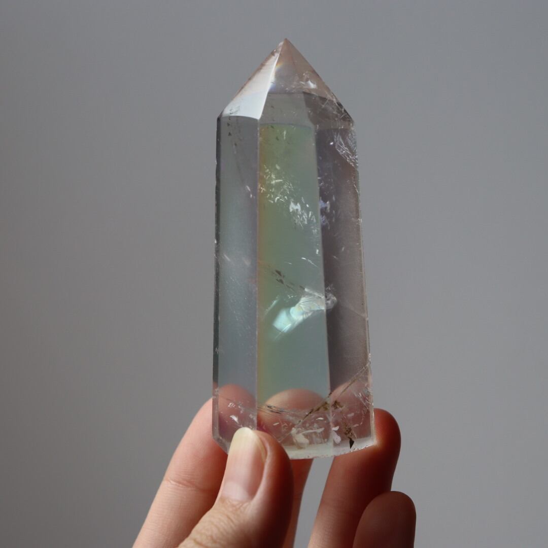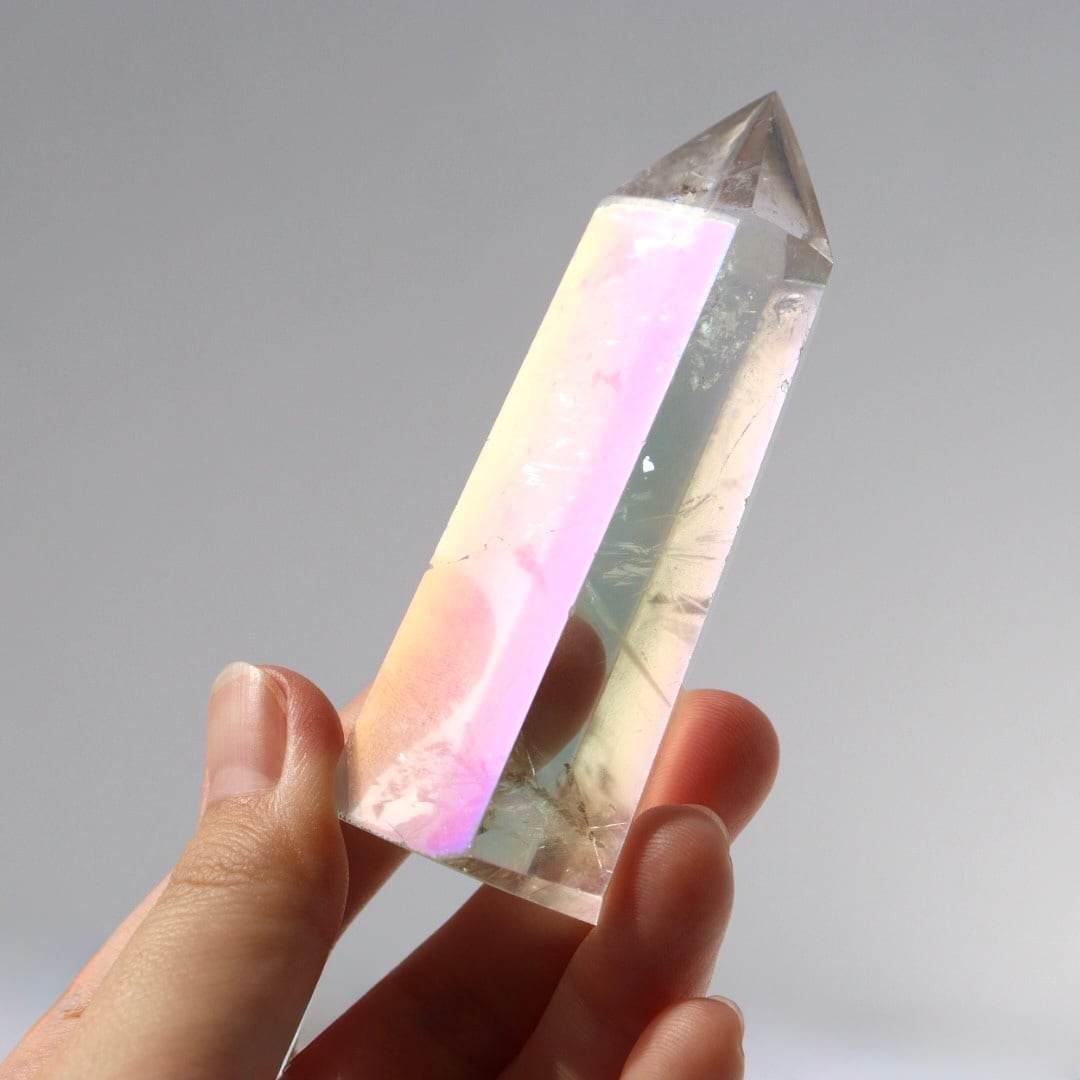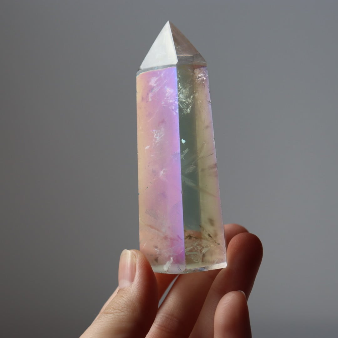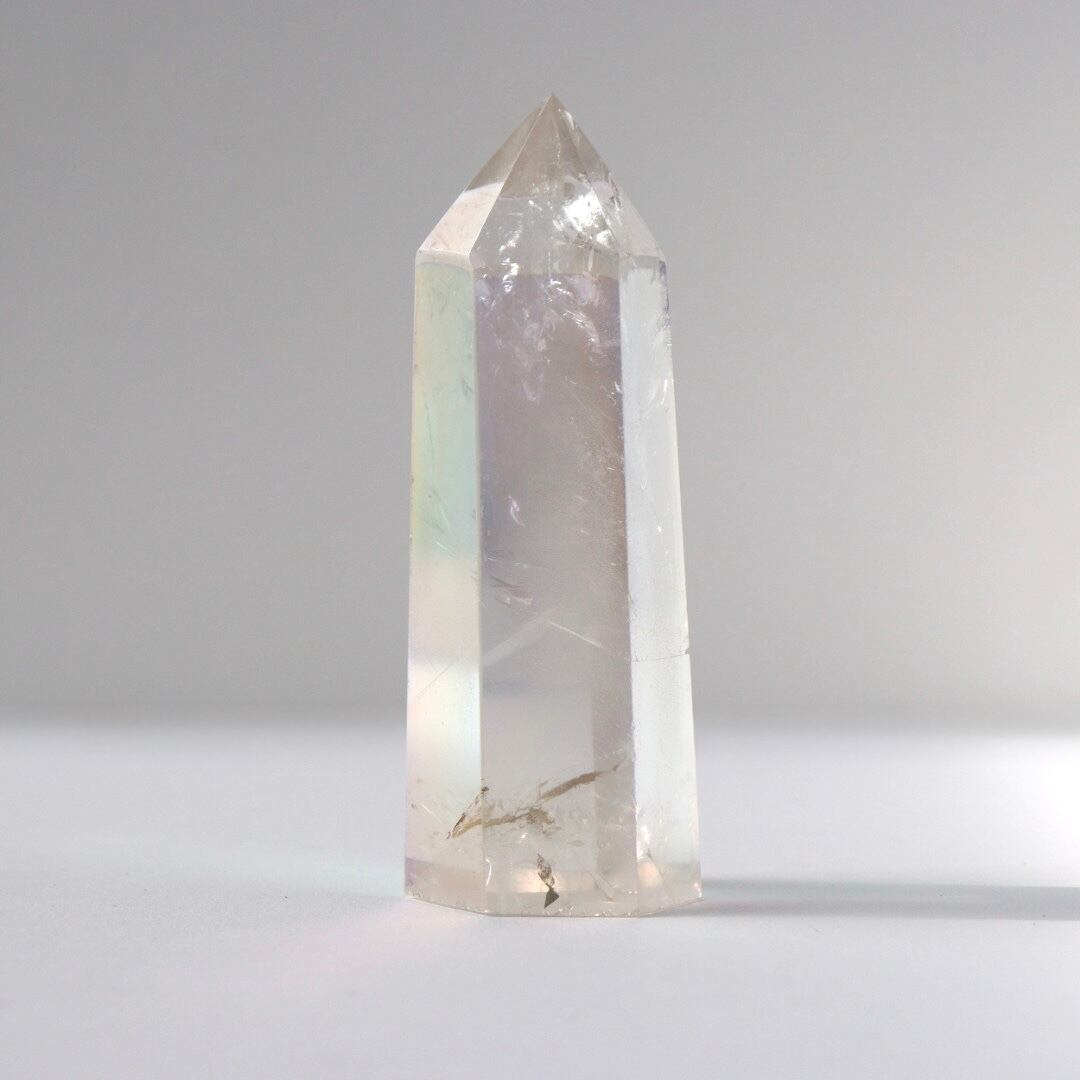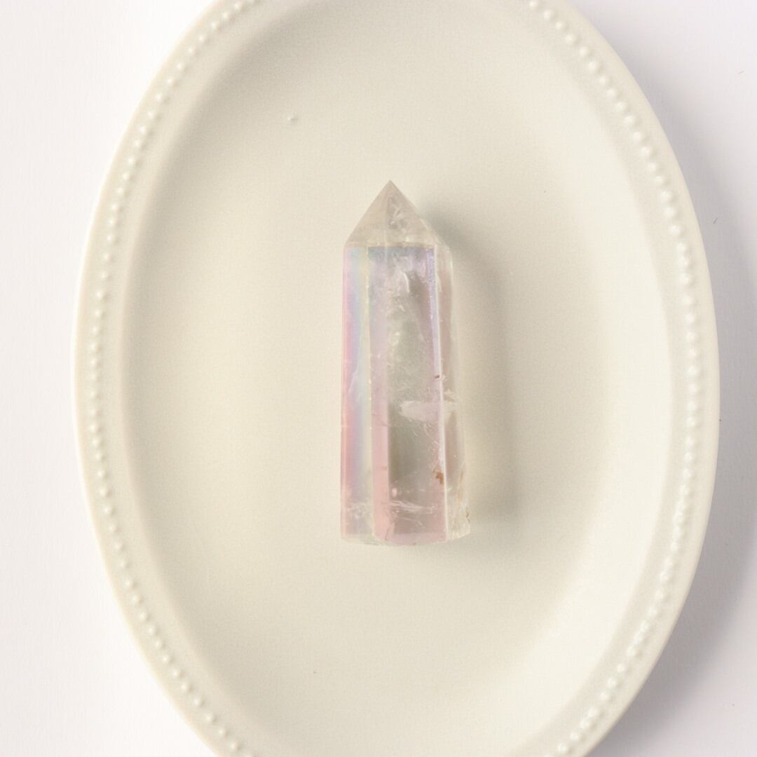 ハイクオリティなクリアクォーツに、やわらかなピンクカラーの虹色の光が浮かび上がる、エンジェルオーラクオーツのタワー。