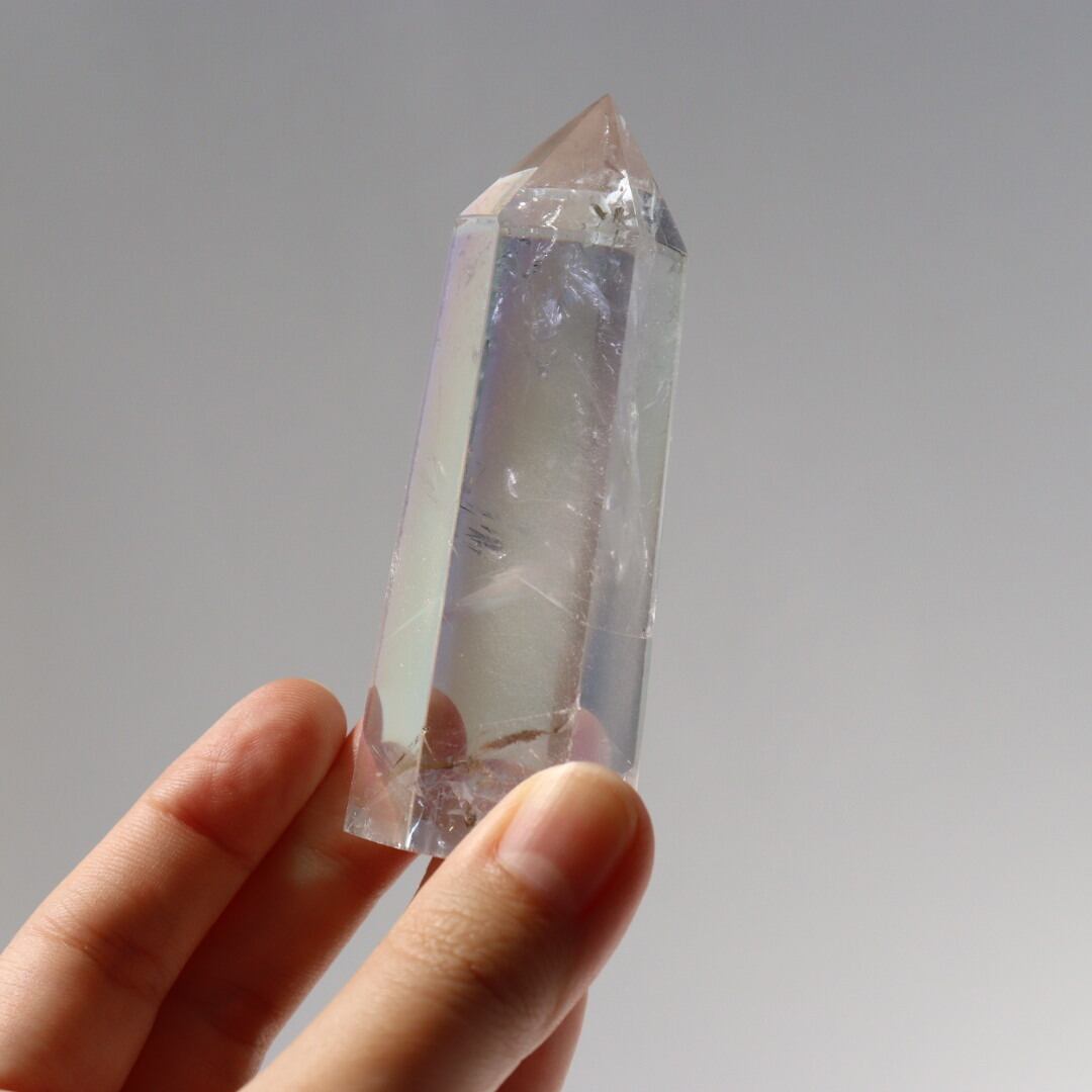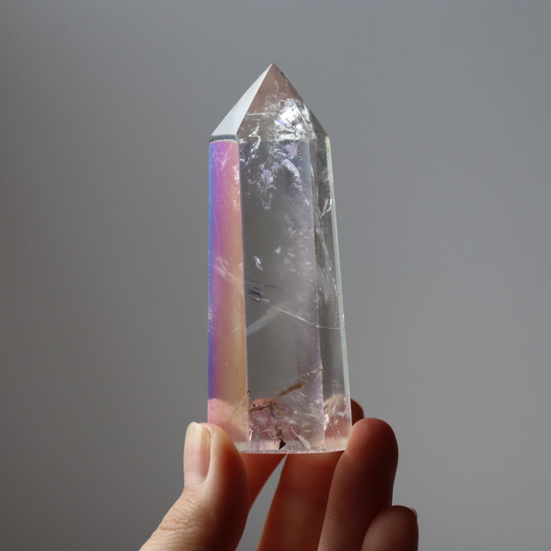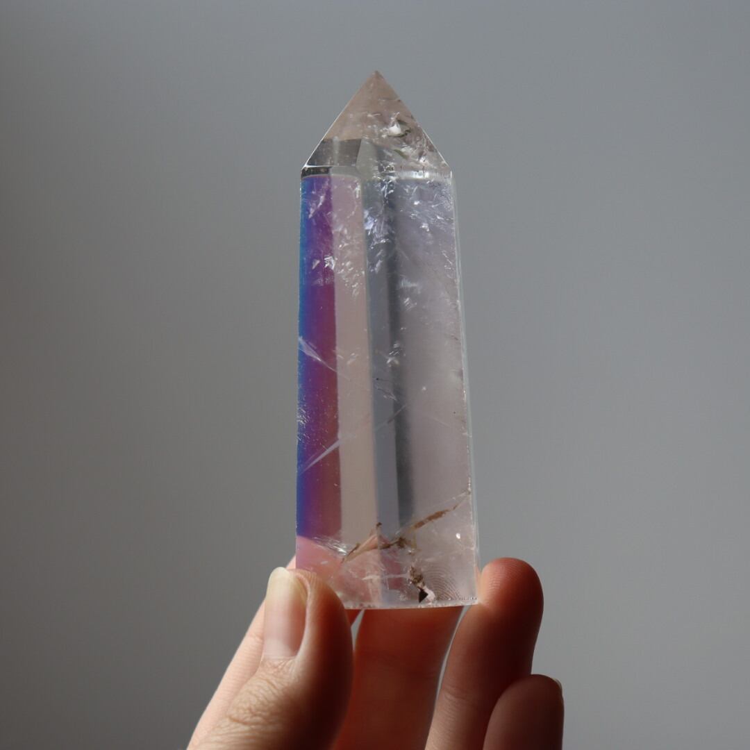 ベースとなるのは高い透明度をもつクリアクォーツで、オーラ加工によって繊細なプリズムが美しく映えます。