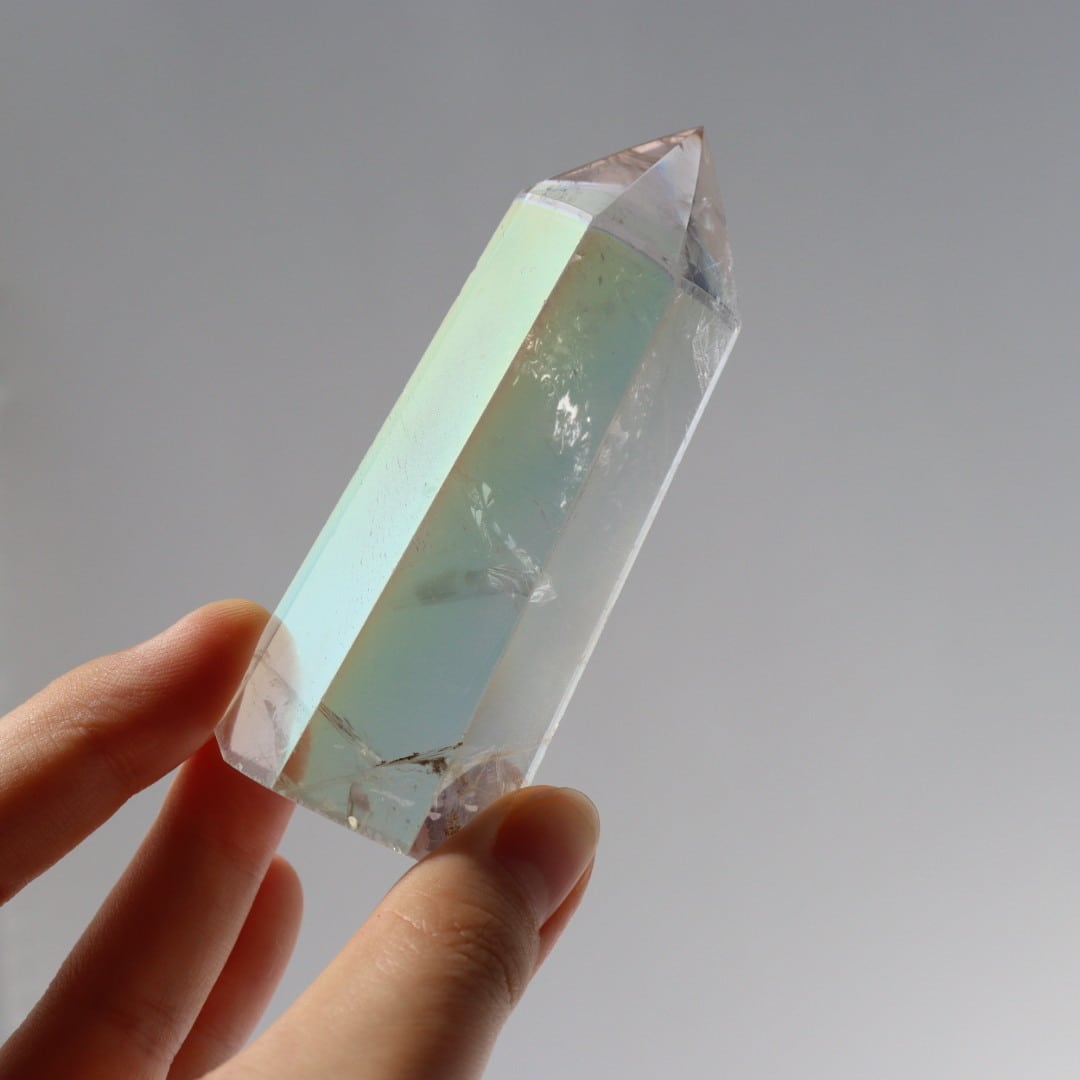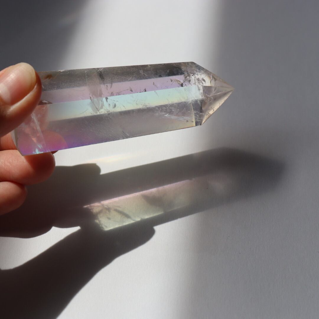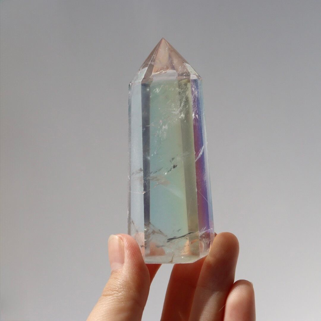 ベースとなるのは高い透明度をもつクリアクォーツで、オーラ加工によって繊細なプリズムが美しく映えます。