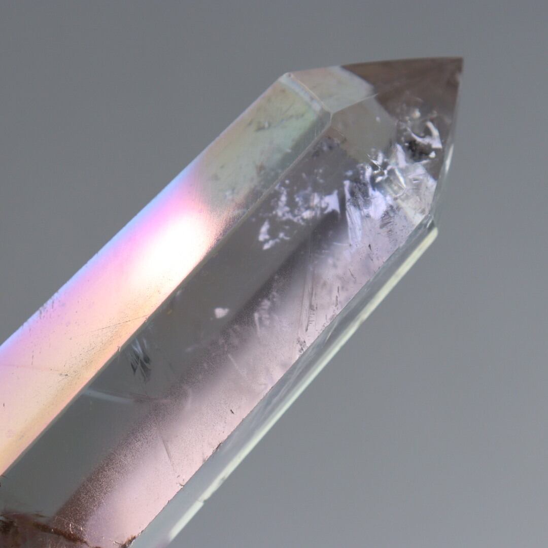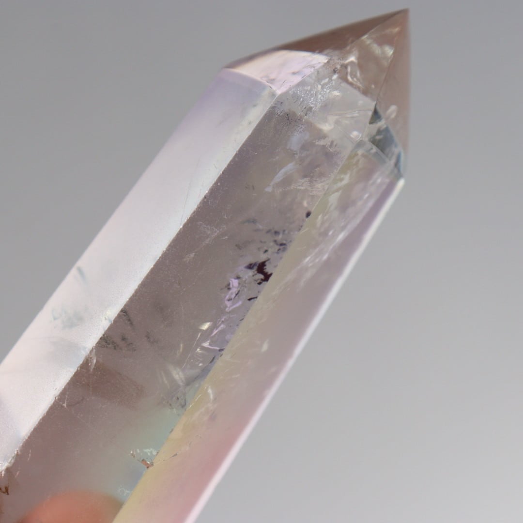 こちらは、透明度が高くインクルージョンも美しいクリアクオーツに、ピンクのニュアンスを含んだエンジェルオーラが施されたタワー。
