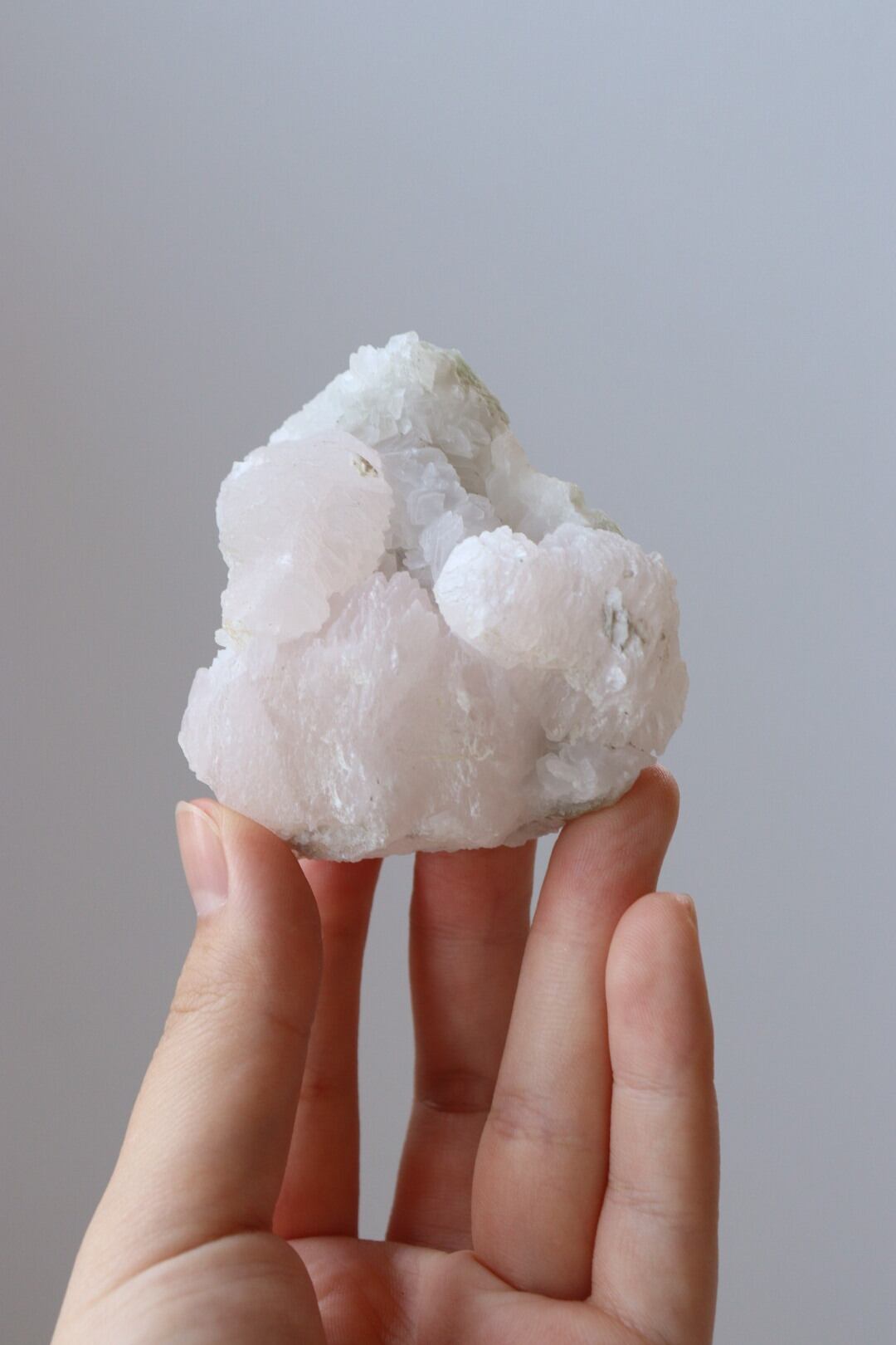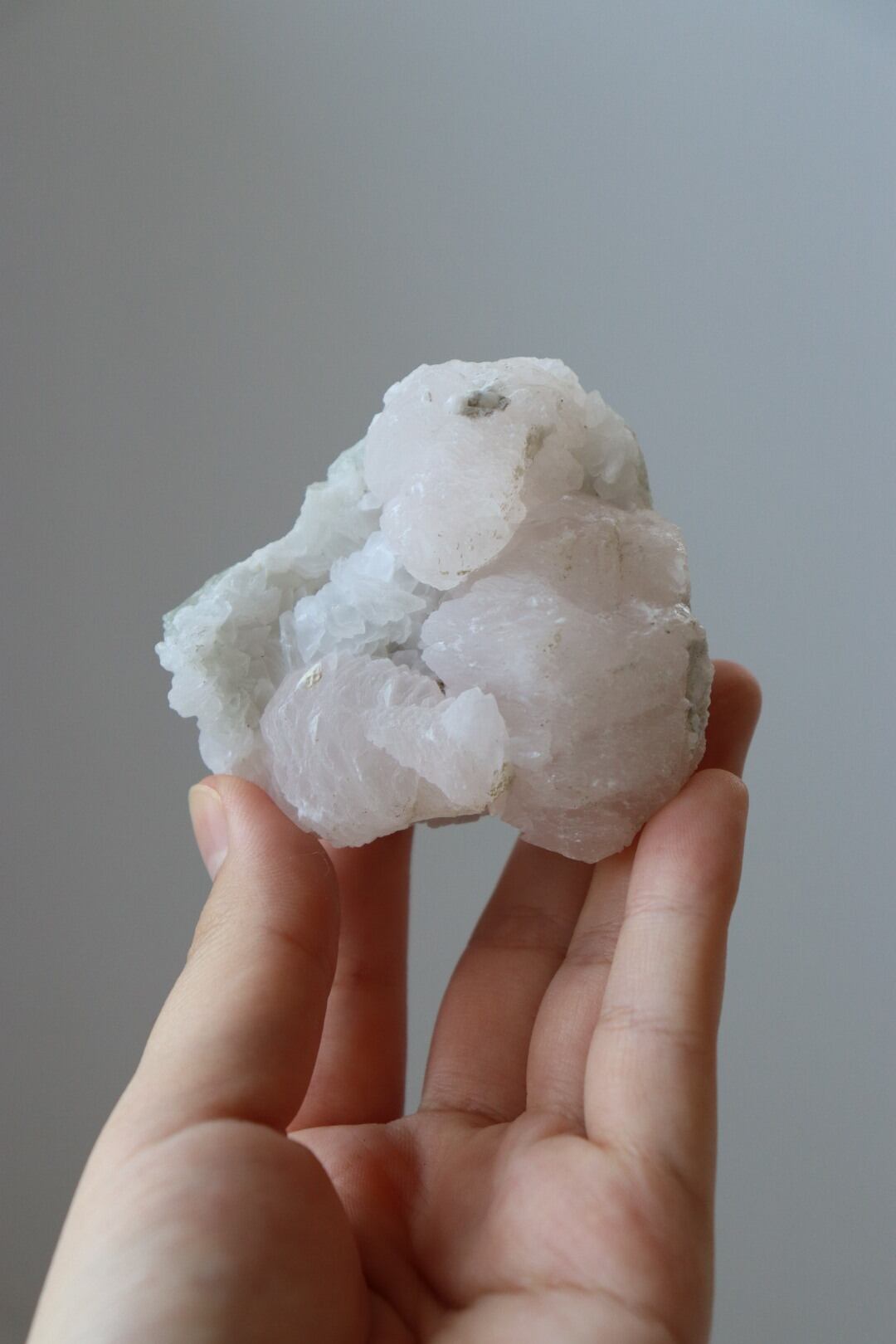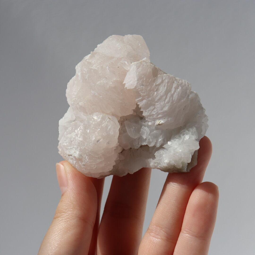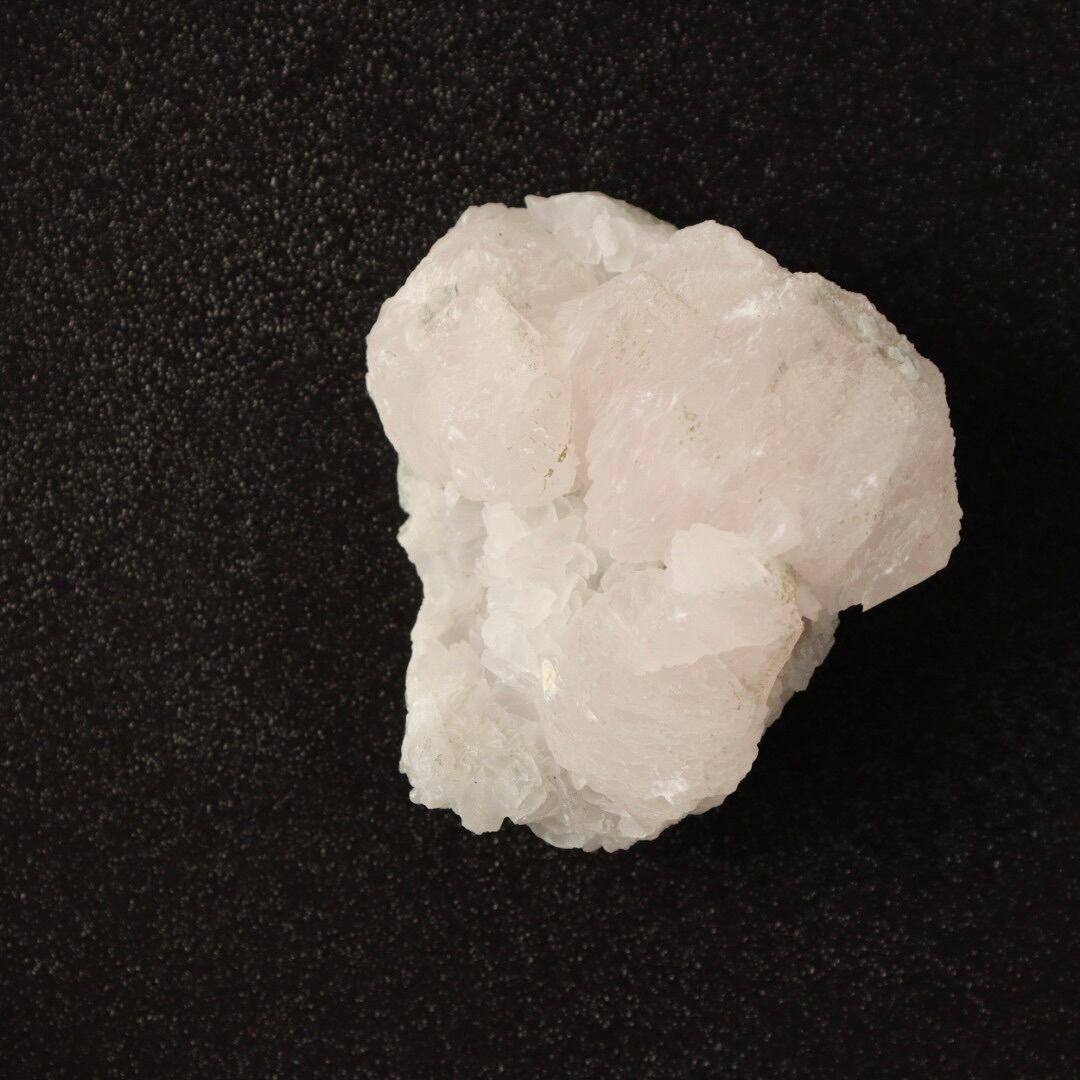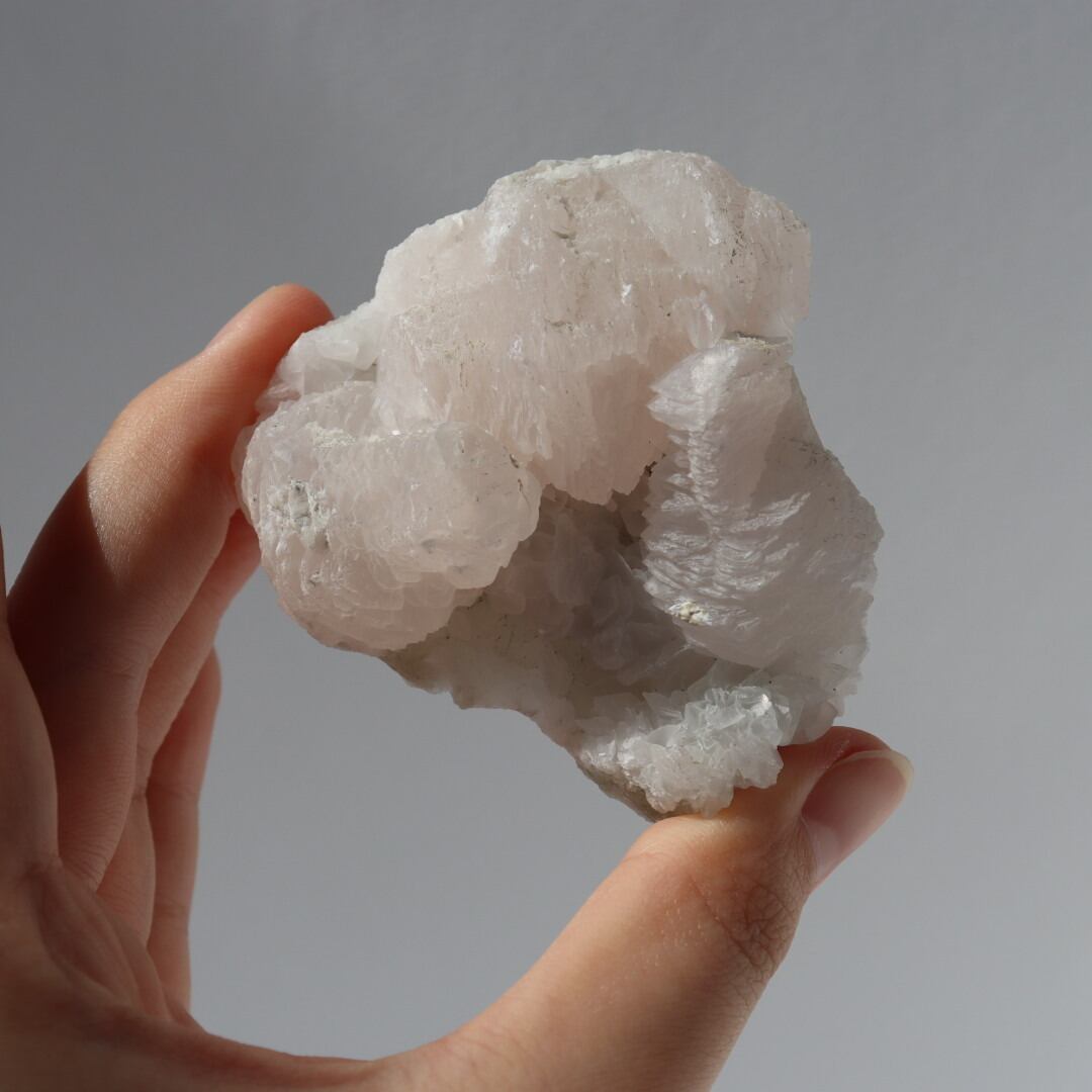 ふわりと花びらが重なったような、淡いピンクが印象的なピンクカルサイトの原石。