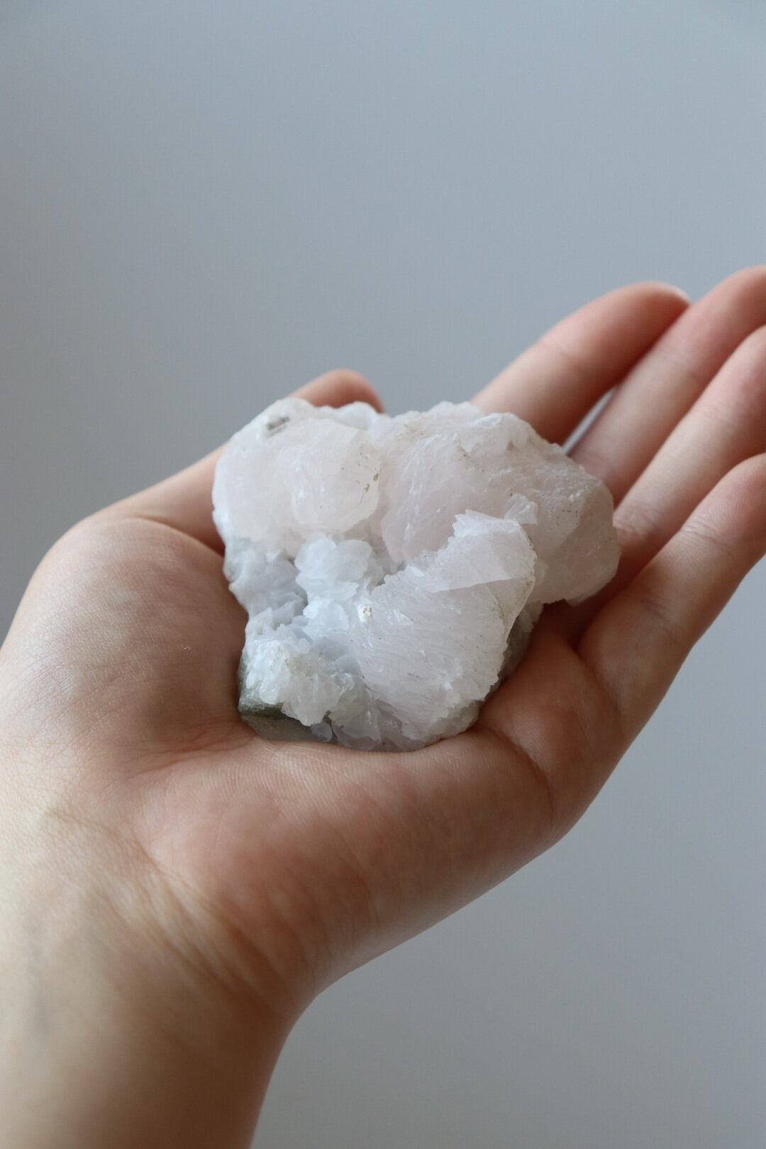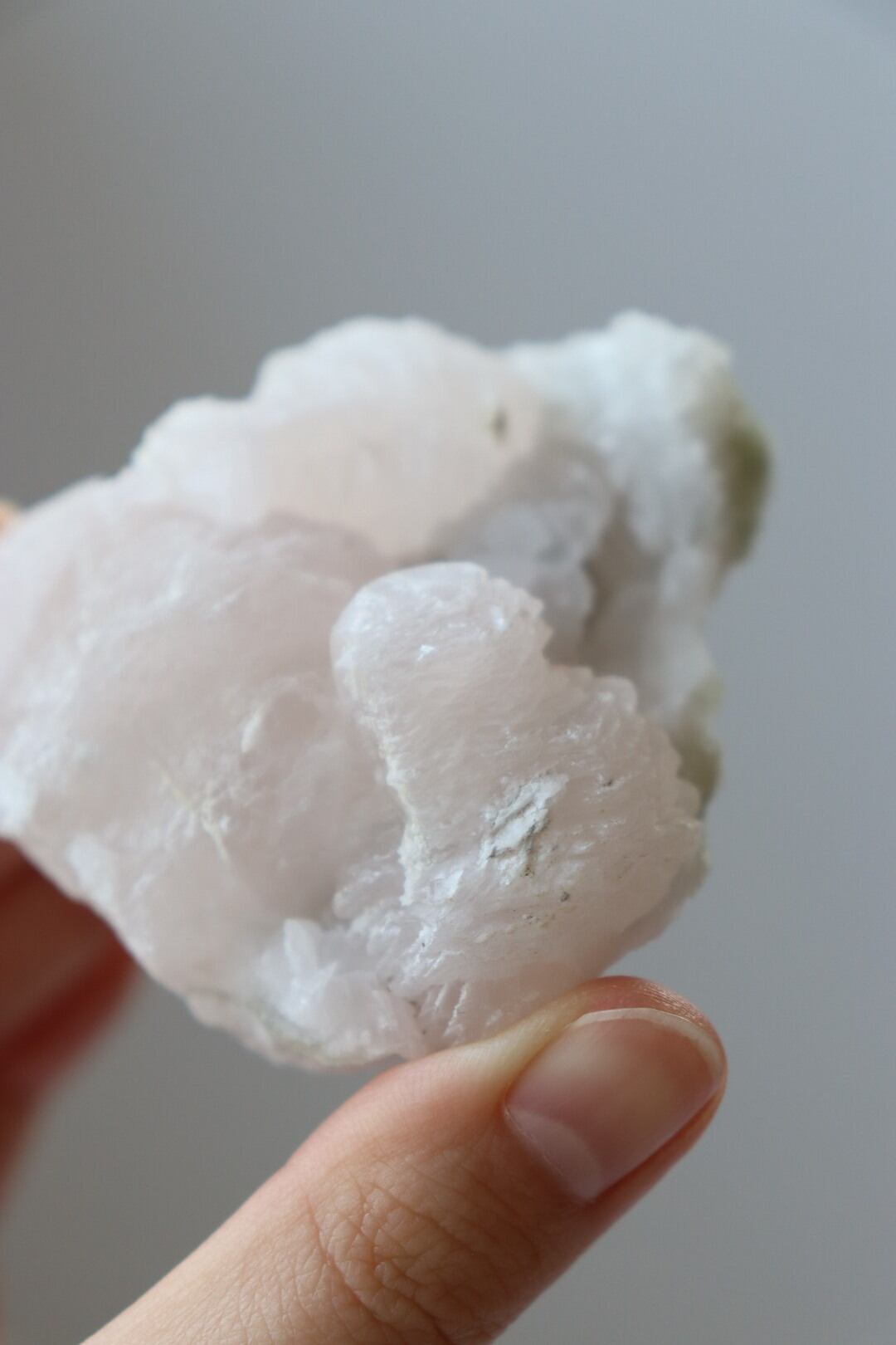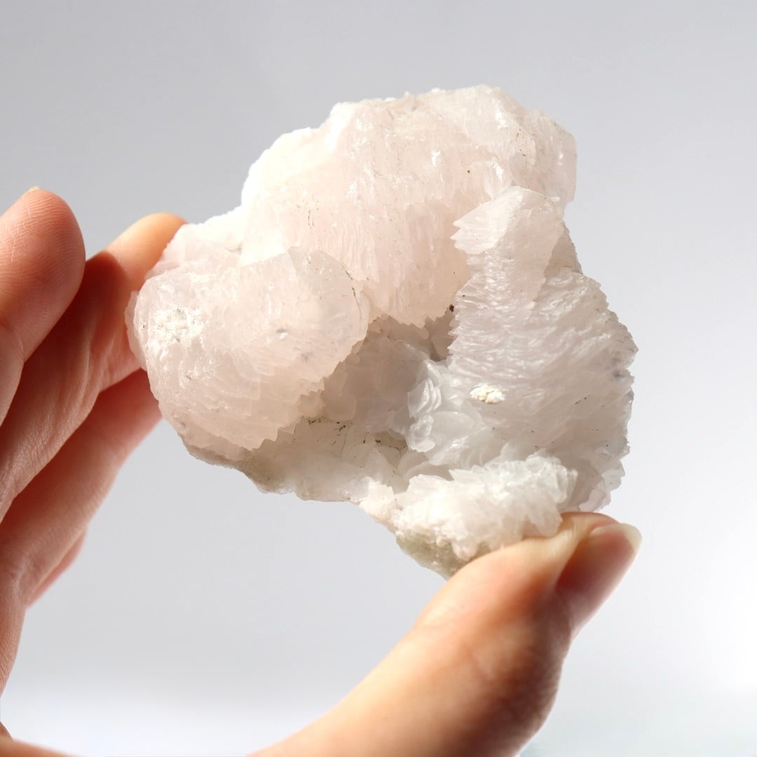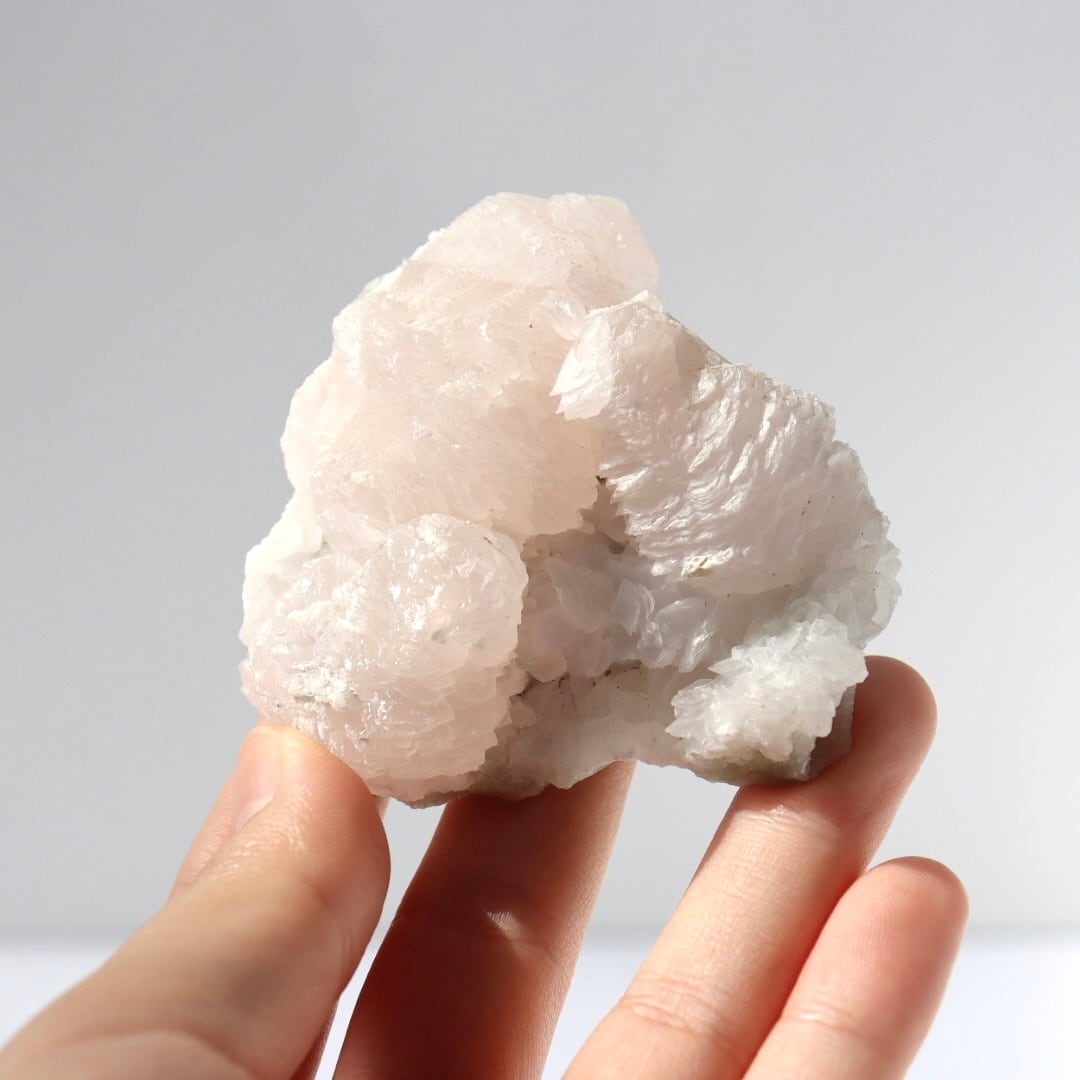 ふわりと花びらが重なったような、淡いピンクが印象的なピンクカルサイトの原石。