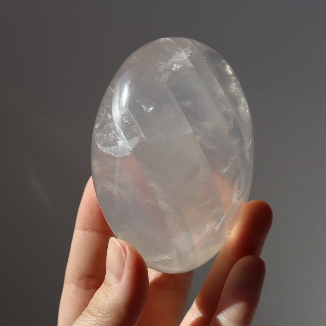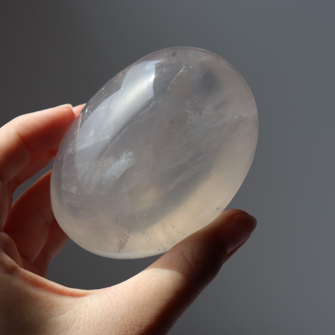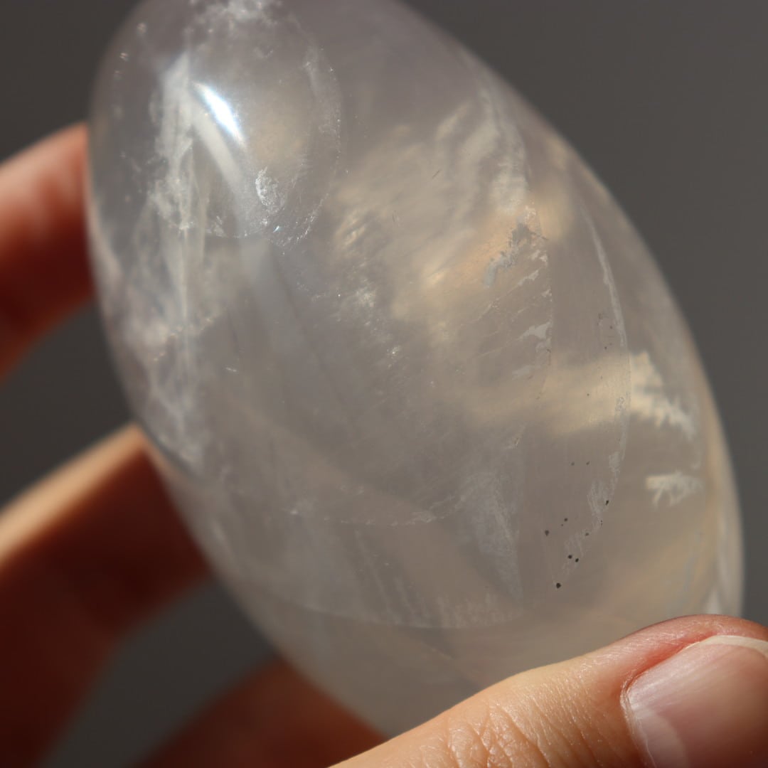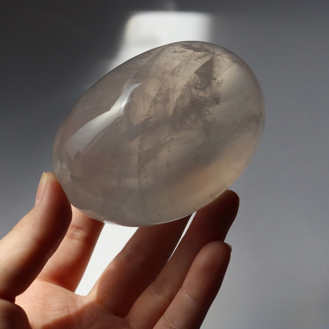 透き通る結晶が美しいアイスローズクォーツの握り石。