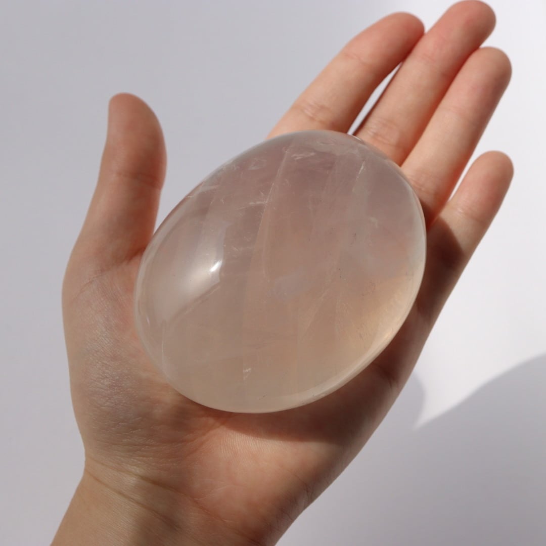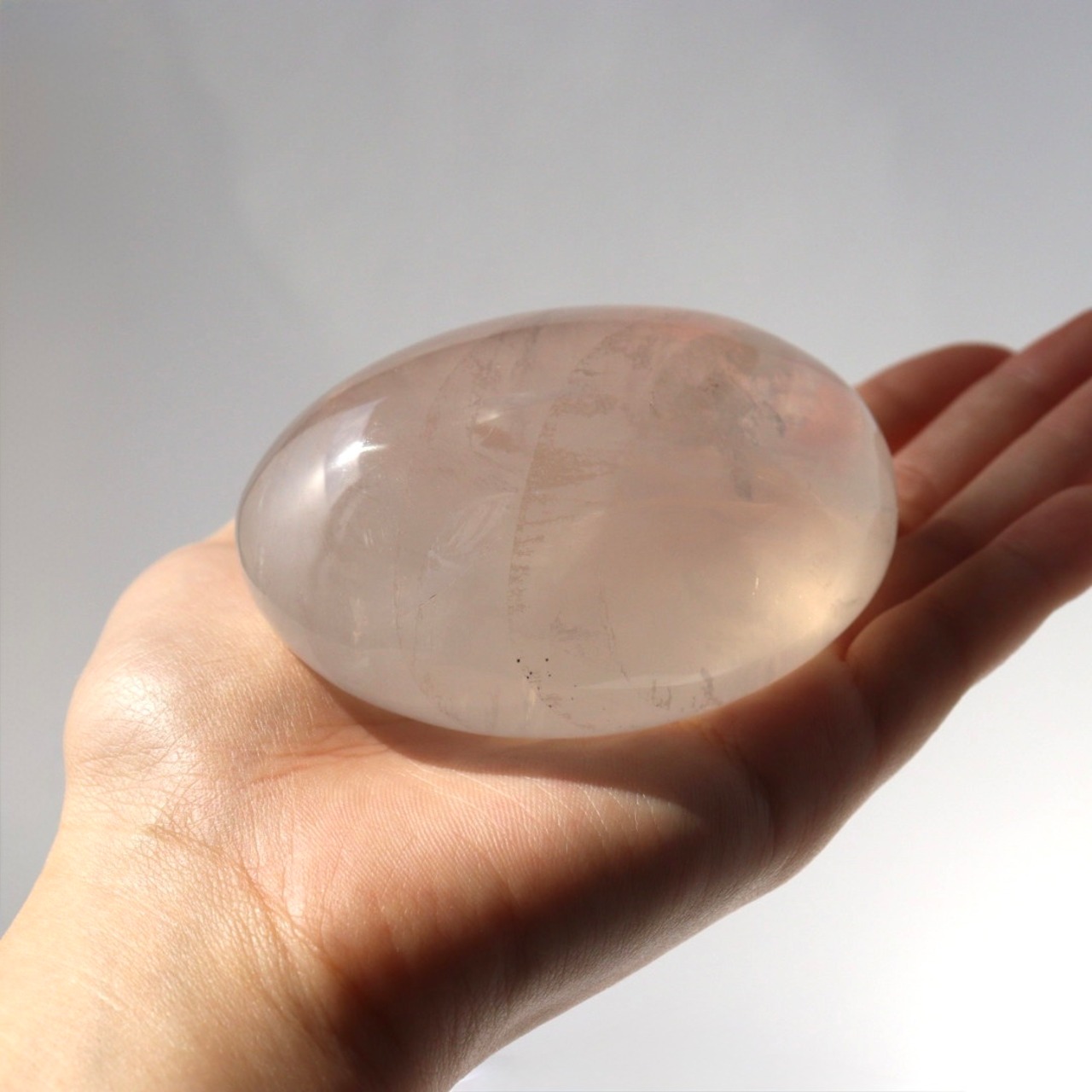 こちらは、水面に浮かぶ桜の花びらのような淡いピンクをもつ、大きな大きなローズクォーツの握り石。