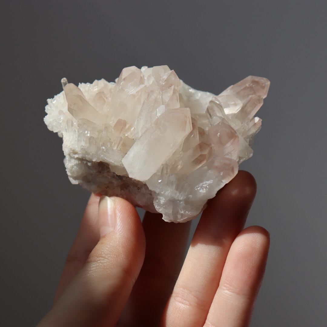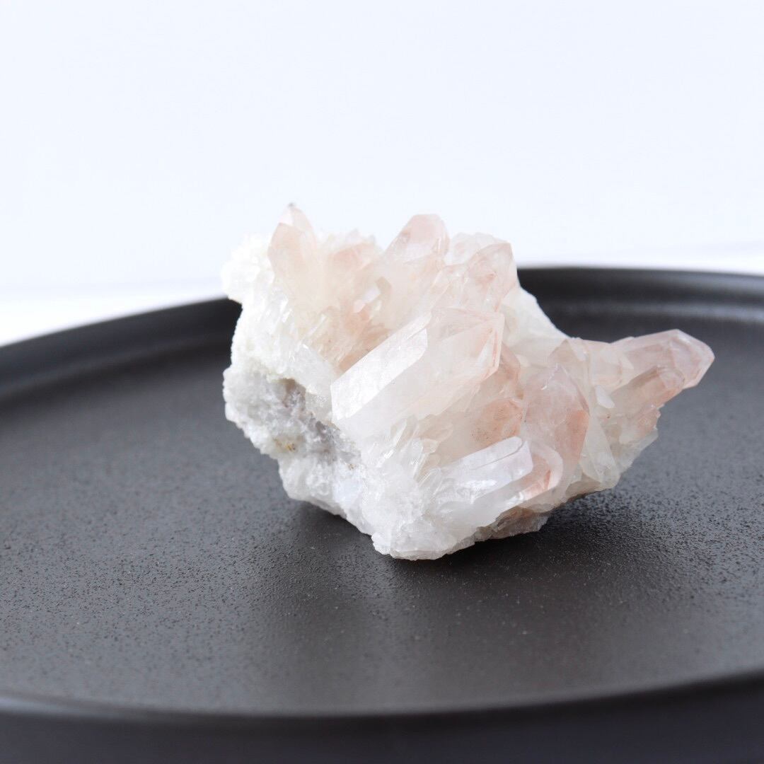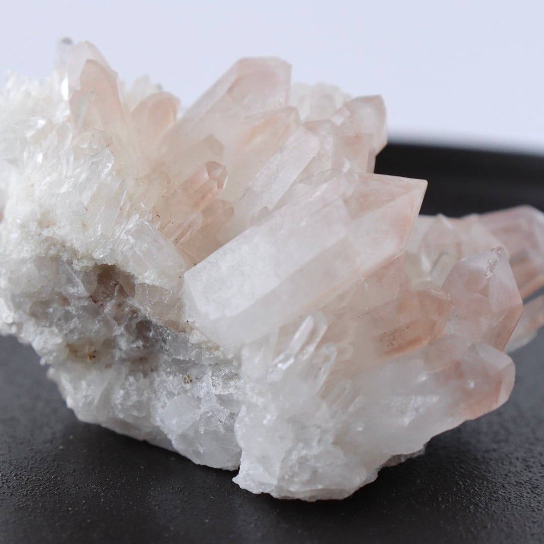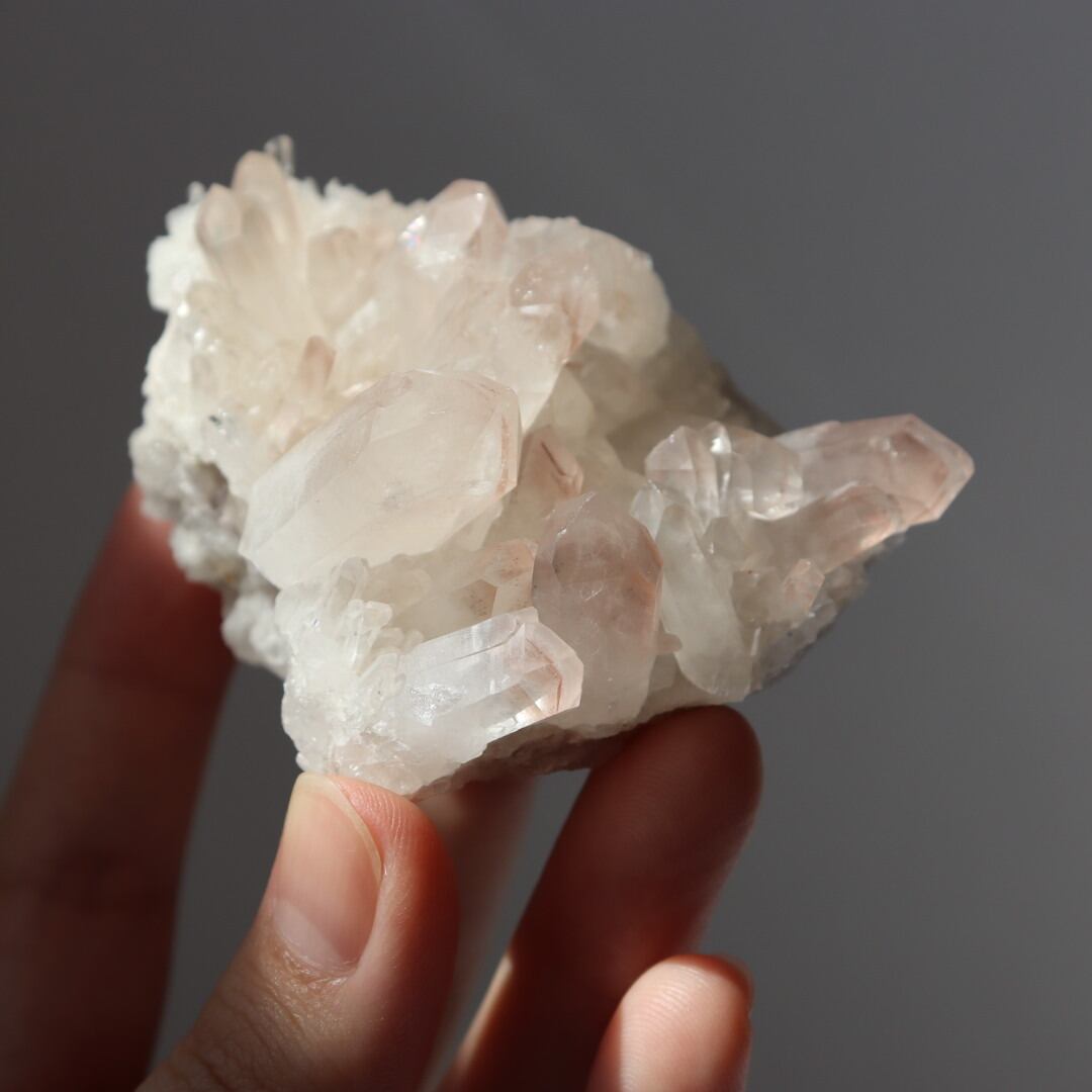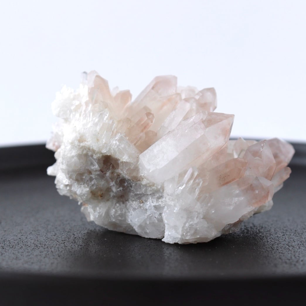 ほんのり桜色のファントムと大小様々な美しい結晶たち。大変見応えのあるリチウムクォーツのクラスターです。