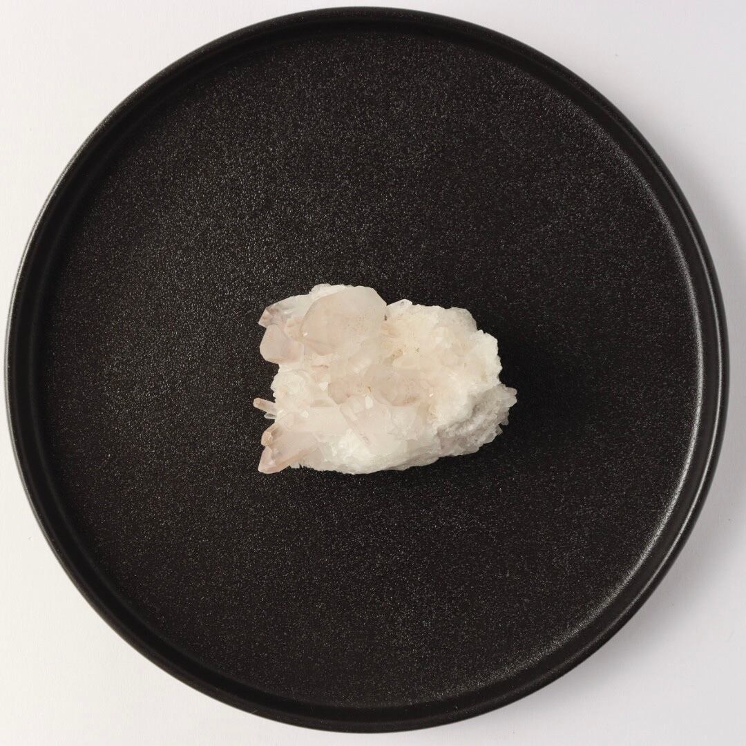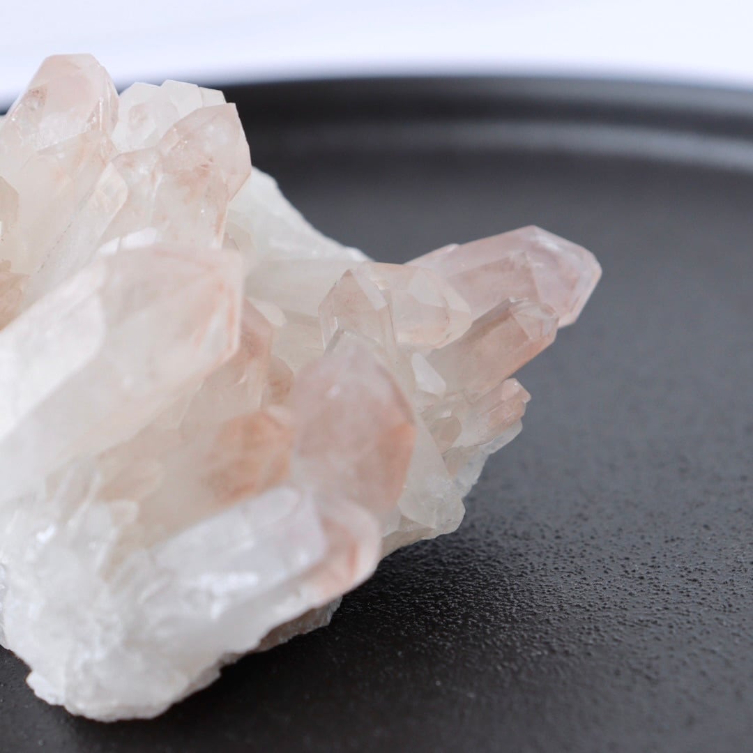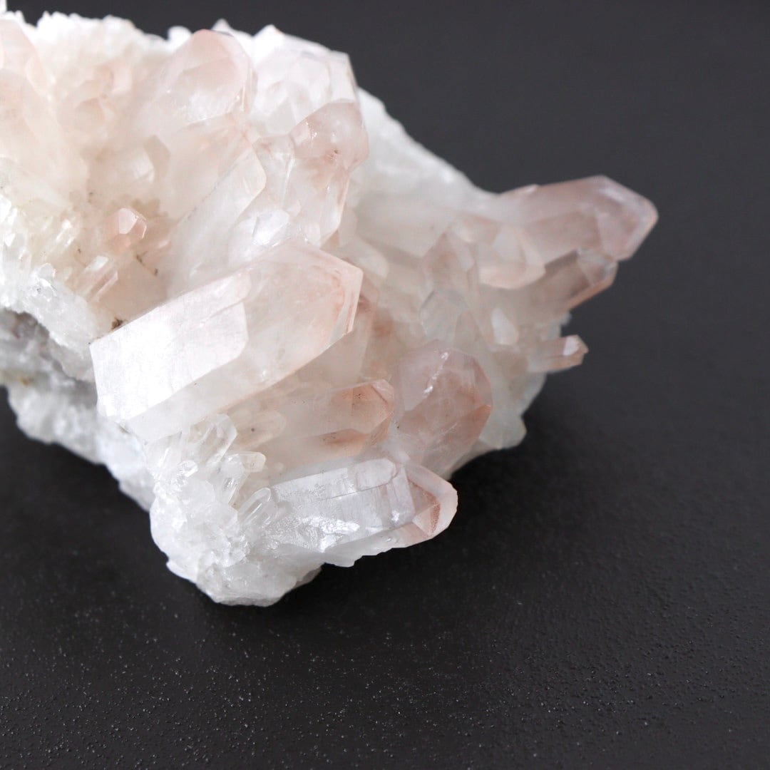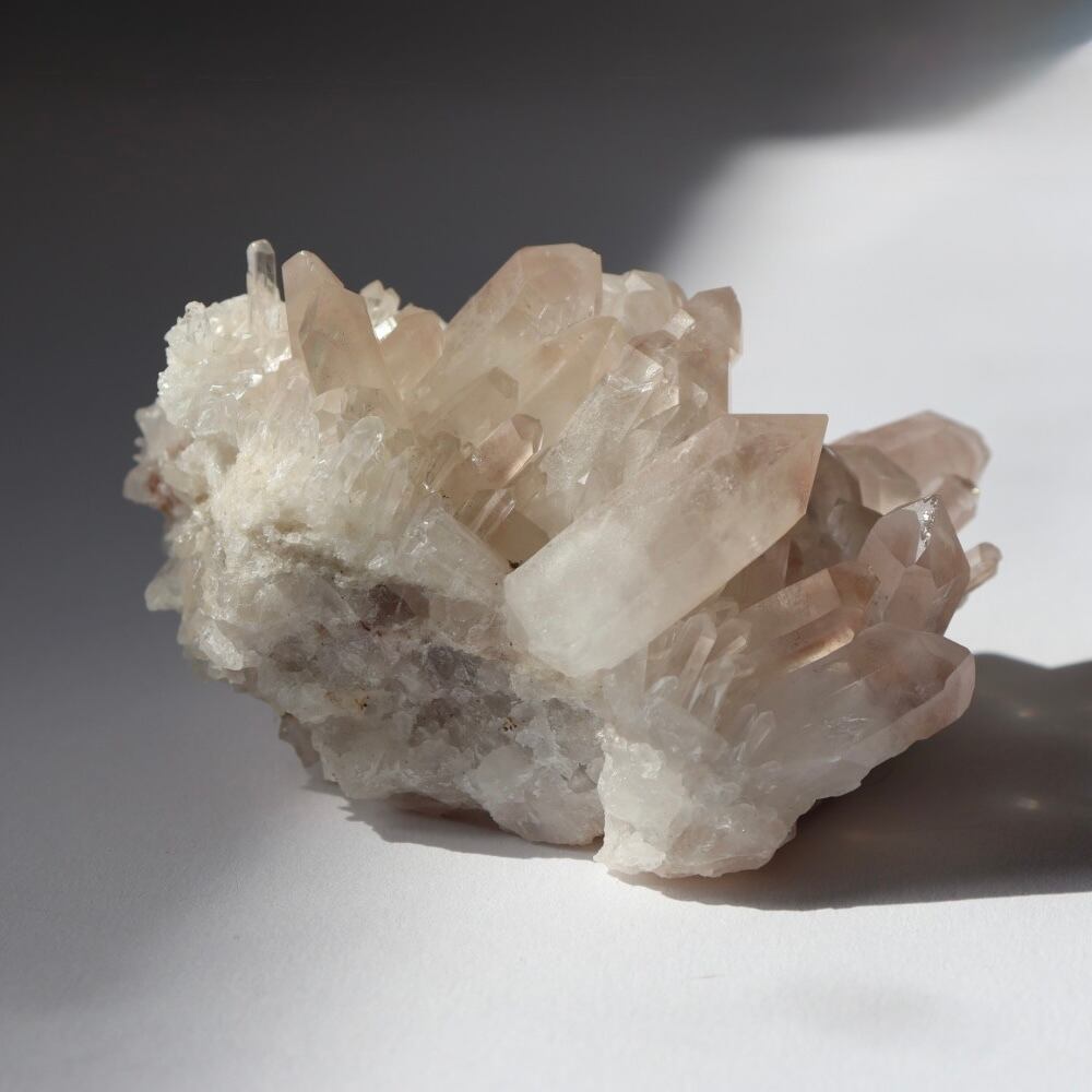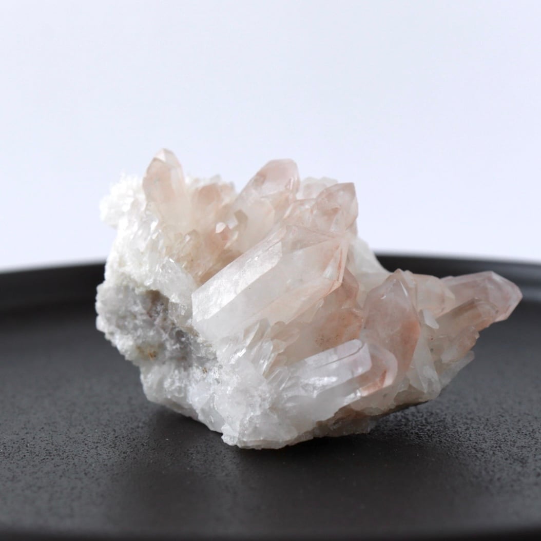 ほんのり桜色のファントムと大小様々な美しい結晶たち。大変見応えのあるリチウムクォーツのクラスターです。