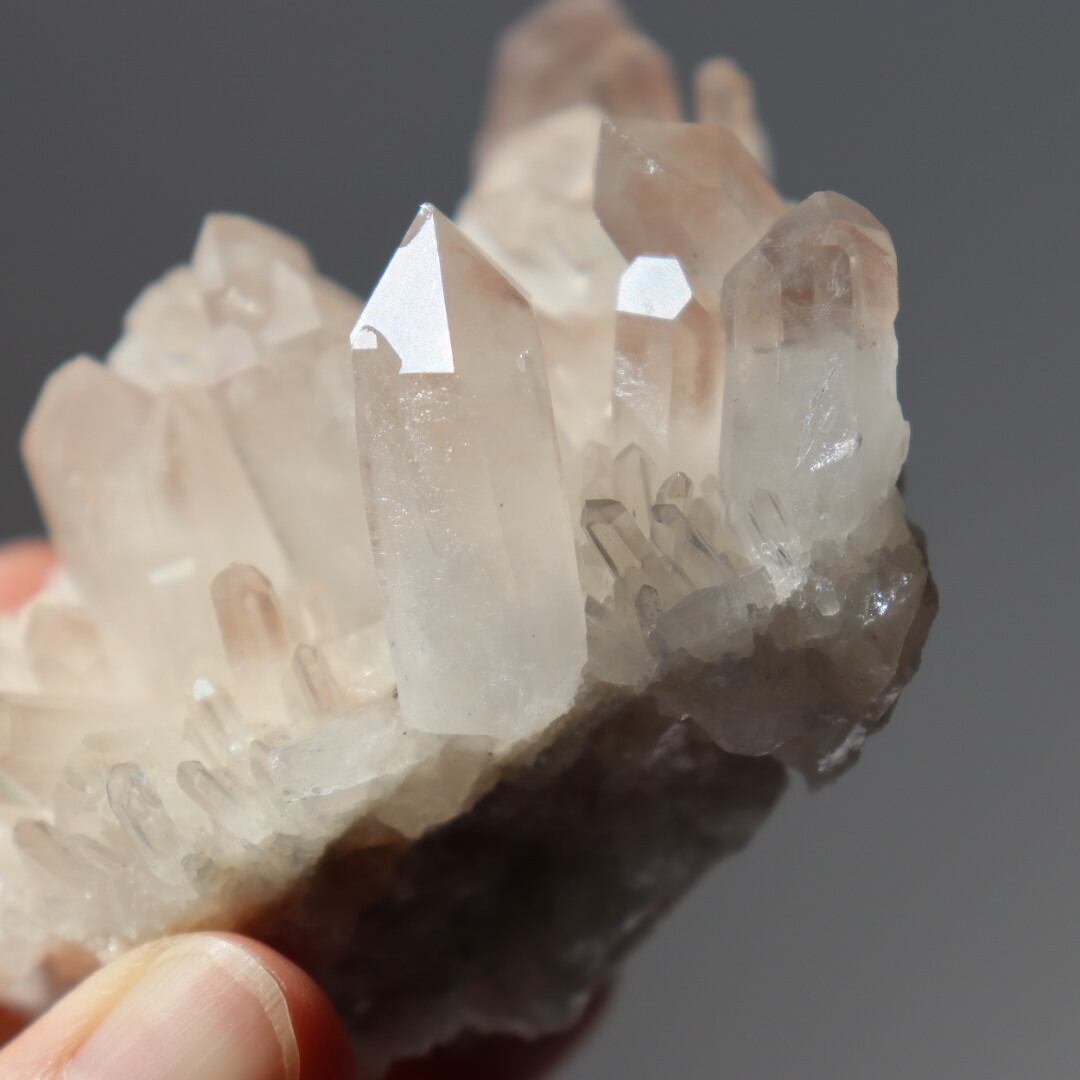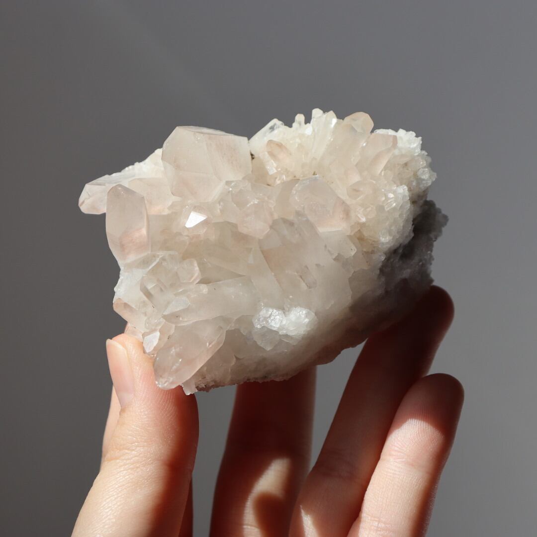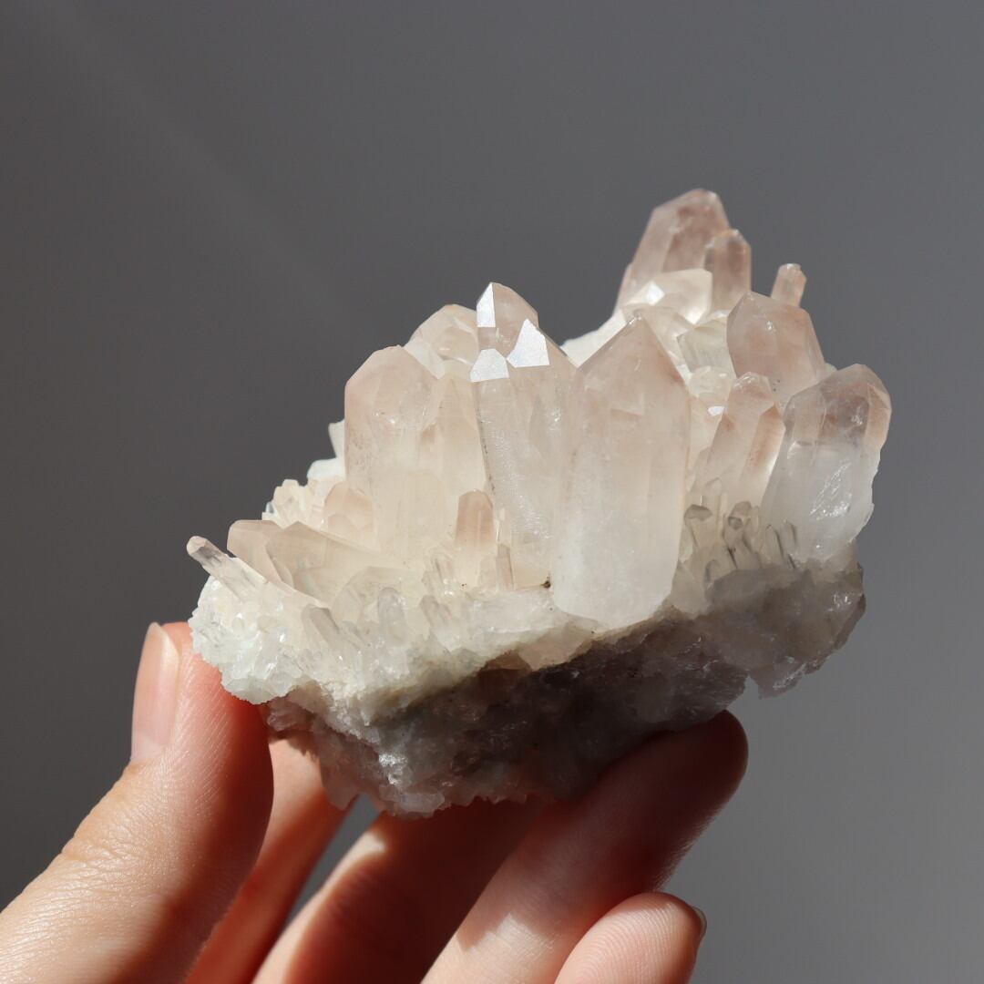 多くの結晶内で層のようにピンクが現れており、クォーツが成長していく様子をはっきりと見ることができます。