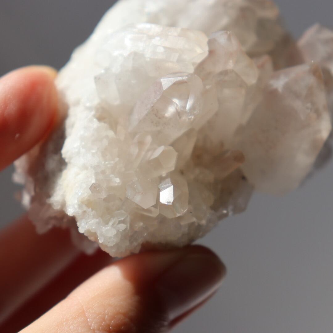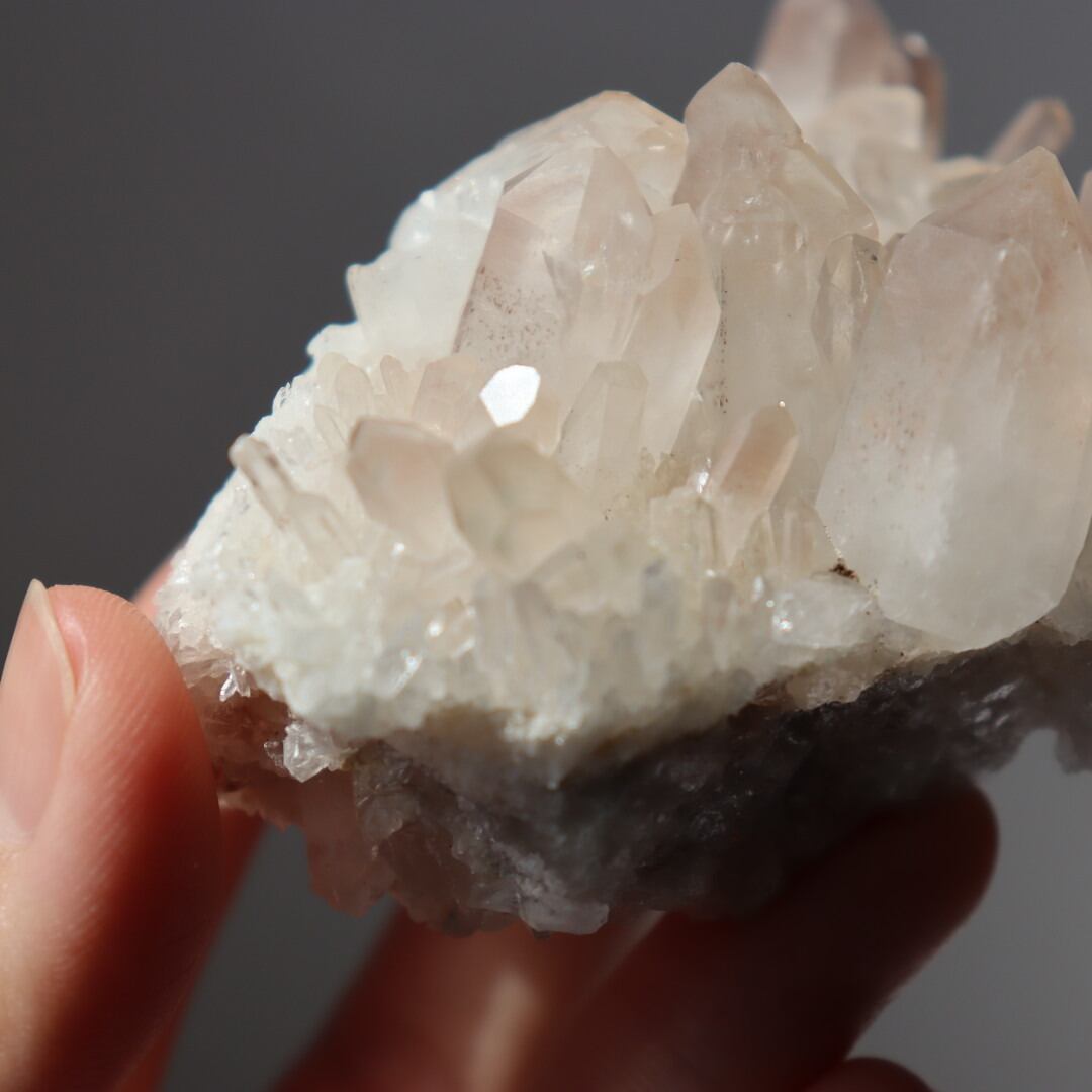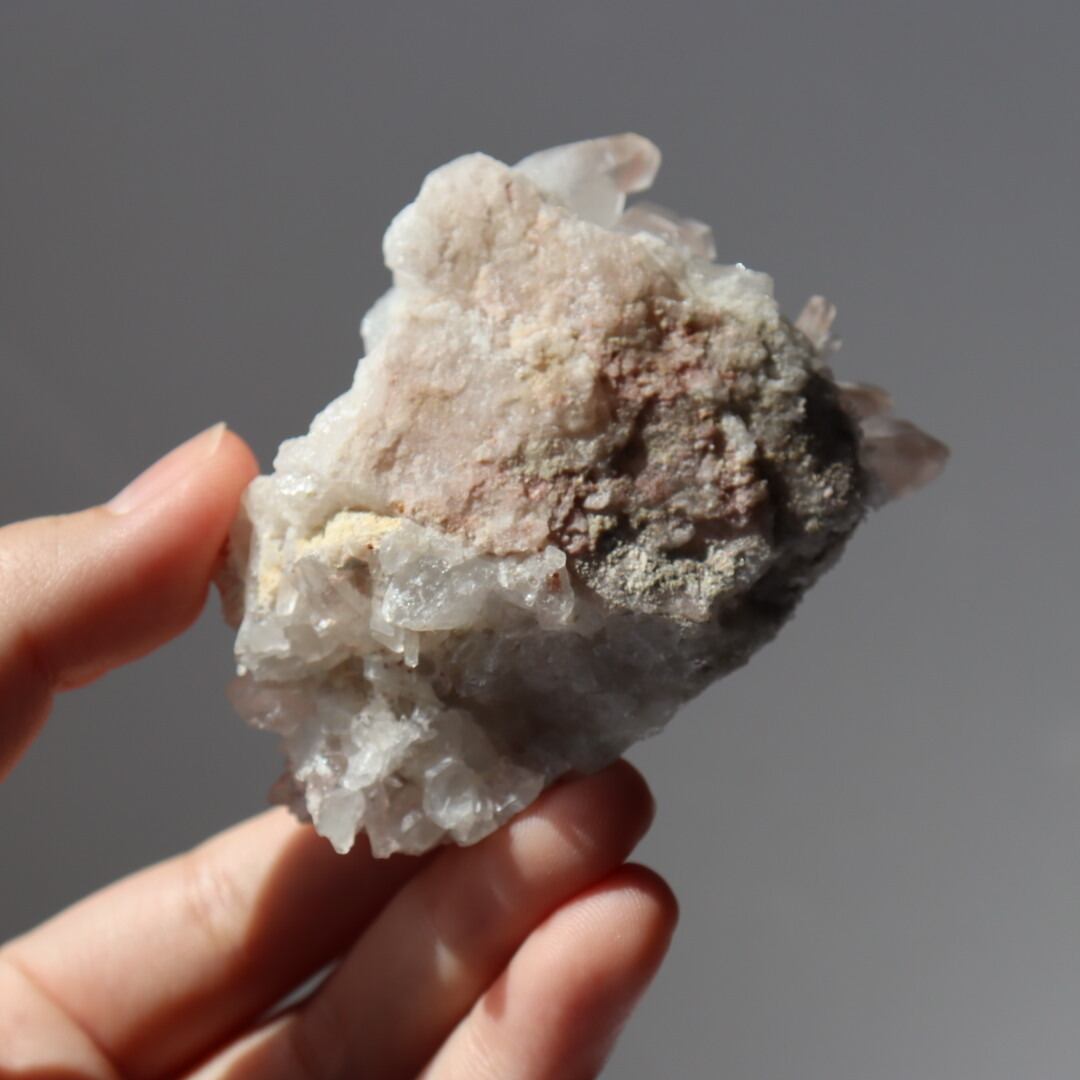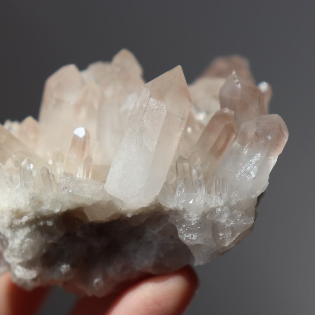 多くの結晶内で層のようにピンクが現れており、クォーツが成長していく様子をはっきりと見ることができます。