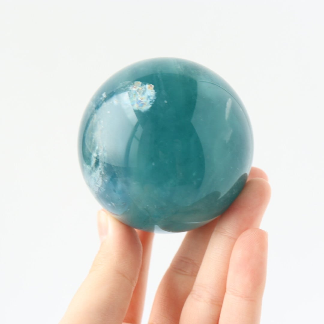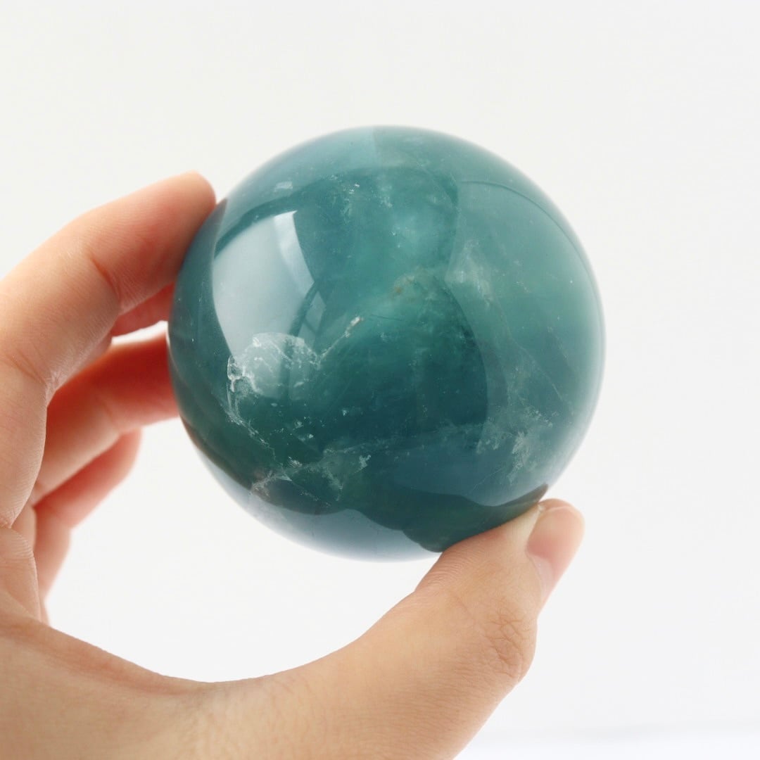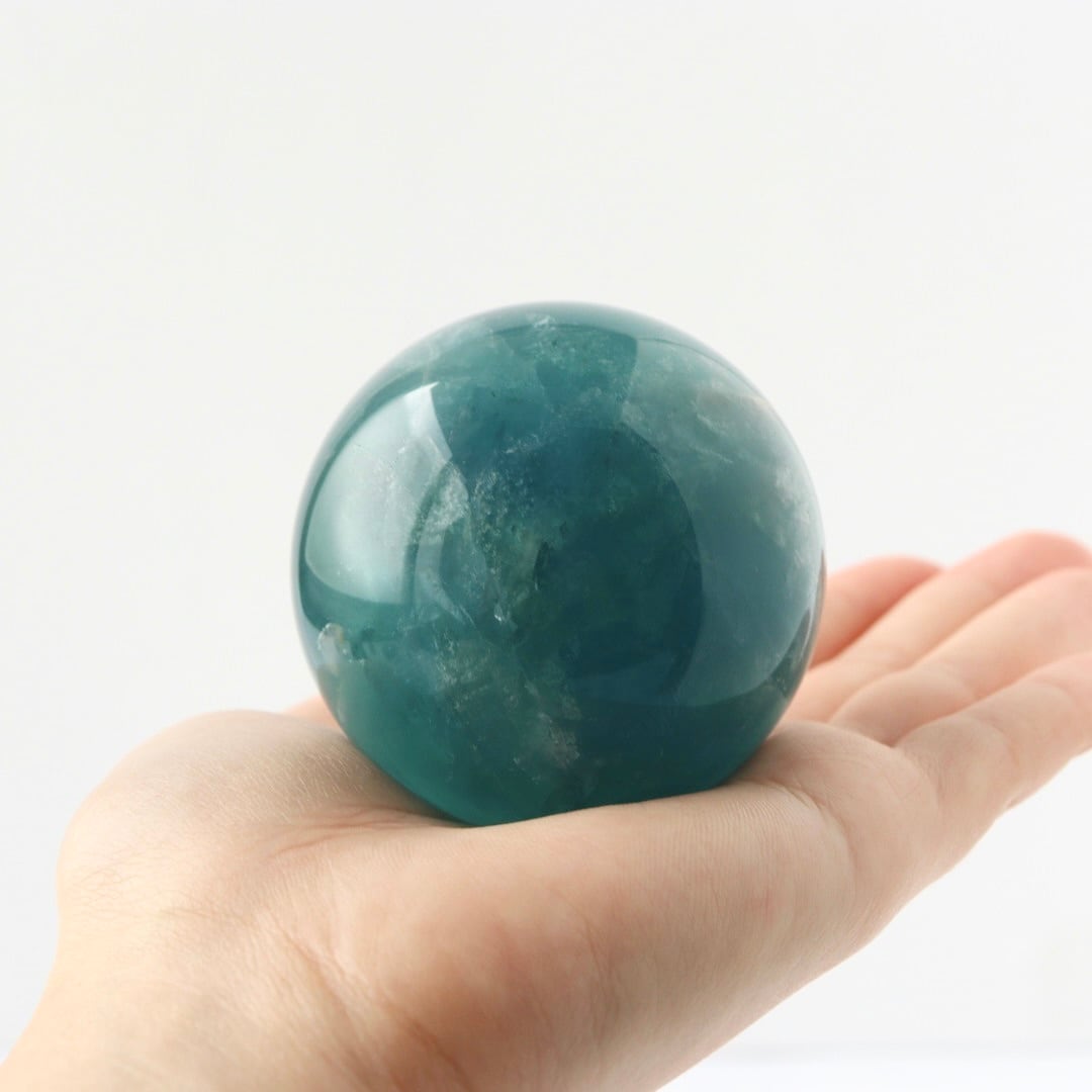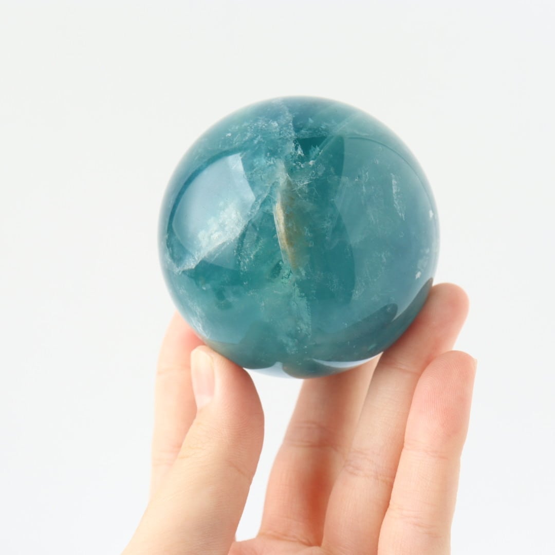 深い海を覗き込んでいるかのような、濃く美しいブルーが広がるブルーフローライトのスフィア。