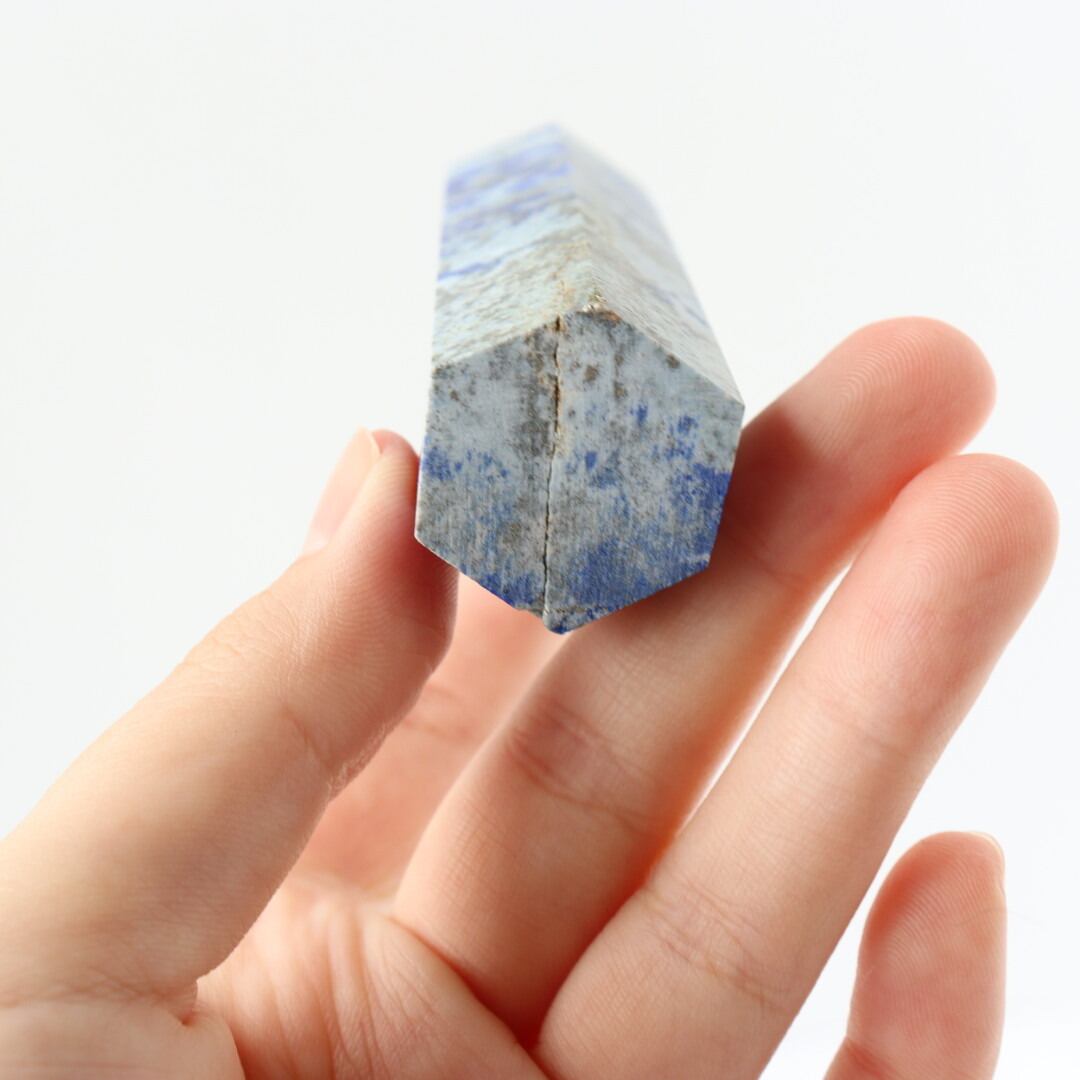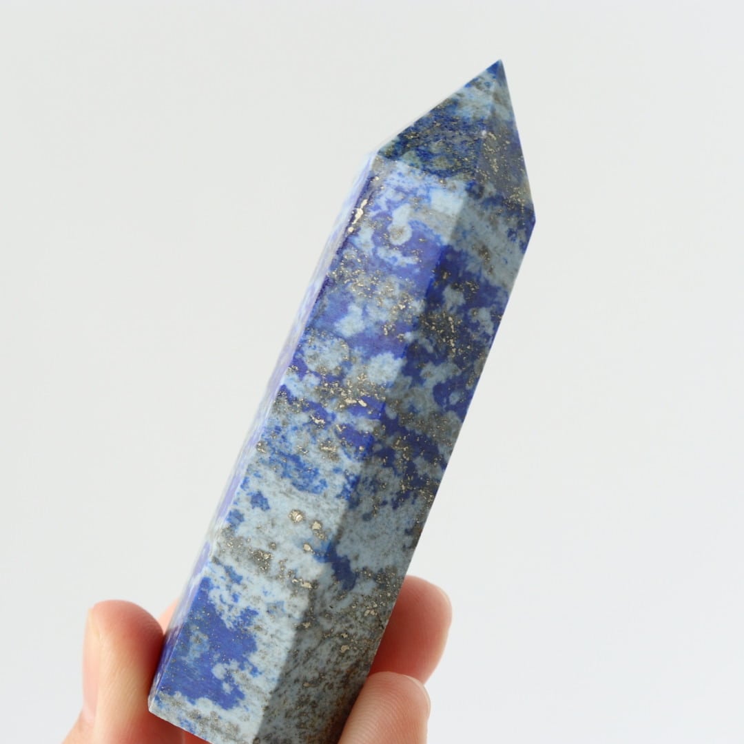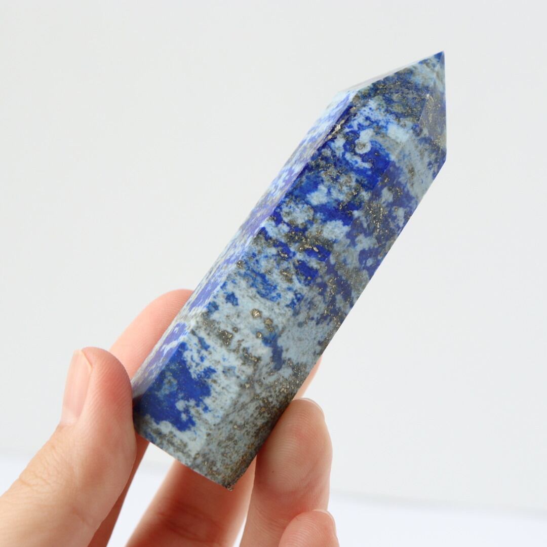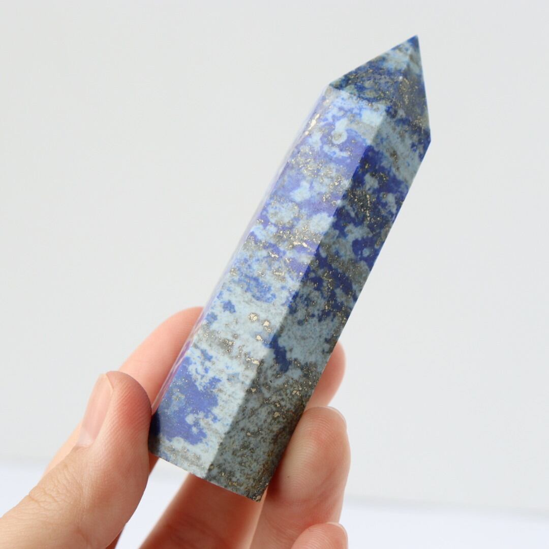 こちらは、濃い青色の中にホワイトのソーダライトとゴールドのパイライトがインクルージョンし、雲のある星空のような模様が描き出されたタワー。