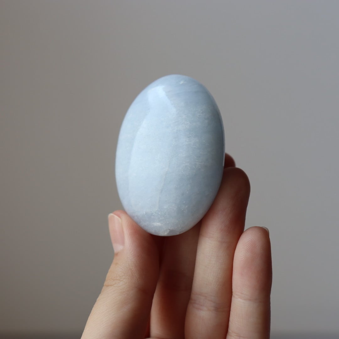 ふんわりとひろがる雲を閉じ込めたような、淡いブルーのブルーカルサイトの握り石。