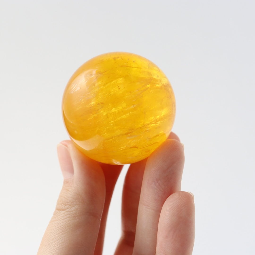 こちらは太陽のような明るいイエローゴールドカラーのフローライトスフィア。