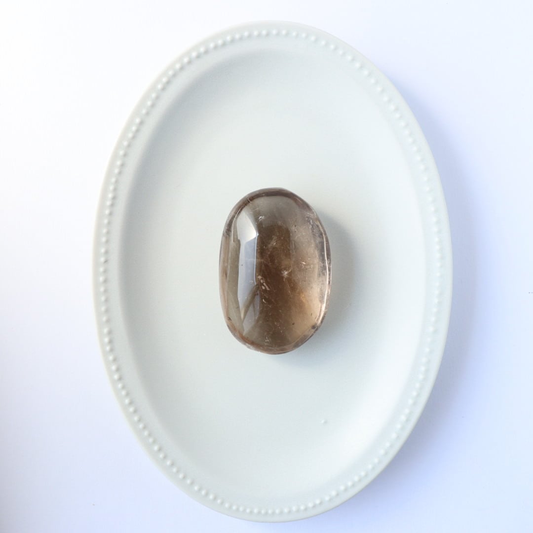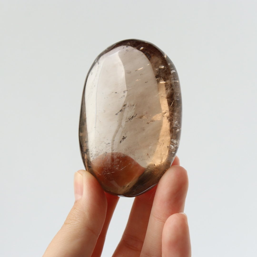 こちらは非常に高い透明度をもつスモーキークォーツの握り石。