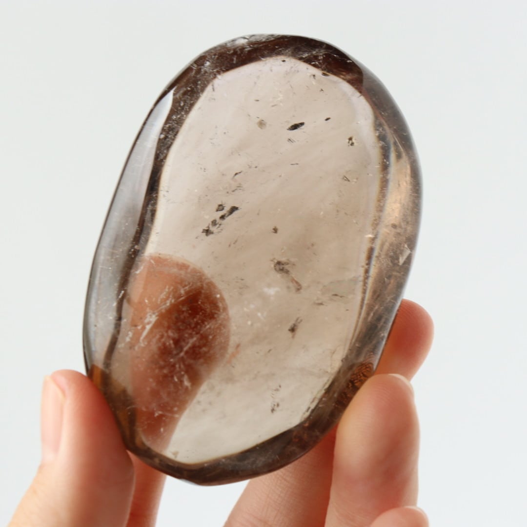 透明感と内包の美しさを存分に味わえる、ハイクオリティなスモーキークォーツの大きな握り石です。